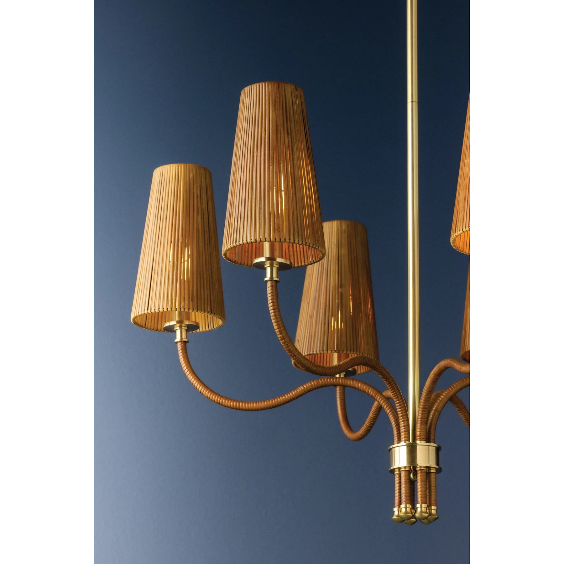 The Atwood 6 Light Chandelier pays homage to the sinuous creations of Finnish designer Paavo Tynell, using natural materials to form a striking branch-like silhouette. Elongated arms and tapered shades are wrapped in a woven skin, creating an earthy, global statement. The central rod and accents lend a luxurious feel, making this a sophisticated piece designed to be layered throughout the home.