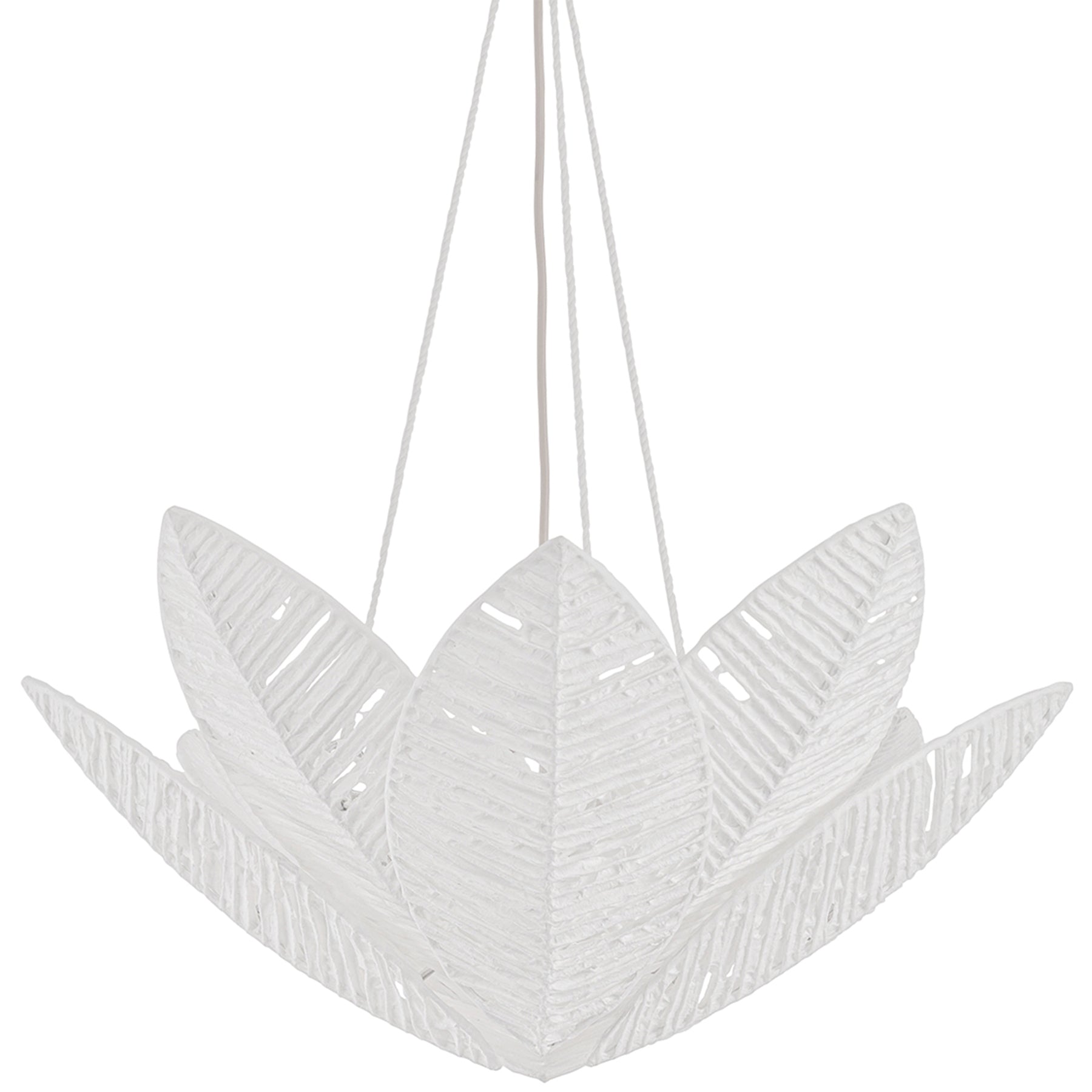 The Azores Chandelier is inspired by the serene, natural beauty of its namesake islands, characterized by a botanical silhouette handmade from delicate paper. Recalling the shape of a magnolia flower, each petal is constructed with detailed veining that allows light to seep through. Suspended from a metallic canopy, this fixture is understated and joyful, perfect for adding a soft, organic touch to bedrooms or living areas.