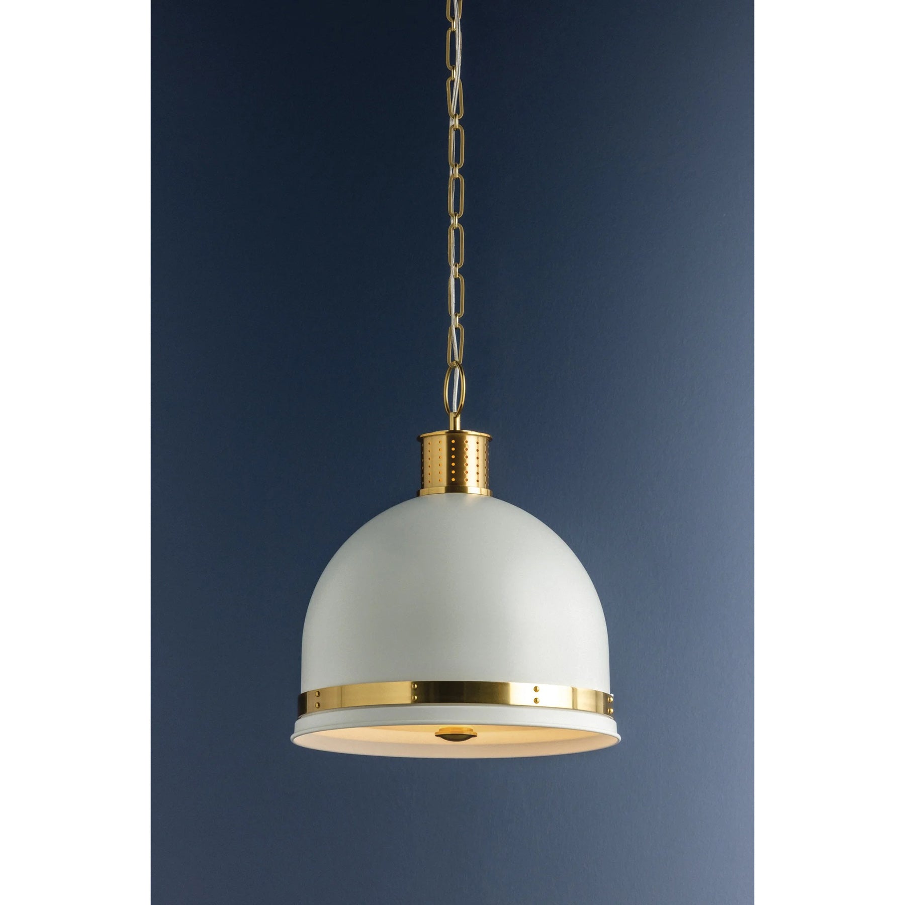 The Briscoe Pendant updates a modern RLM silhouette with edgy details and a bright finish. Painted in a matte hue with a glass bottom diffuser, the dome shade is suspended by a chain, decorative band, and hardware. Machine-cut perforations and studs add a bold accent to the design. Available in two sizes, this versatile staple energizes kitchens, dining spaces, and entryways.