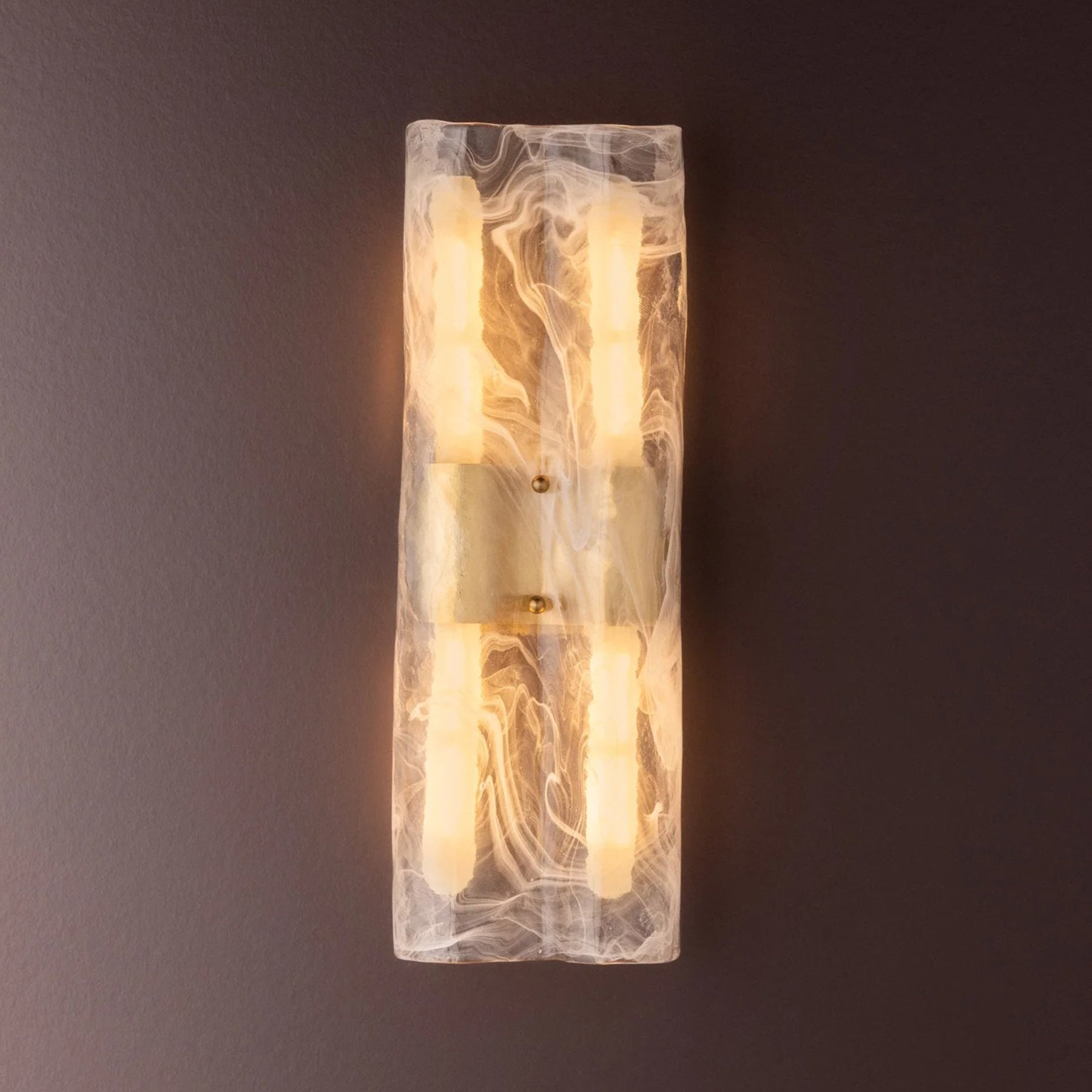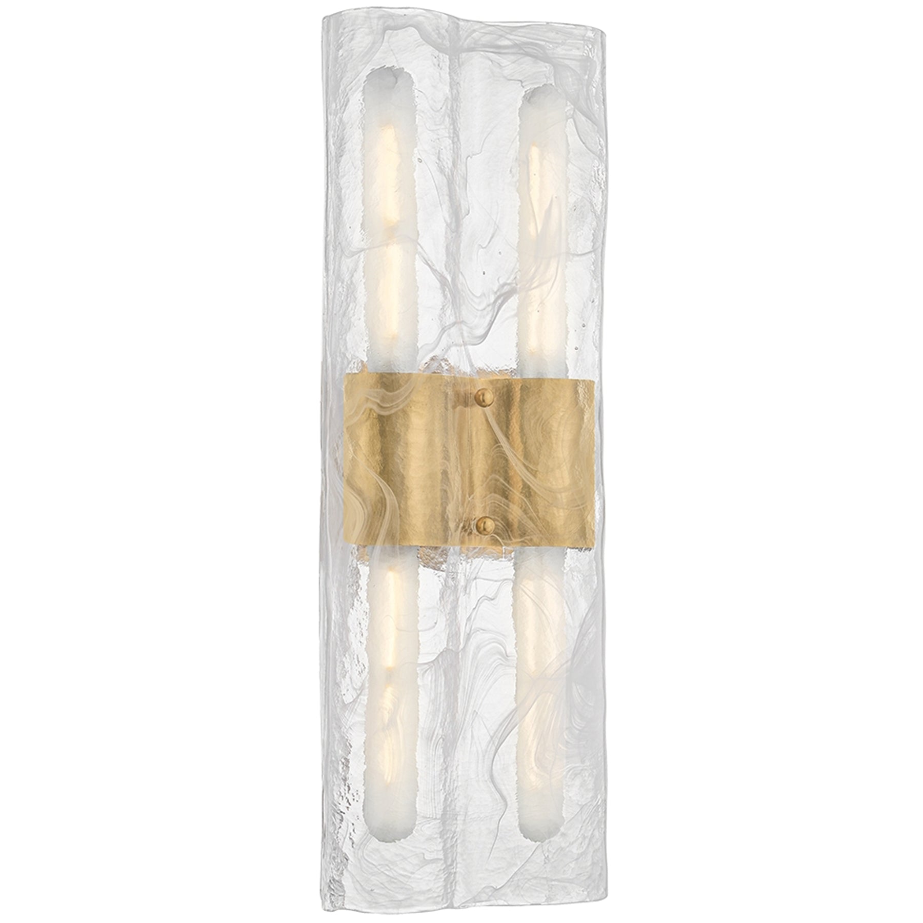 The Bromo Wall Sconce combines organic shaping, specialty glass, and a subtle peek of metal for an enigmatic silhouette. The tubular shade swirls with wispy white tendrils that evoke the natural movement of smoke. Glimpses of the hardware finish shine through the glass like a hidden treasure, adding an artful glint to this wall light, making it a dramatic, vertical accent for hallways or bathrooms.