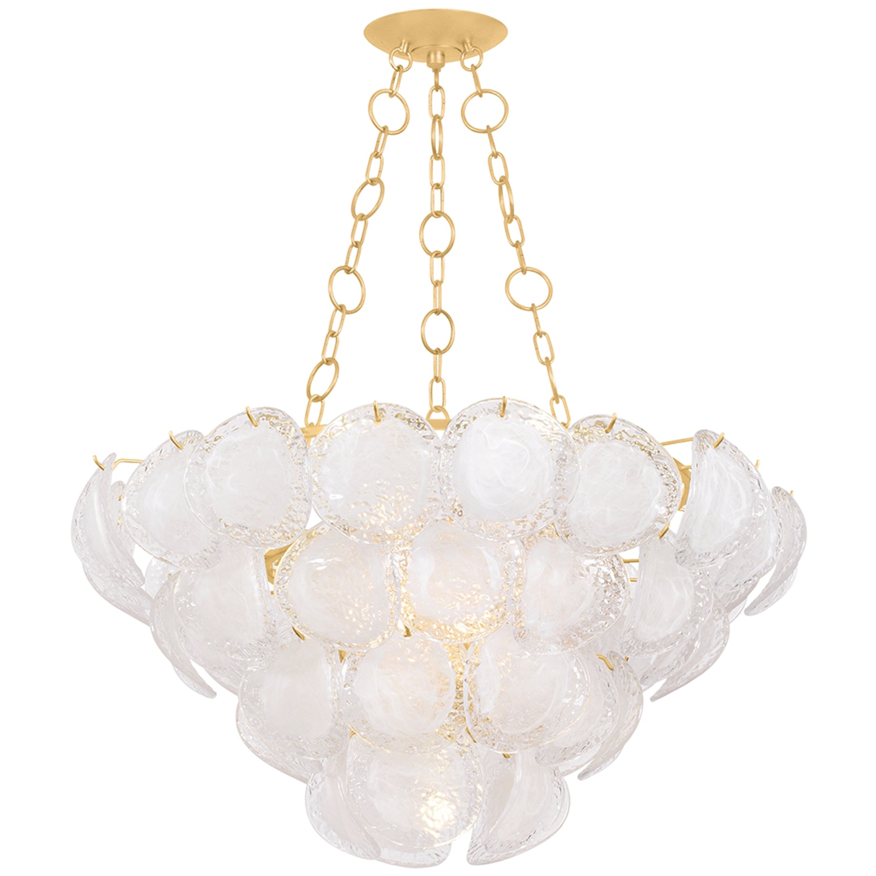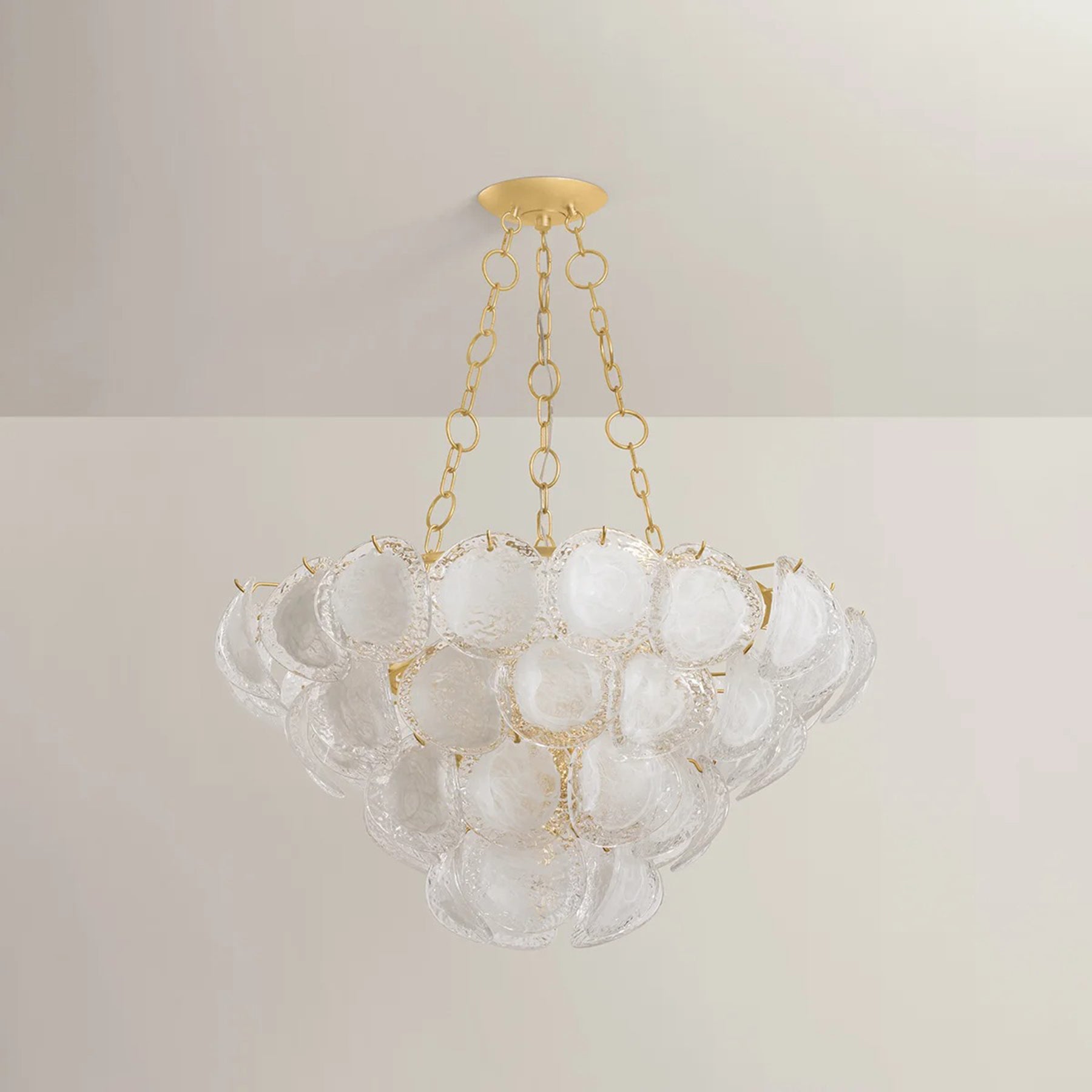 The Cedar Hill 9 Light Chandelier is a celebration of maximalism, presented as a whimsical tiered showpiece composed of painterly glass panels. Each panel curls slightly outwards, adding volume and dynamic movement to the composition. The silhouette recalls a cluster of grapes or a blooming rose. This large, lustrous fixture makes a dazzling statement in grand dining rooms or entryways.
