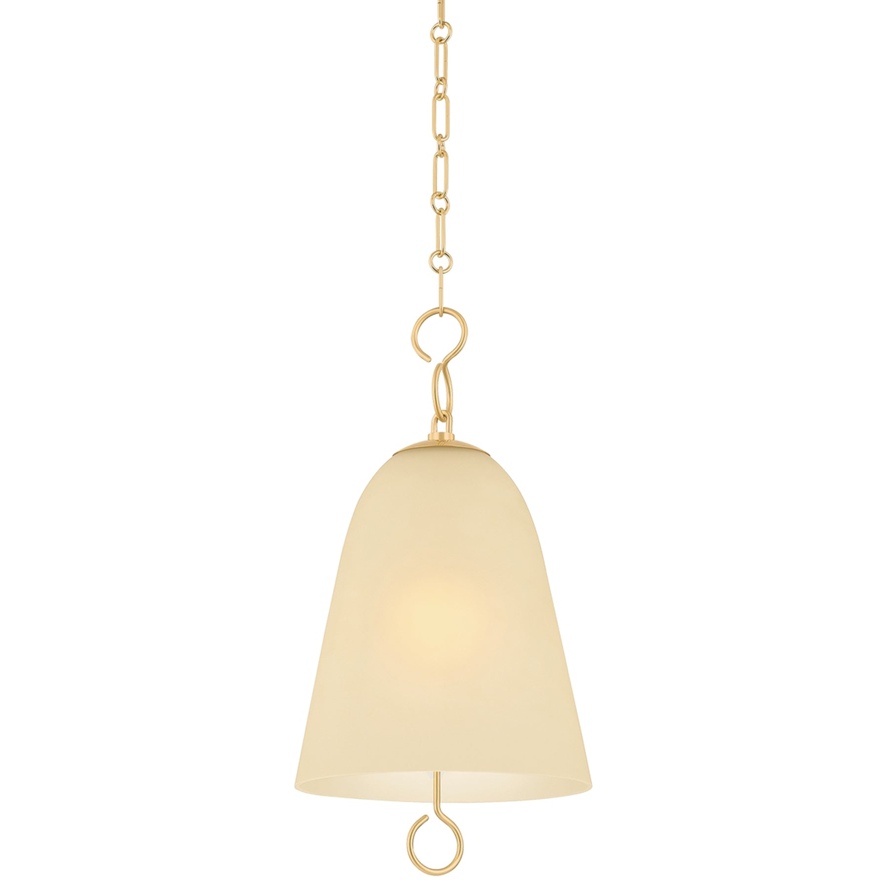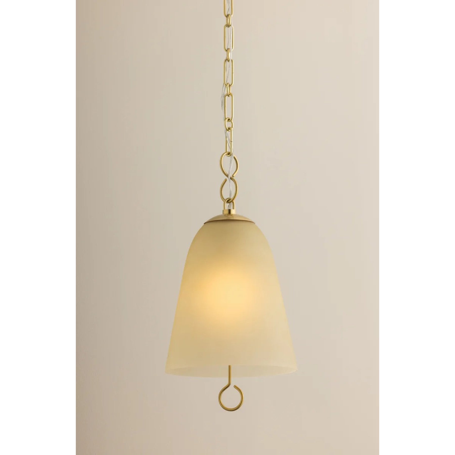 The Christine Pendant acts like modern jewelry for a room, pairing subtle glass treatments with unusual looped chain details. The warmth of the etched shade works in tandem with the curved form to create a gentle diffusion of light. Welded ring details shine above and below the glass, adding a decorative touch to the earring-like silhouette. This fixture can be used solo or in multiples to create a welcoming mood in dining areas or entryways.