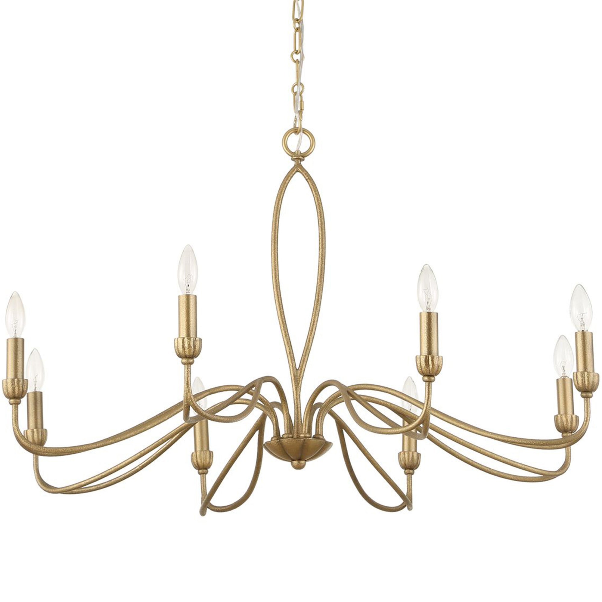 The Corella 8 Light Chandelier blends timeless elegance with a refined modern touch. Its marquise-shaped petal arms and matching center column create a graceful silhouette that enhances both traditional and transitional interiors. Finished in a soft gold tone, this chandelier brings a warm glow to dining rooms, entryways, or living spaces. It includes a 20-foot wire and a 7-foot decorative link chain, allowing for adjustable installation heights. Designed to make a statement while maintaining classic appeal, this fixture is ideal for those seeking understated sophistication.