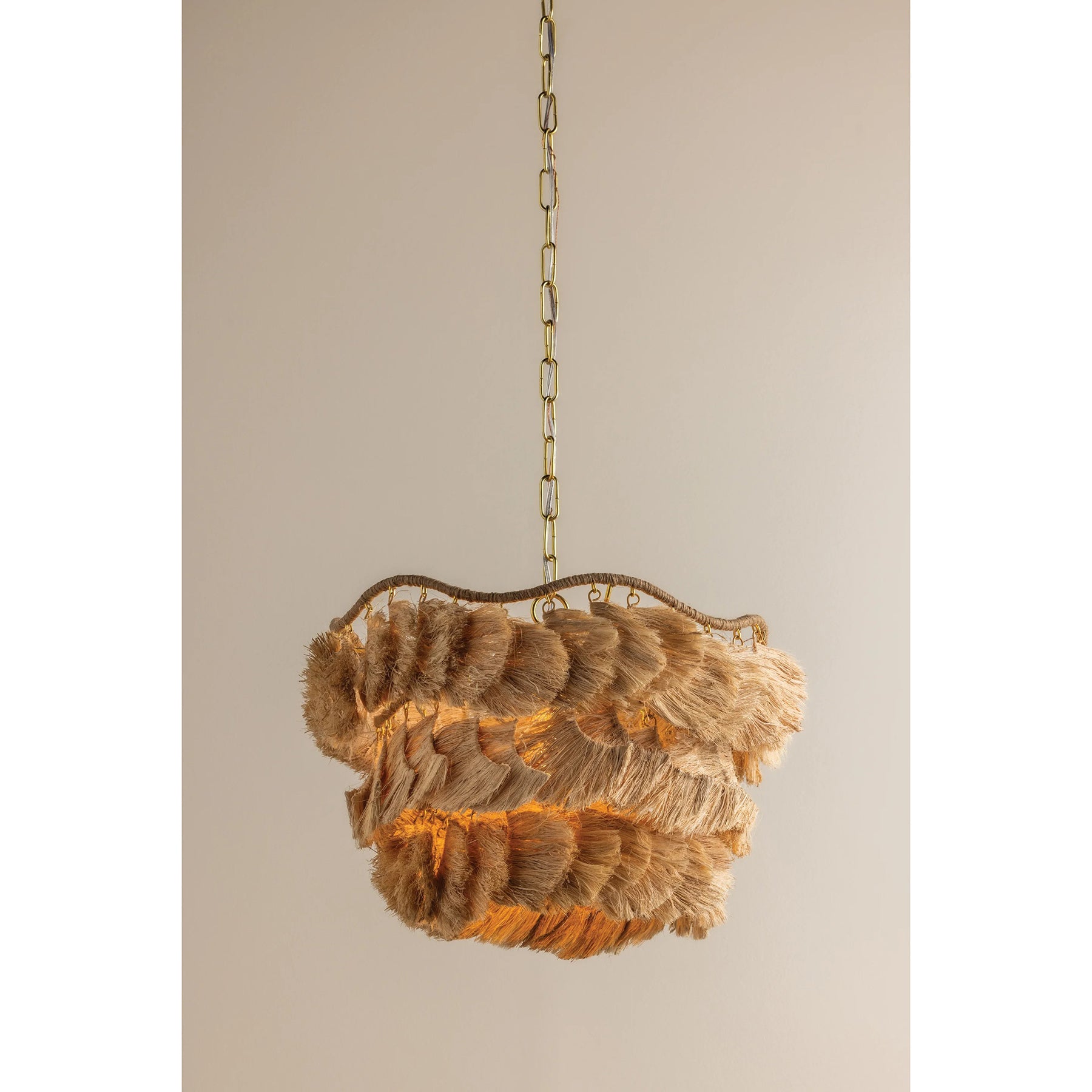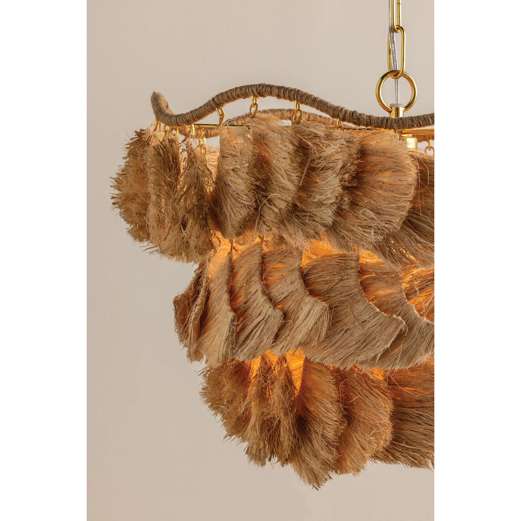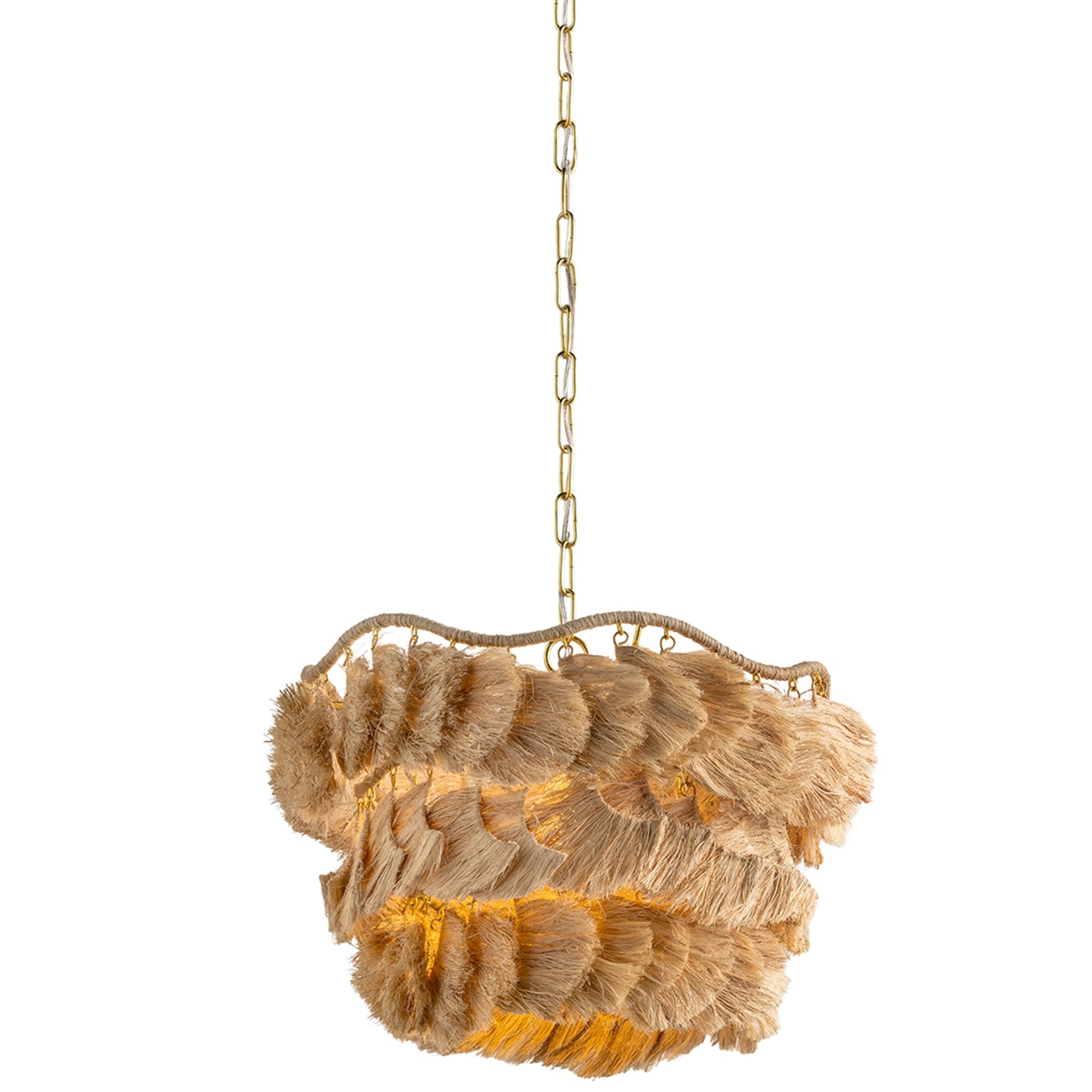 The Daria 20" Chandelier makes a strong case for craftsmanship, finding ease in a complex composition. The frame is exposed at the top, celebrating the suspension of each separate piece of the shade. Soft, flowing strands of natural fiber create wave-like, layered textures that face different directions to achieve a dramatic, shaggy silhouette. This fiber art-inspired beauty lends a polished touch to dining rooms or entryways.