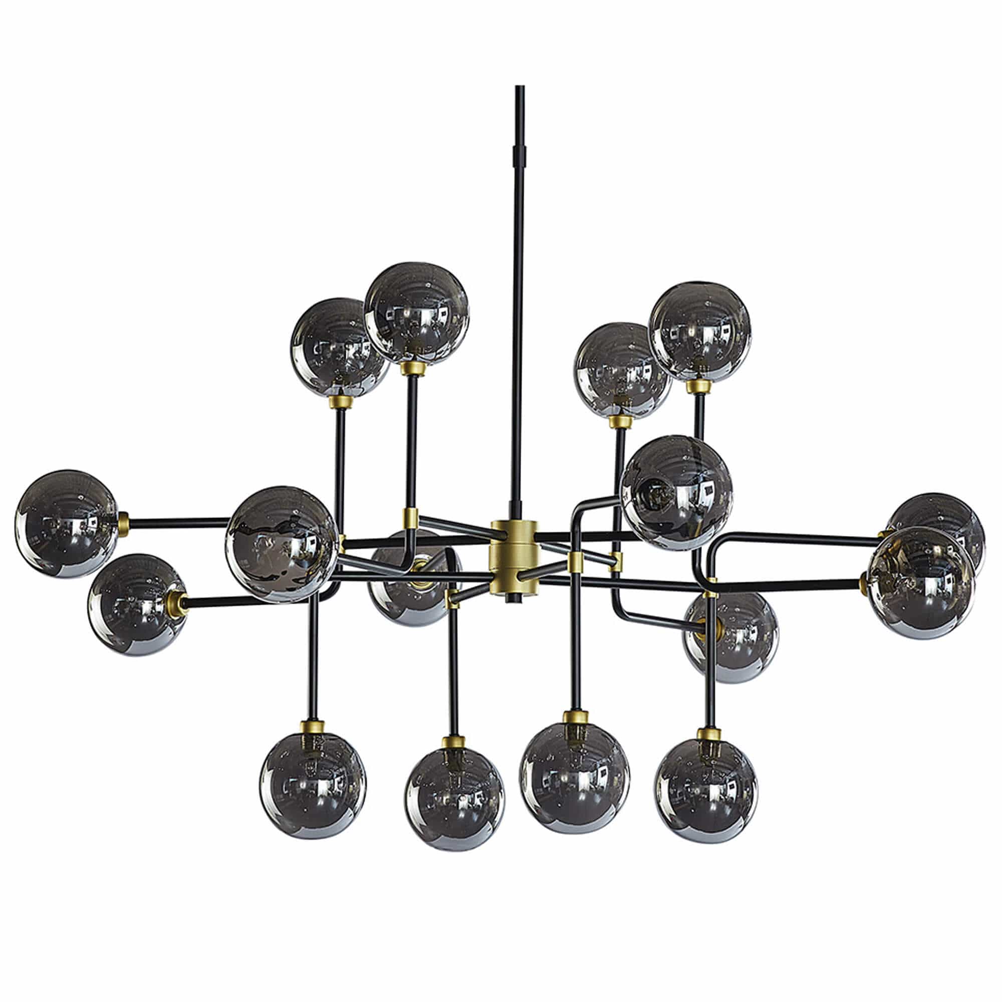 This modern ceiling light will create an alluring environment in living, lounge and dining spaces. Features black iron rods with gold hardware with smoke grey glass. Install multiples for a dramatic look.