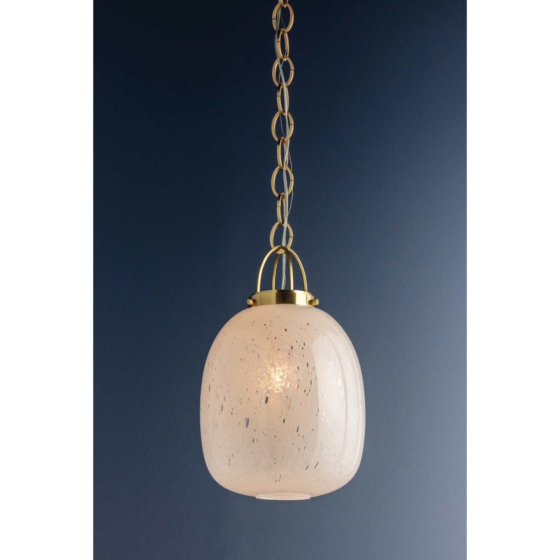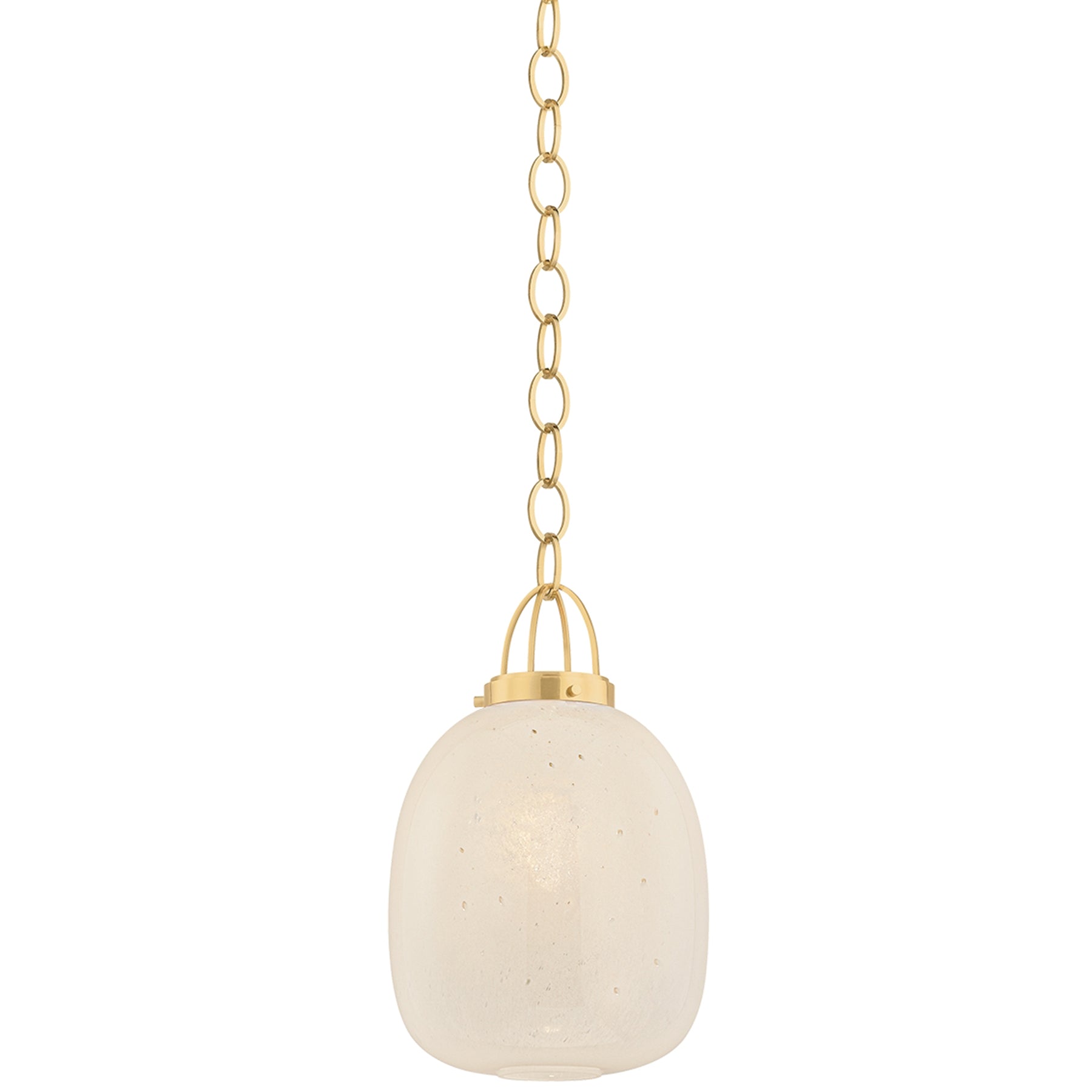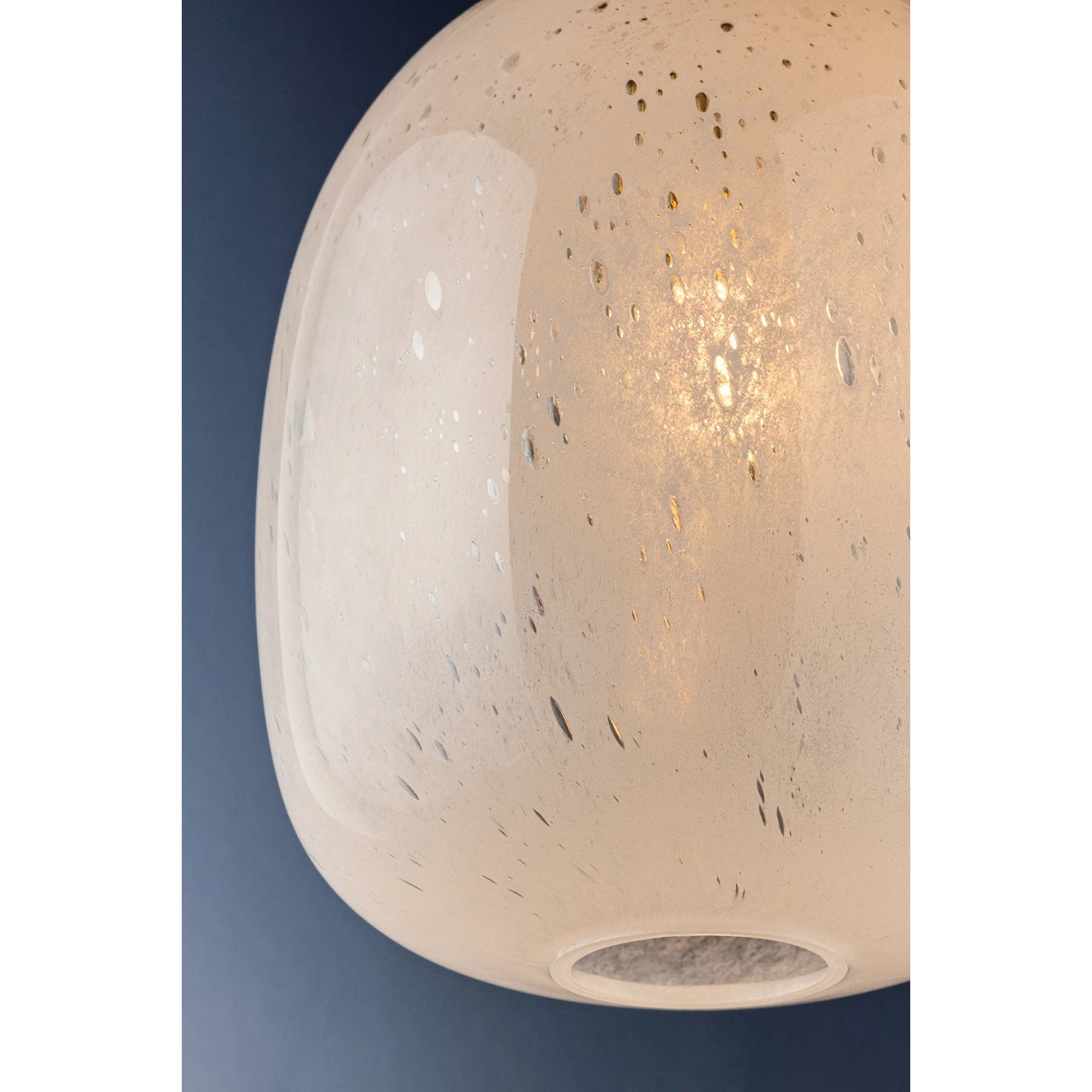 The Enosburg Pendant pairs a soft organic shape with novelty metalwork to create a compelling focal point. An oblong shade is supported by a cage-like suspension and chain, creating a harmonious balance between structure and fluidity. The bubbling of the glass attracts the eye with its subtle, energetic texture. Available in two sizes, this fixture makes a statement over a dining table or when grouped above a kitchen island.