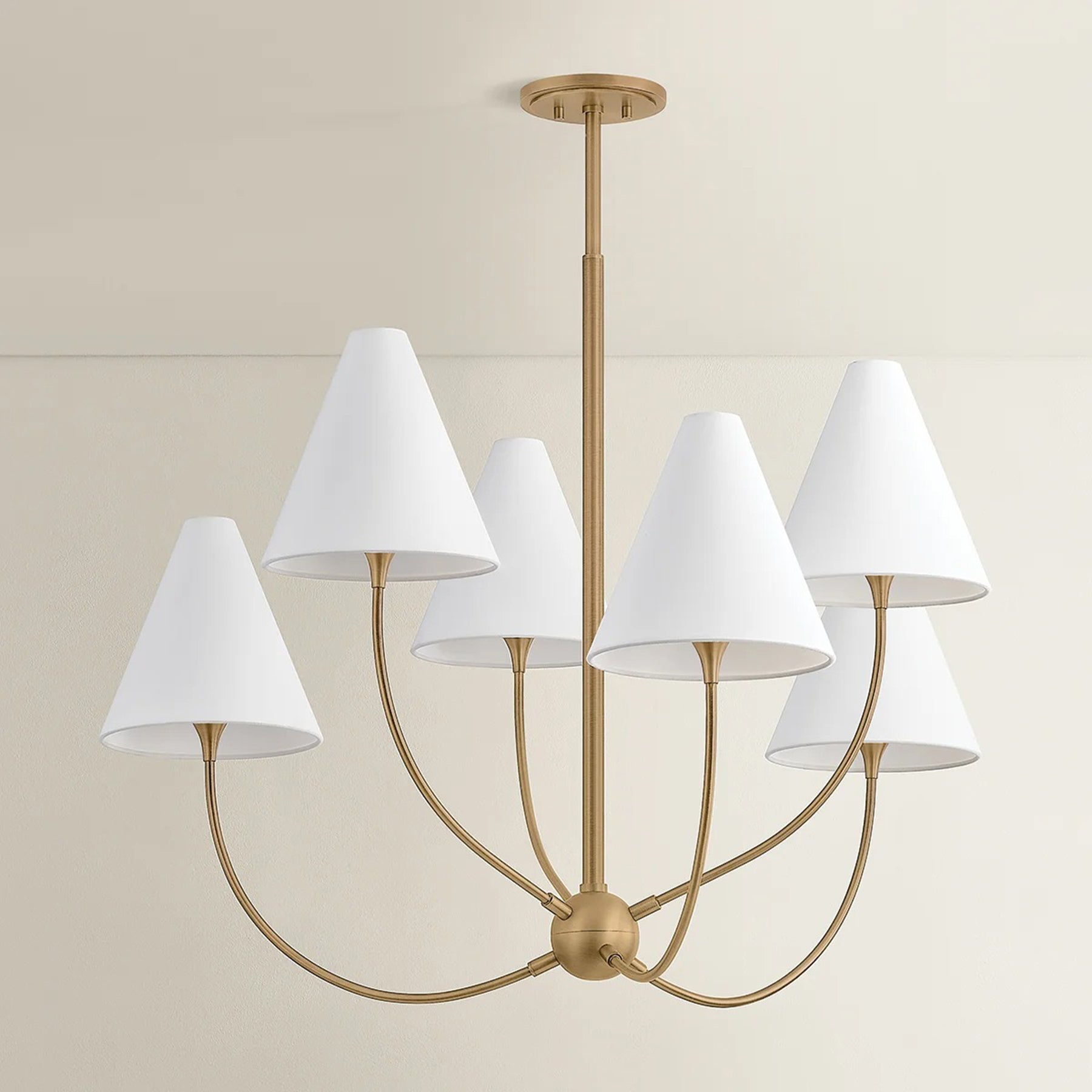 The Evermore 6 Light Chandelier is a nature-inspired take on timeless silhouettes, defined by its airy, voluminous shape and graceful arcing arms. The fixture appears to reach upward—evoking the gentle growth of wild mushrooms. Petite fabric shades crown each arm. This piece is a sculptural lighting fantasy for the modern home, adding warmth and vintage polish to gathering spaces.
