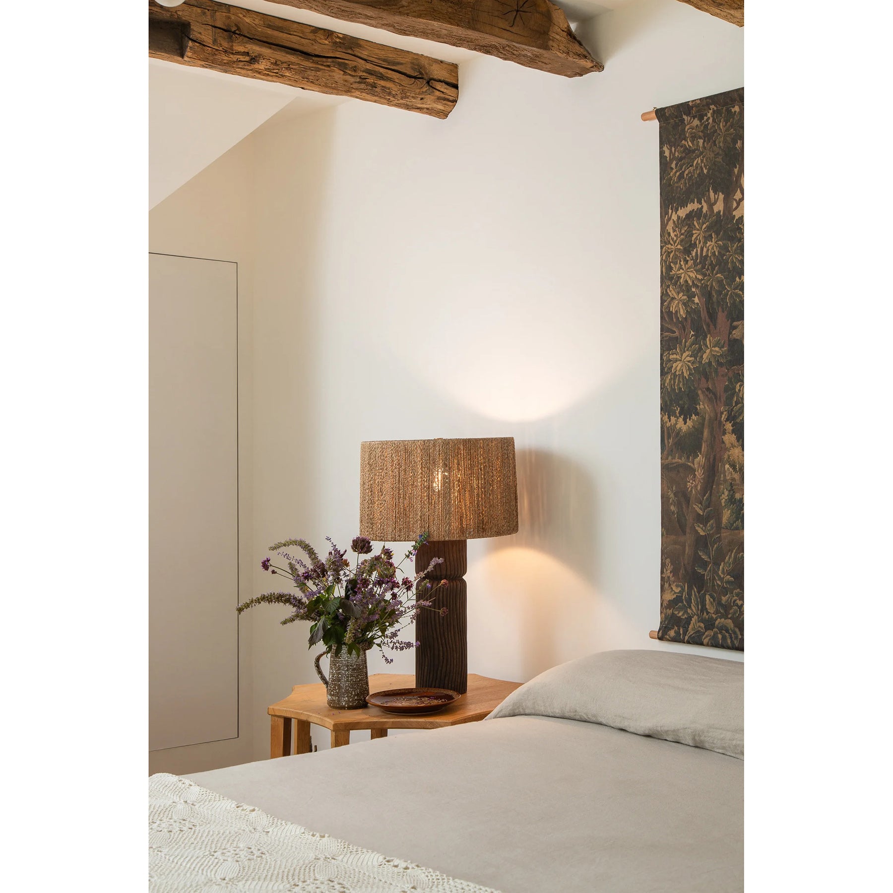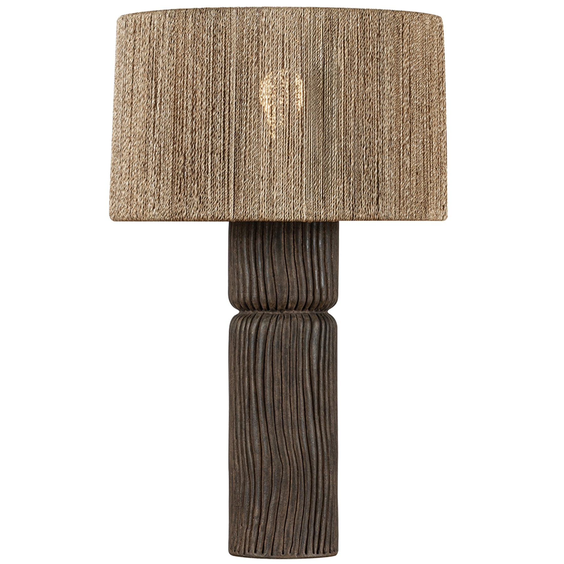 The Folk Table Lamp celebrates natural texture and form, pairing an earthy ceramic base with a handwoven string shade. Raked grooves along the cylindrical base echo the shade’s flowing strands, creating sculptural harmony and vertical movement. Subtle hardware adds a touch of refinement to this richly layered design, making it an elegant addition to a side table or console.