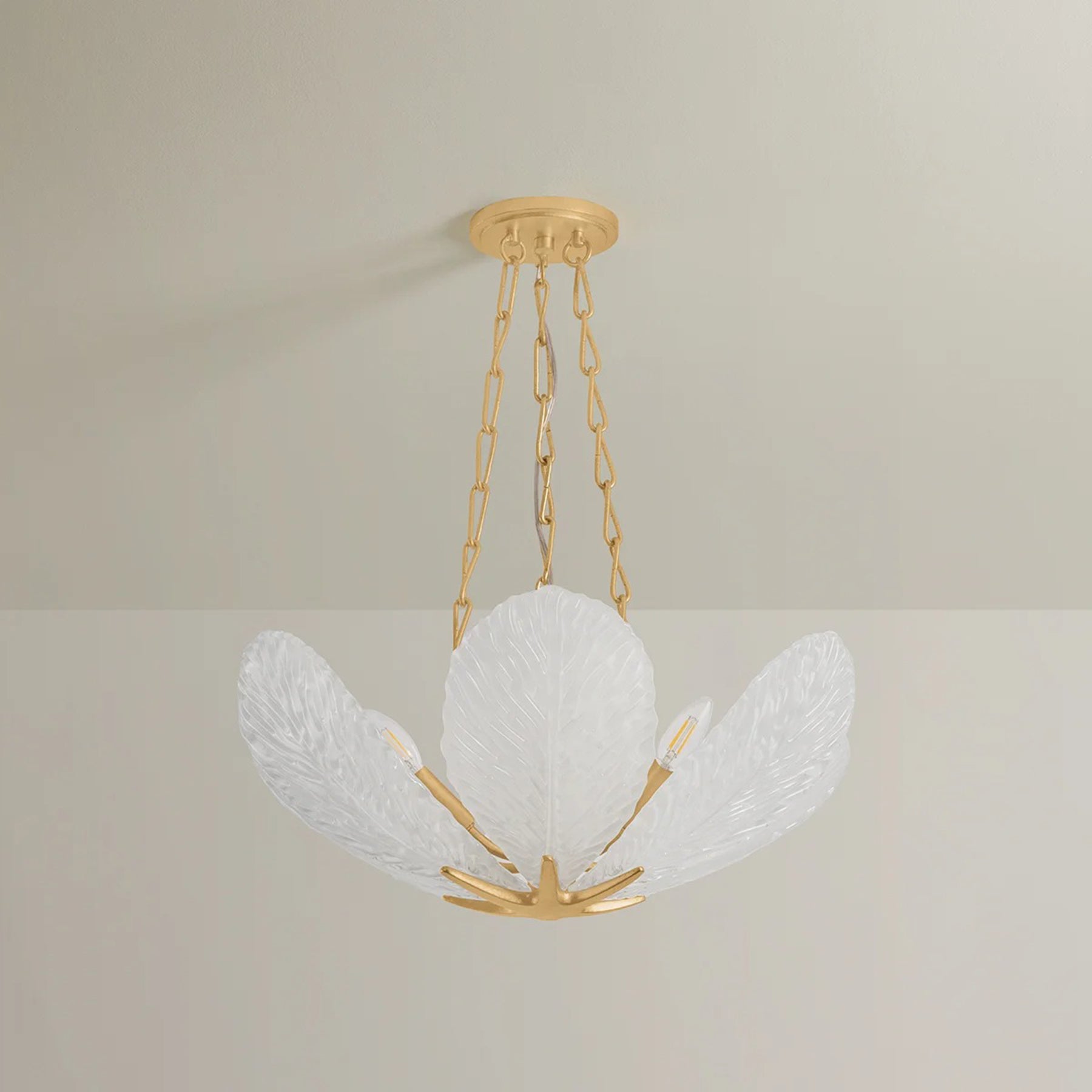 The Galena 6 Light Chandelier is boldly botanical, characterized by a bowl-shaped silhouette with a central candelabra cluster. Each glass petal is etched with vein-like detailing that adds to the sense of realism. A sculpted metal sepal gathers the petals, coordinating with the suspension. This piece offers a bright, joyous ambiance above a dining table or in a central living space.