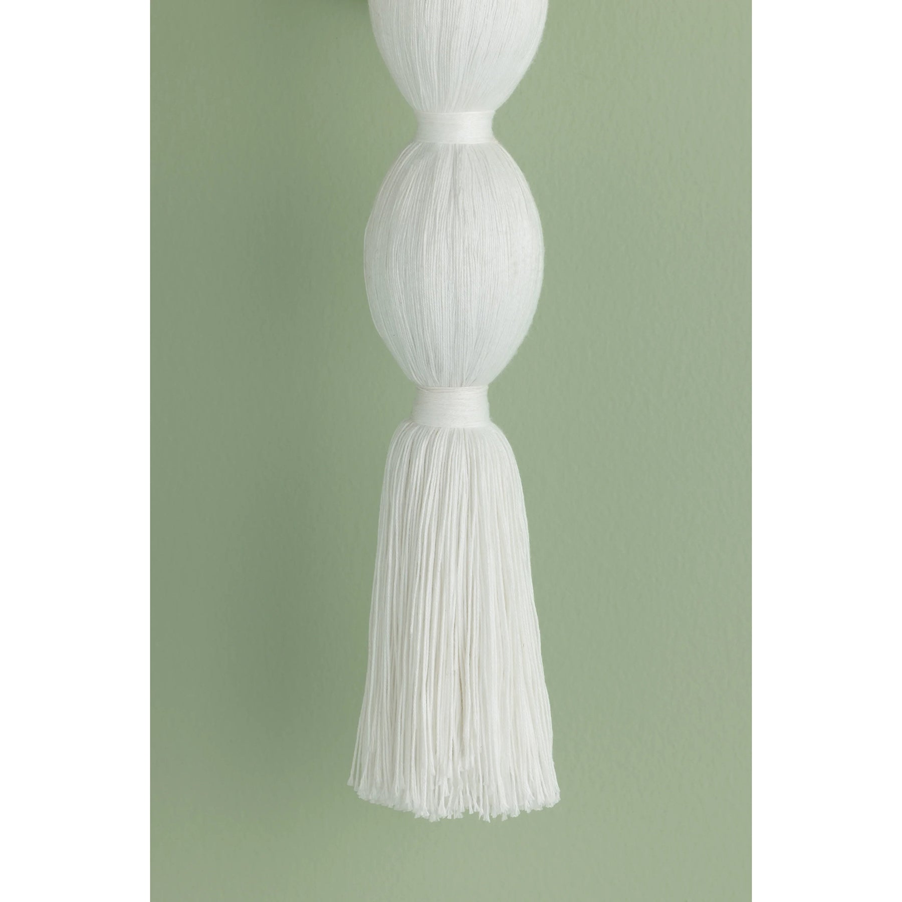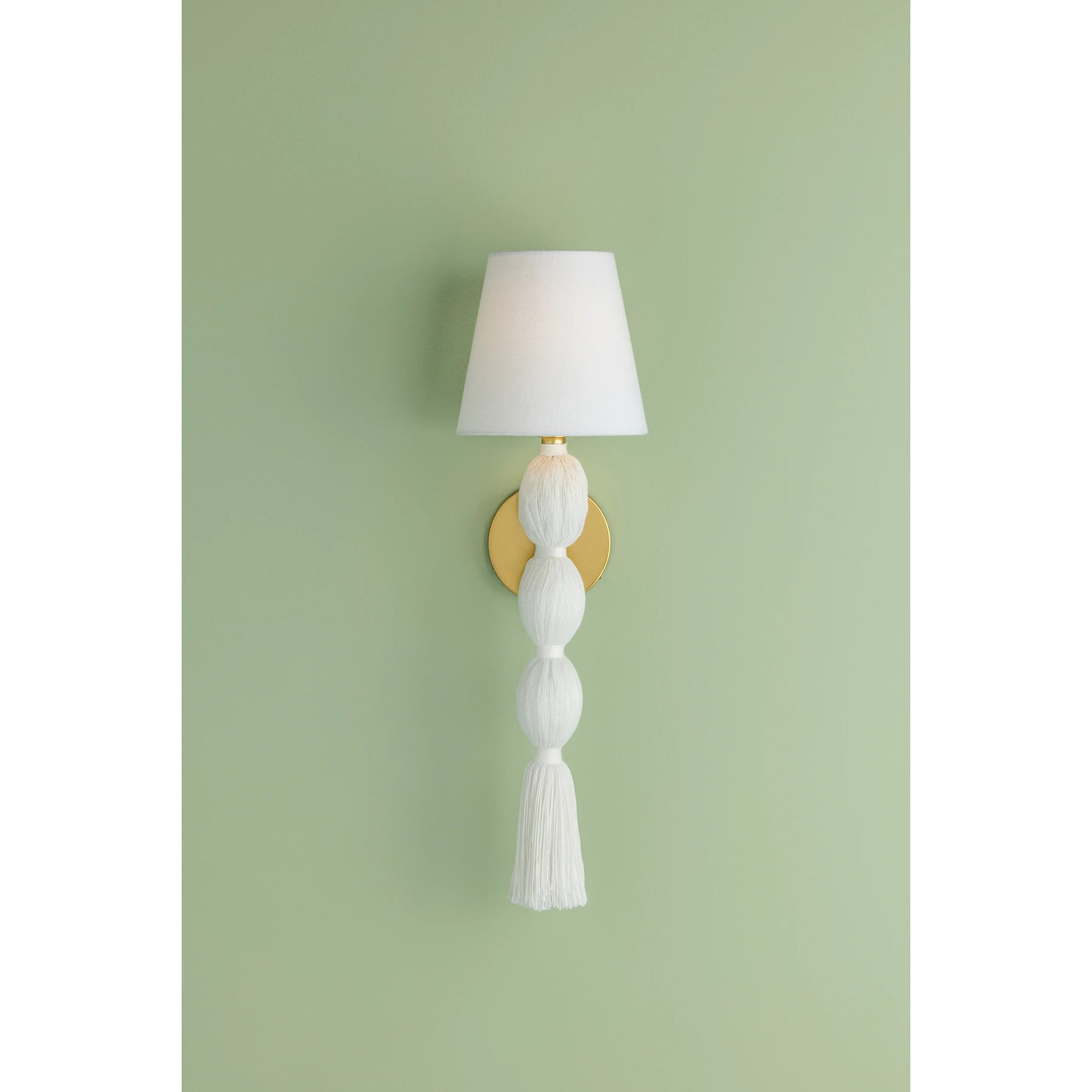 The Indra Wall Sconce is a celebration of authentic handicraft, featuring an elongated, cinched silhouette that resembles a tassel. The string and fabric shade create an all-over light, fresh appearance, accented by subtle hardware at the neck. This single-light fixture serves as an artistic piece for small spaces in need of a spruce.