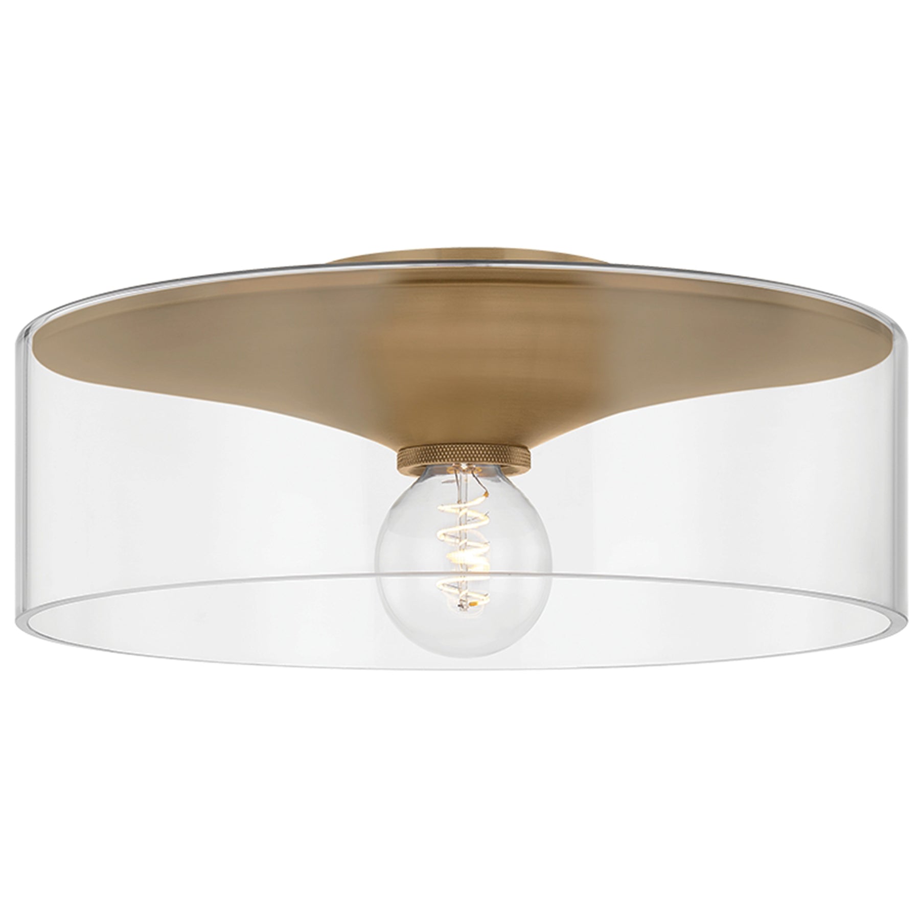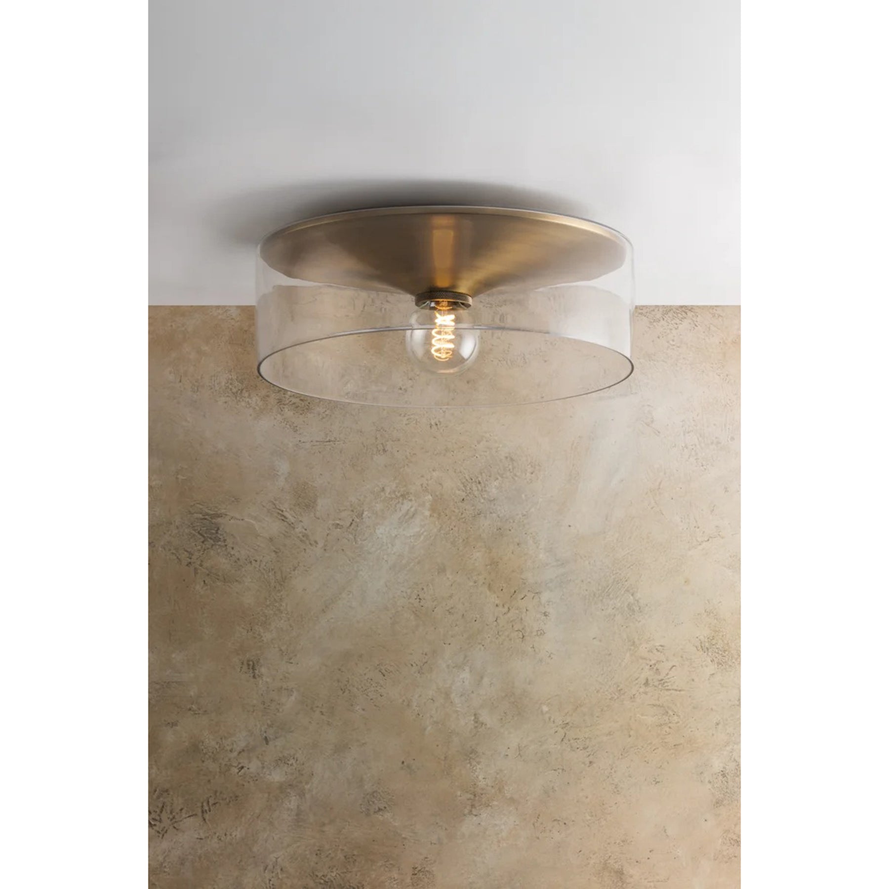 The Killian Flush Mount’s imaginative design is simple yet impactful. An inner funnel-shaped dish is encased by a cylindrical outer glass piece, creating a seamless shade. As a notable detail, a clear bulb emerges from the central gap like a drop of water. The metallic finish adds a soft warmth to this organically-inspired fixture, making it an elegant choice for kitchens or hallways.
