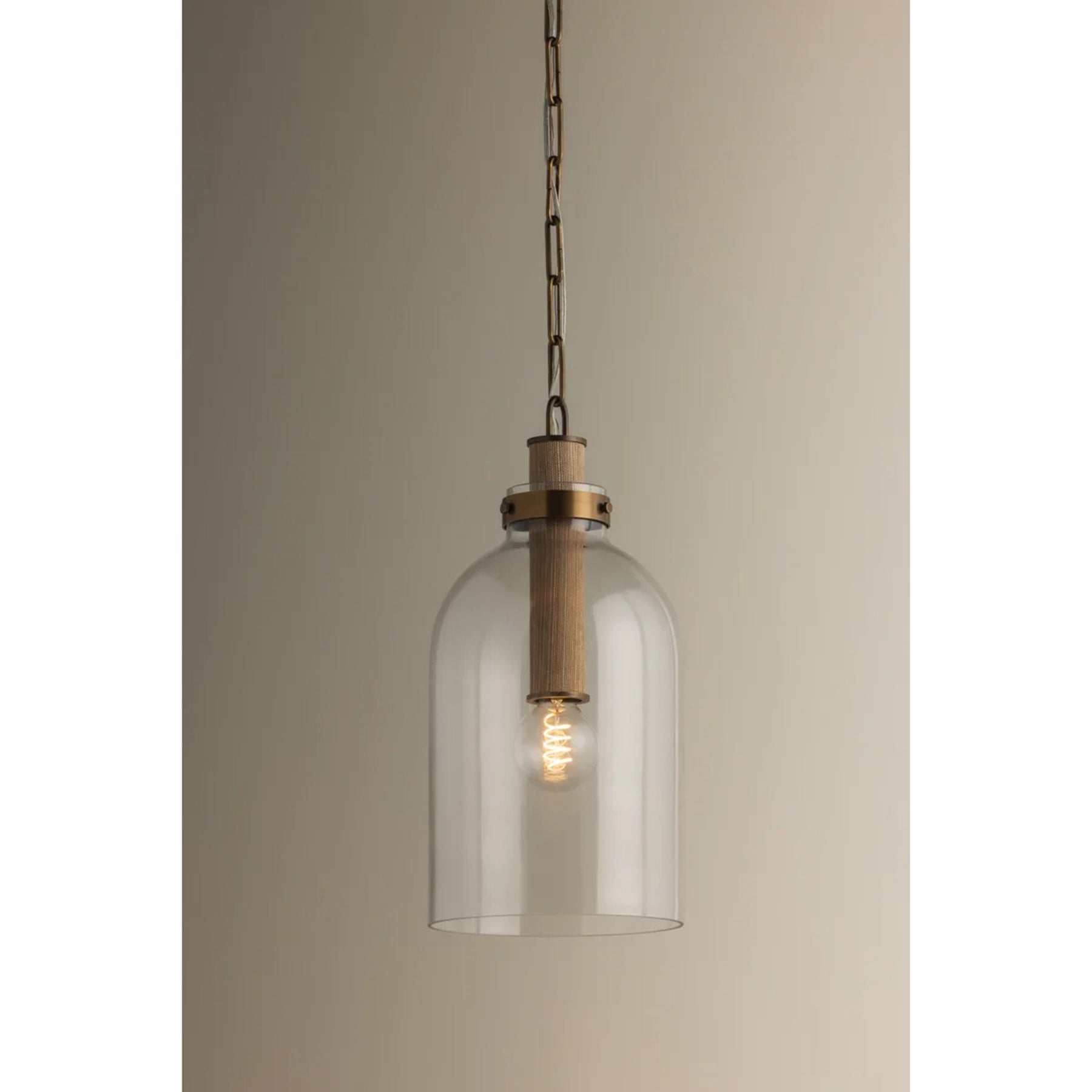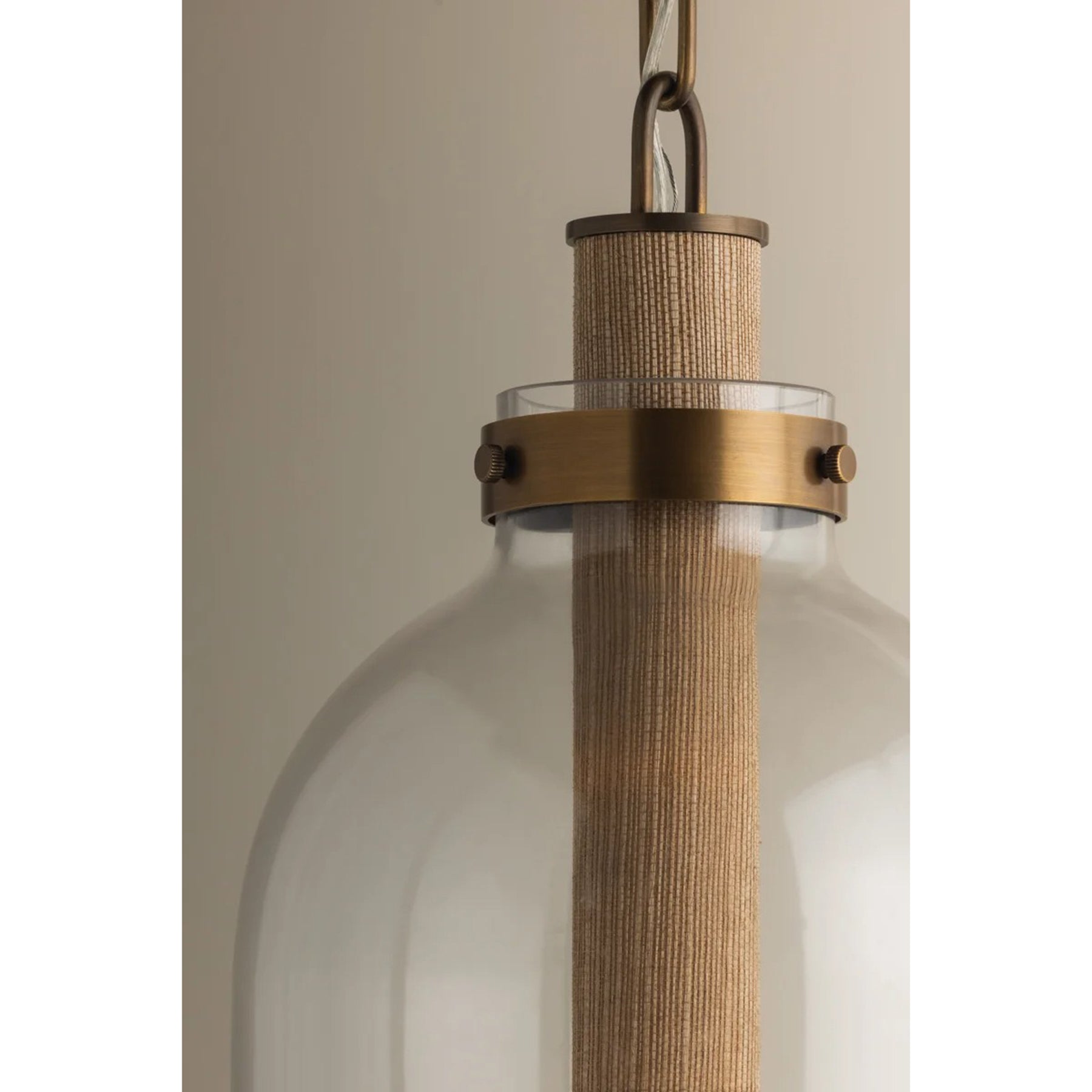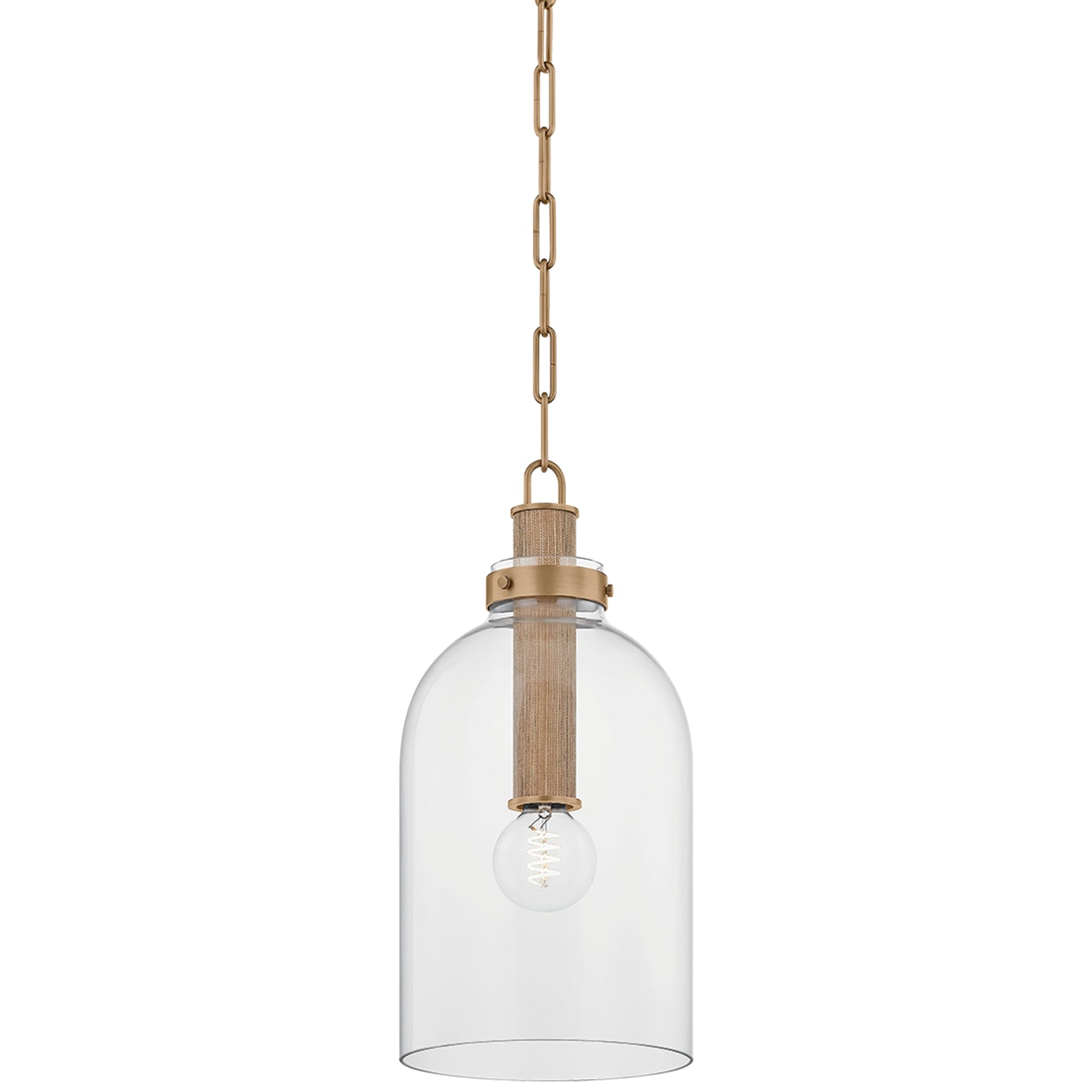 The Kori Pendant follows the vein of Japanese modernism with a minimalist cloche-shaped glass design accented by elevated details. A natural woven tube extends through the center of the clear shade, adding textural interest. Thick metal hardware introduces an industrial edge, while the simplicity of the form allows it to be hung in multiples across various spaces.