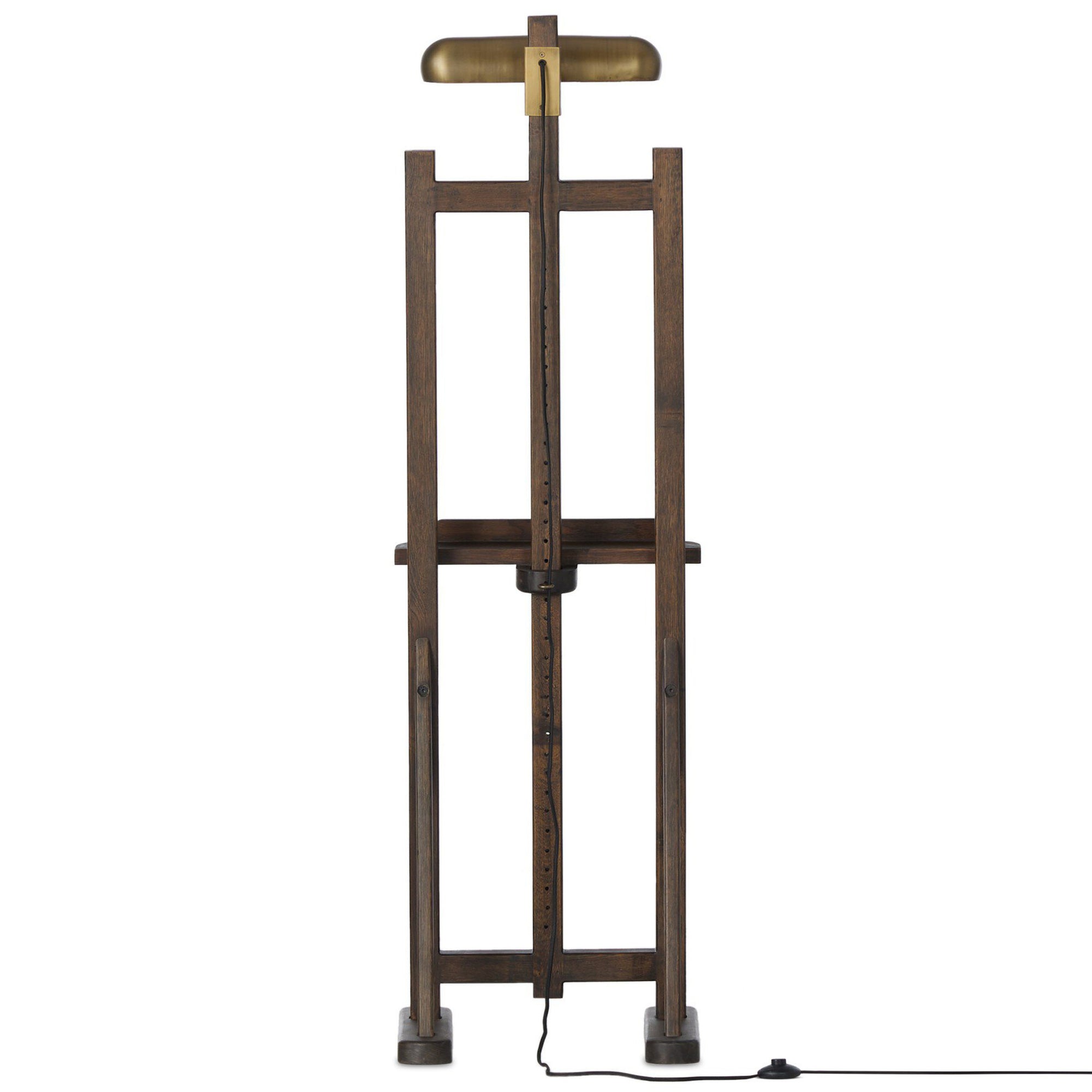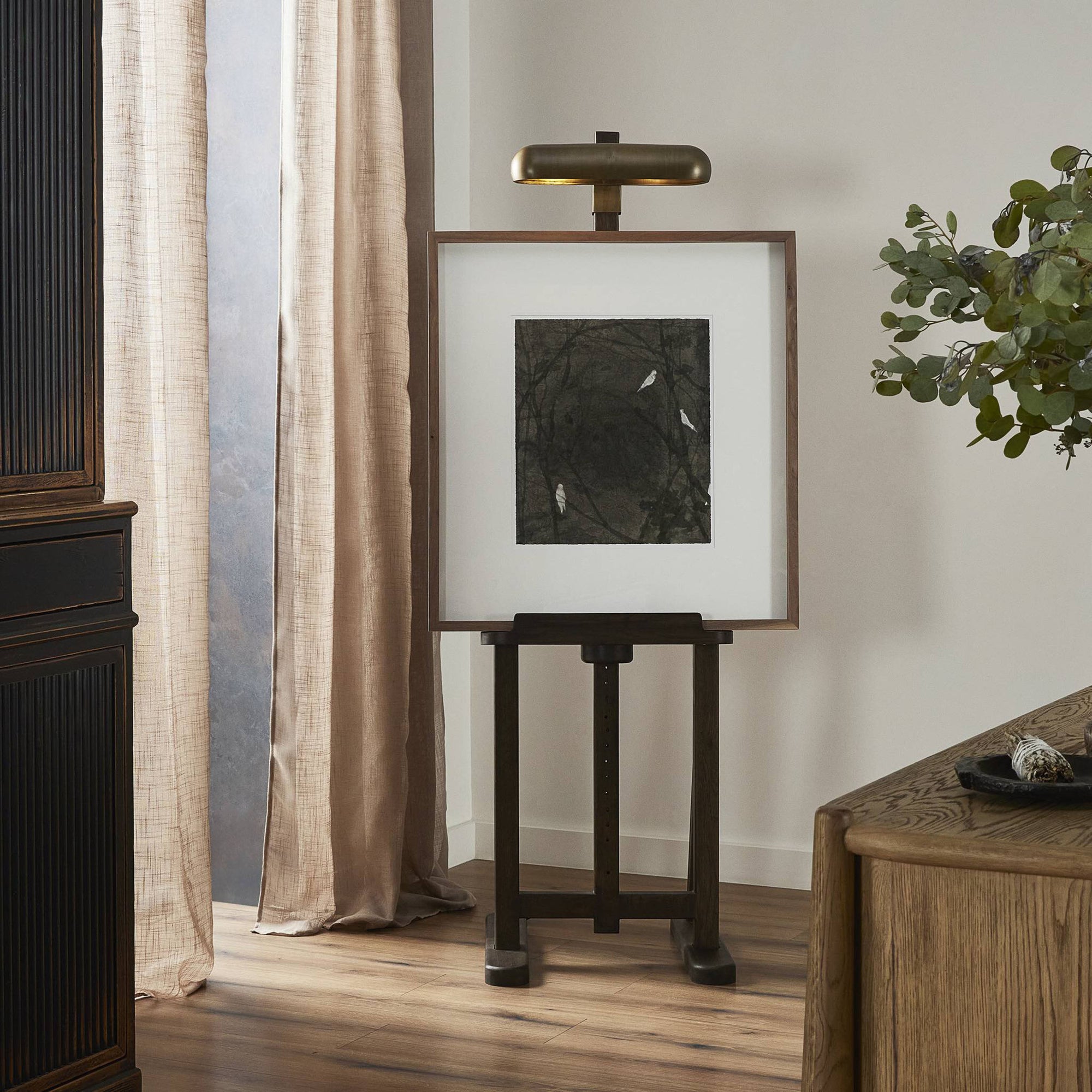 The Lakon Light Art Easel is a functional display piece designed to showcase artwork or framed photography with integrated illumination. An adjustable-height easel supports frames up to 2 inches deep, while a domed accent light at the top provides focused lighting. A tripod-style base offers stability, making this piece ideal for highlighting art on floors in living spaces, studios, or galleries. Part of a design collaboration by Amber Lewis x Four Hands.