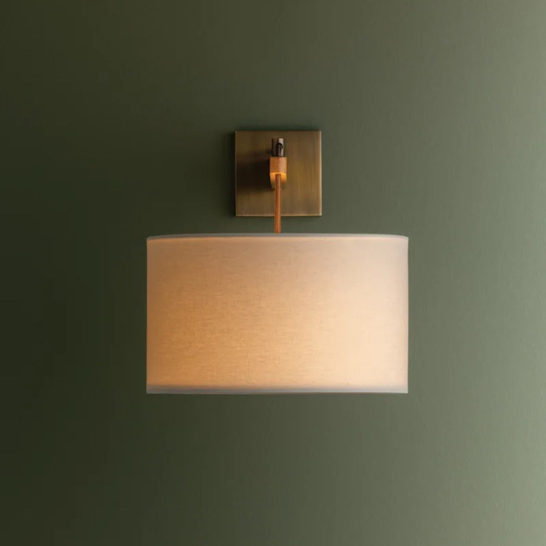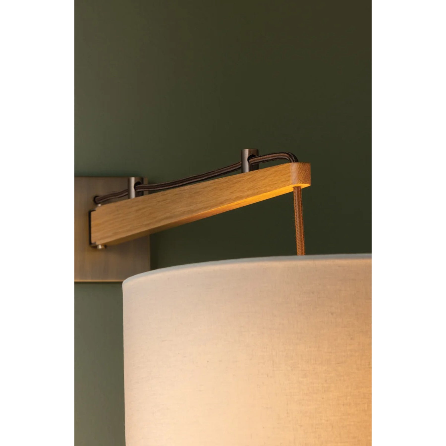The Mailo Wall Sconce features complex woodworking techniques and exposed hardware, inspired by vintage furniture. The oak frame is complemented by metallic accents and a matching cord that runs parallel to the arm. In this 1-light format, the fixture swings from the backplate, making it an ideal, adjustable bedside light. A linen shade adds a finishing note of freshness to the design.