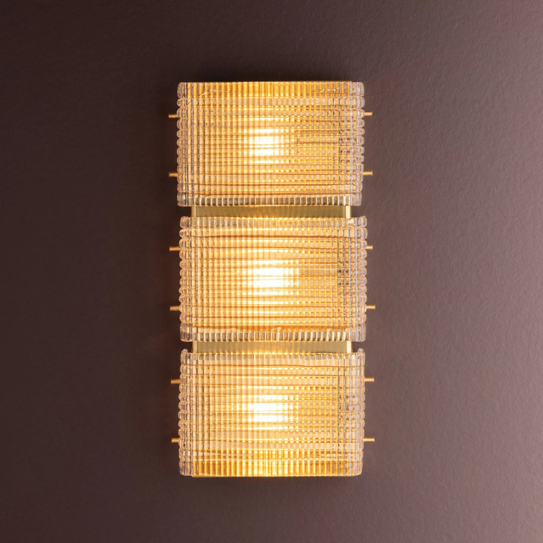 The Mav Medium Wall Sconce puts a contemporary spin on a playful motif, taking inspiration from retro glass blocks. With a shallow profile, the vertically stacked square design is marked by intricate cut crystal details. The highly textured clear piastre glass beautifully reflects and refracts light, creating a striking visual effect when lit.