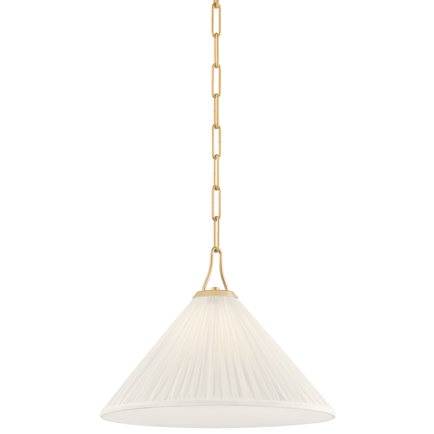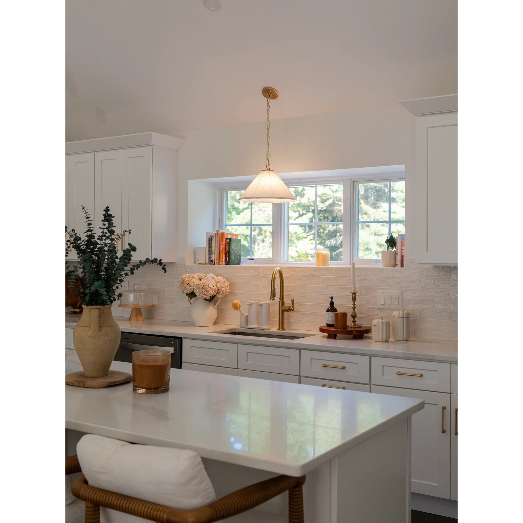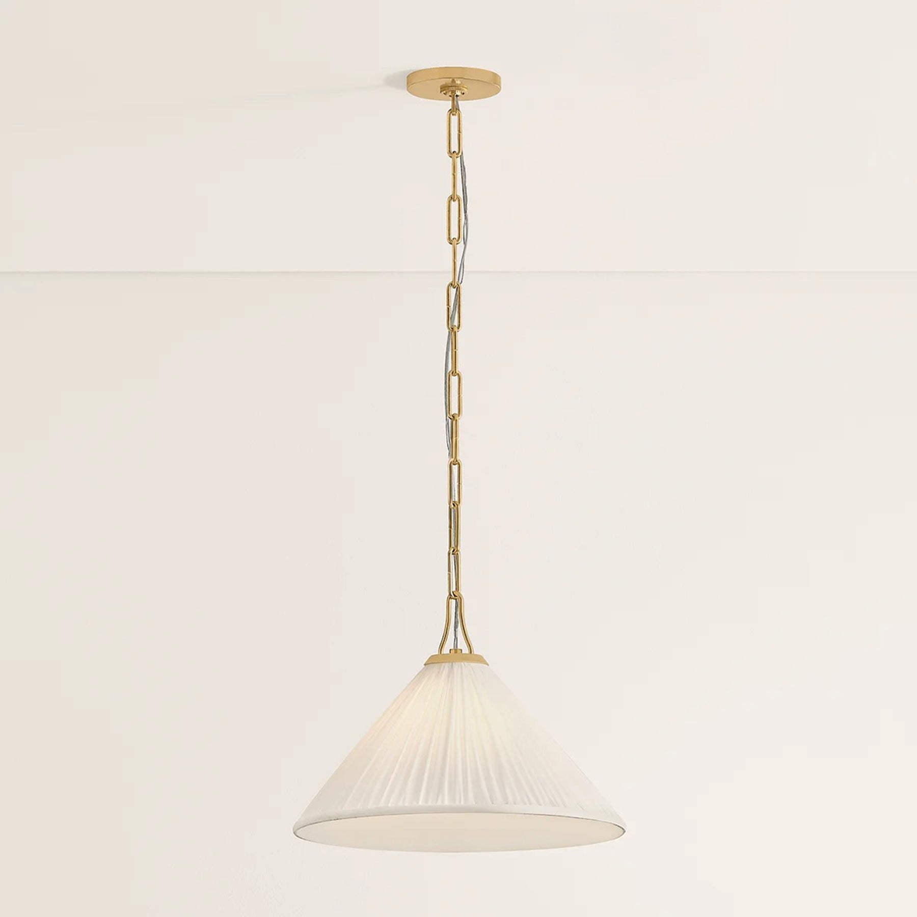 The Merida Pendant is elegant in its simplicity, pairing a pleated faux silk shade with crisp metalwork. A sleek racetrack loop extends from the top of the fixture, its elongated shape seeming to be drawn downward by the weight of the shade. Finished in Aged Brass, this special detail and classic chain add a clean modern touch to the design.