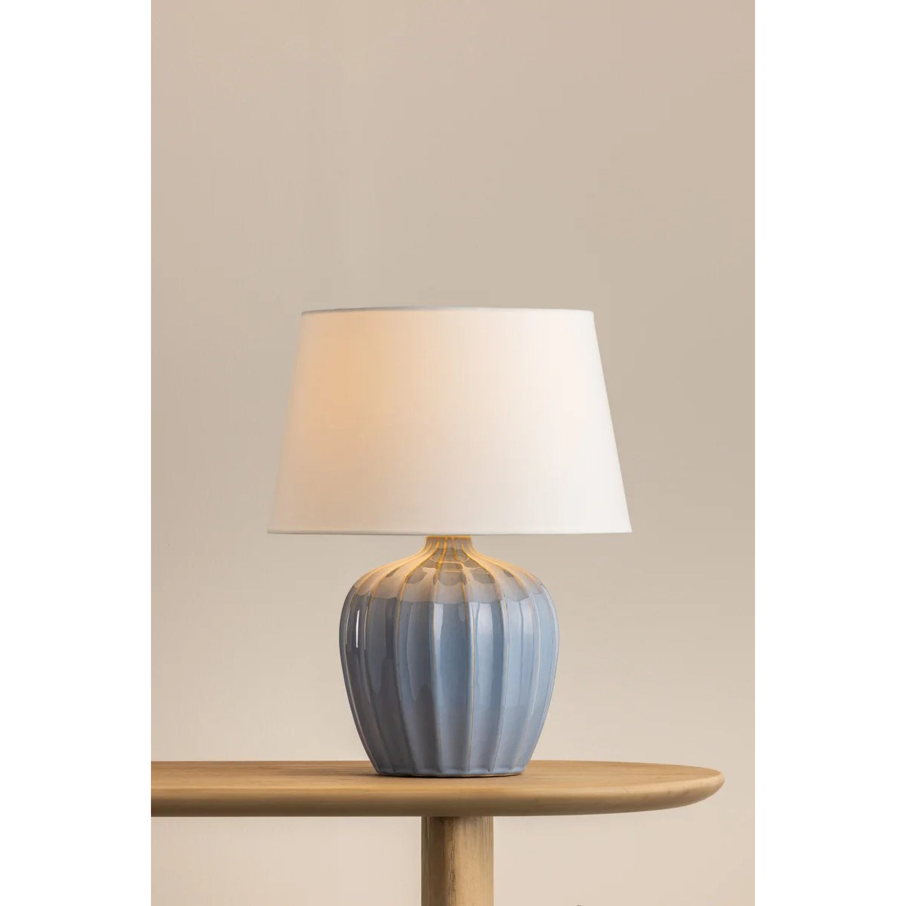 The Myla Table Lamp features a rounded base with a reactive glaze and vertical ribbing that creates tonal variation. The ribbed texture reveals an earthy undertone on the raised grooves, topped with a linen shade. Finished with metallic hardware, it is the perfect petite and playful accent lamp for bedside use.