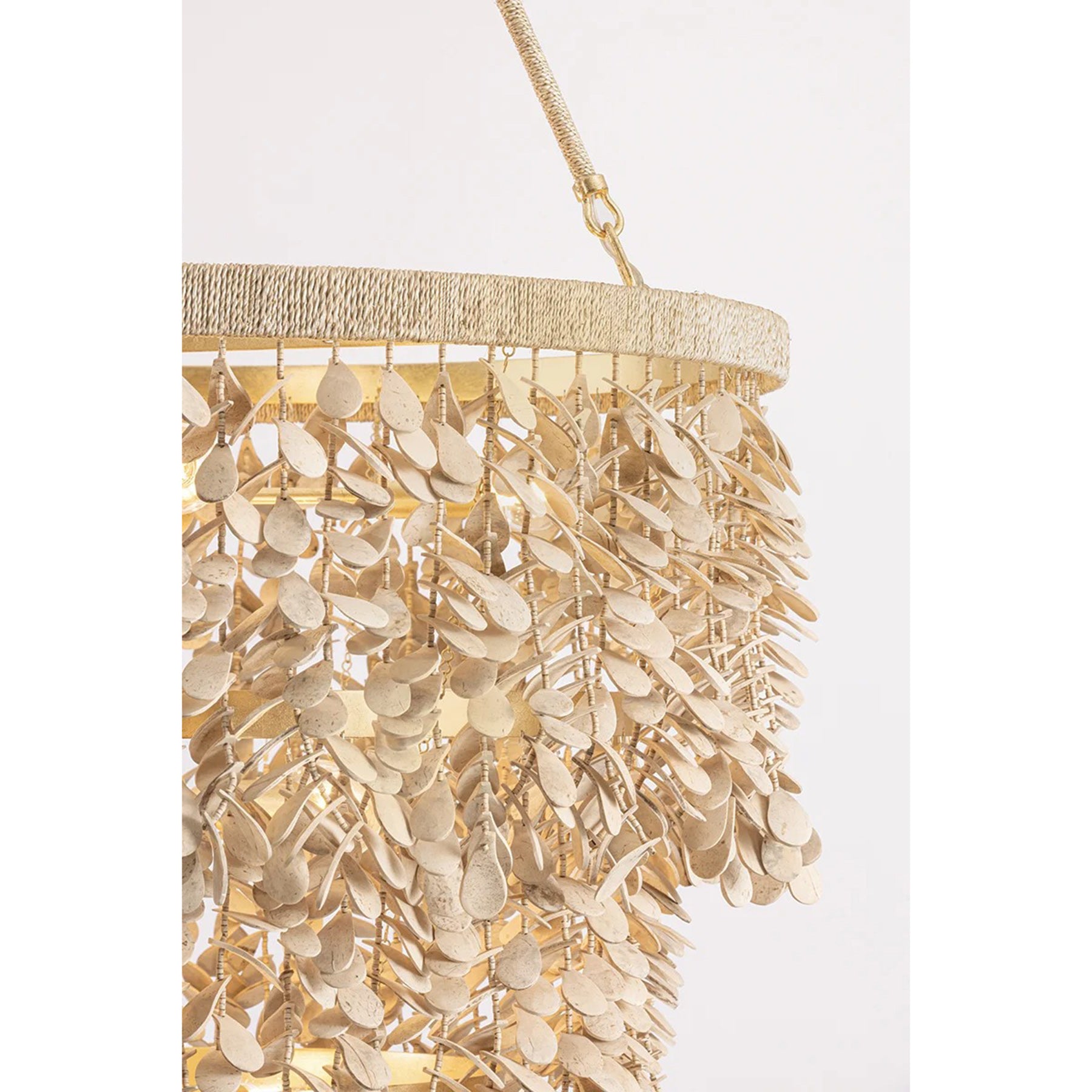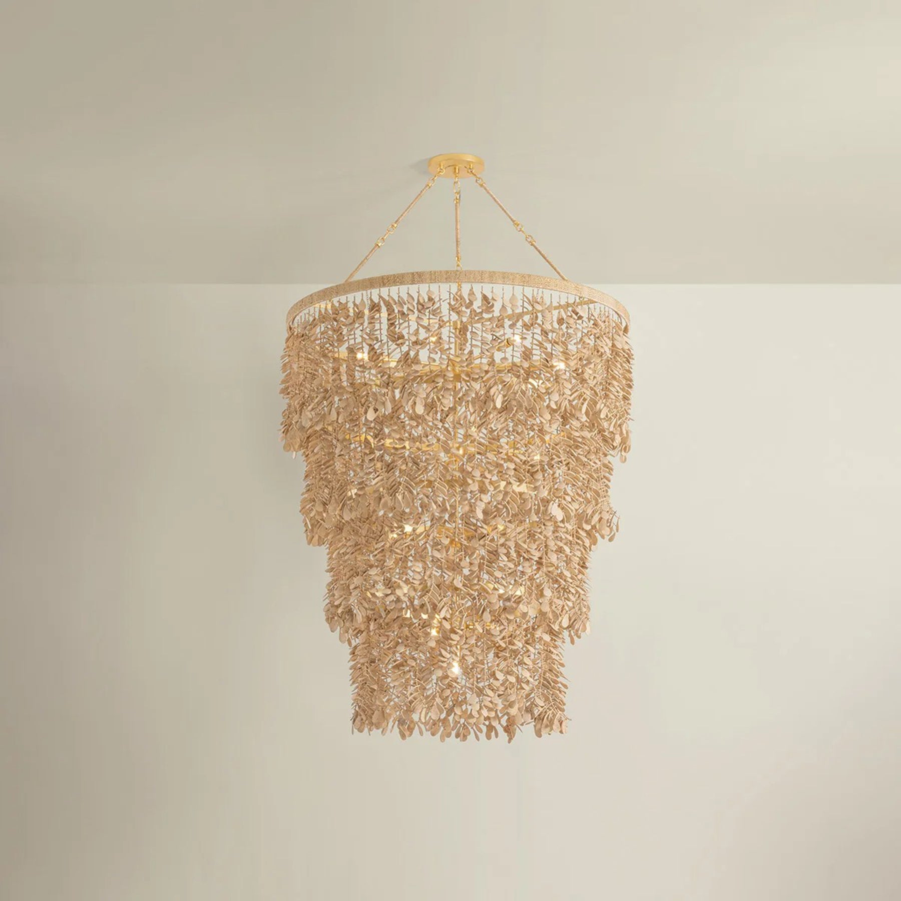 The Naxos 18 Light Chandelier is an ode to craftsmanship, adorned with loosely draped strands of hand-carved coco shell pieces. The layering of smaller shell elements on each strand adds depth and volume, giving the fixture a sense of movement and handcrafted beauty. Shaped like petals, the tonal pieces bring life to the design, making it a stunning focal point for grand spaces.