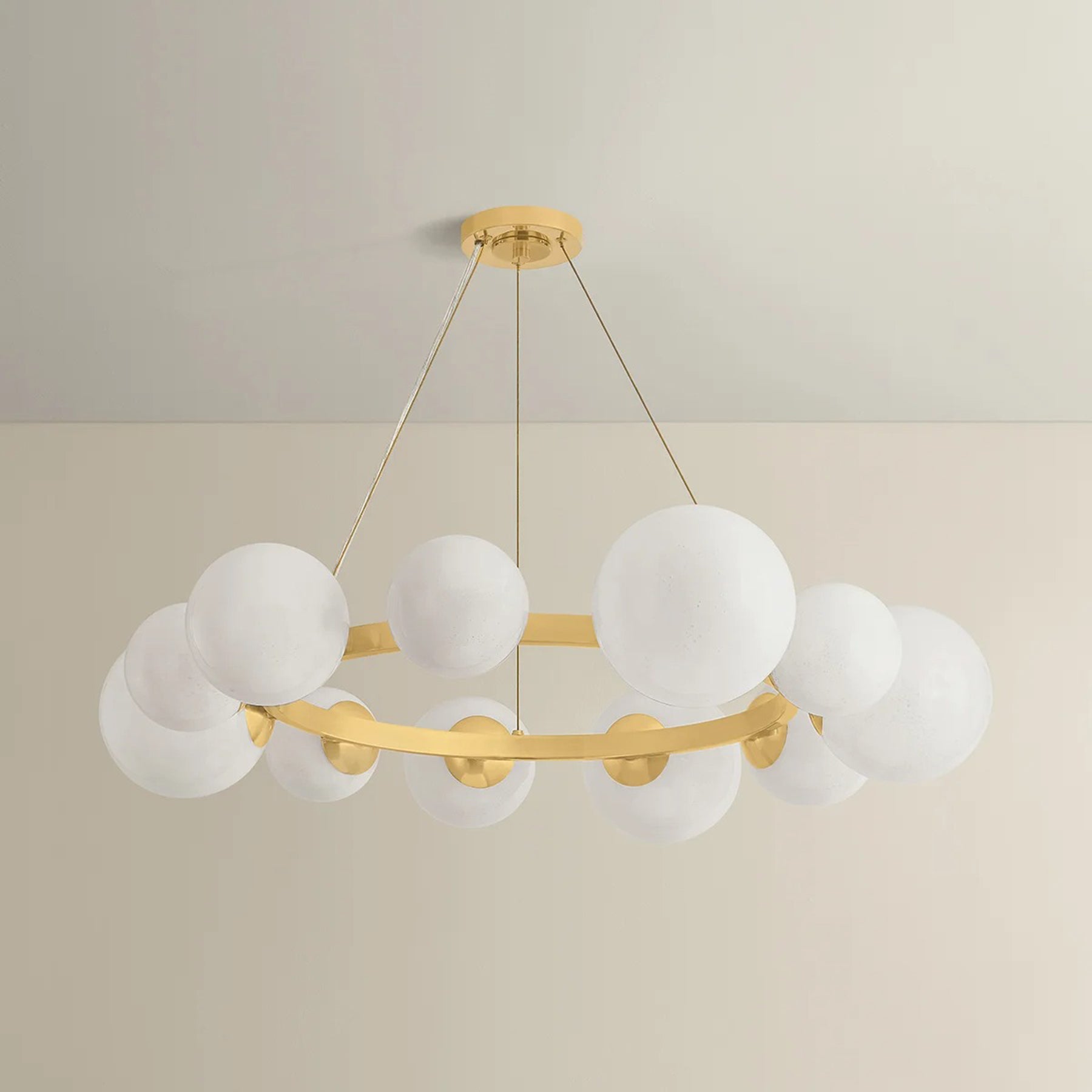 The Pacama 11 Light Chandelier is a study in lightness, showcasing celestial cloud seedy glass globes of various sizes arranged artfully along a metal ring. The soft, textured glass diffuses an atmospheric glow that is complemented by the metalwork. With 11 or 13 lights, this grand design brings an effervescent energy to contemporary spaces.