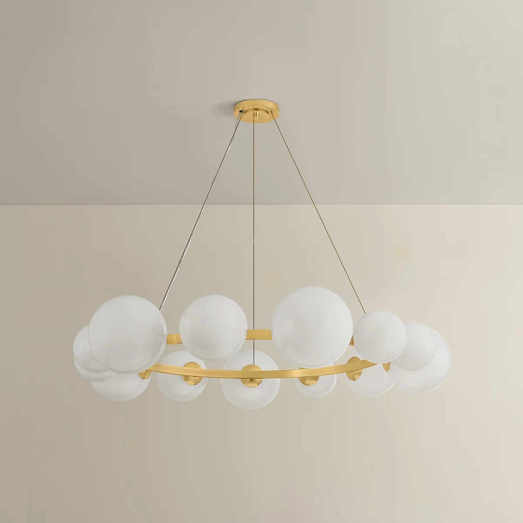 The Pacama 13 Light Chandelier is a study in lightness, showcasing celestial cloud seedy glass globes of various sizes arranged artfully along a metal ring. The soft, textured glass diffuses an atmospheric glow that is complemented by the metalwork. With 11 or 13 lights, this grand design brings an effervescent energy to contemporary spaces.