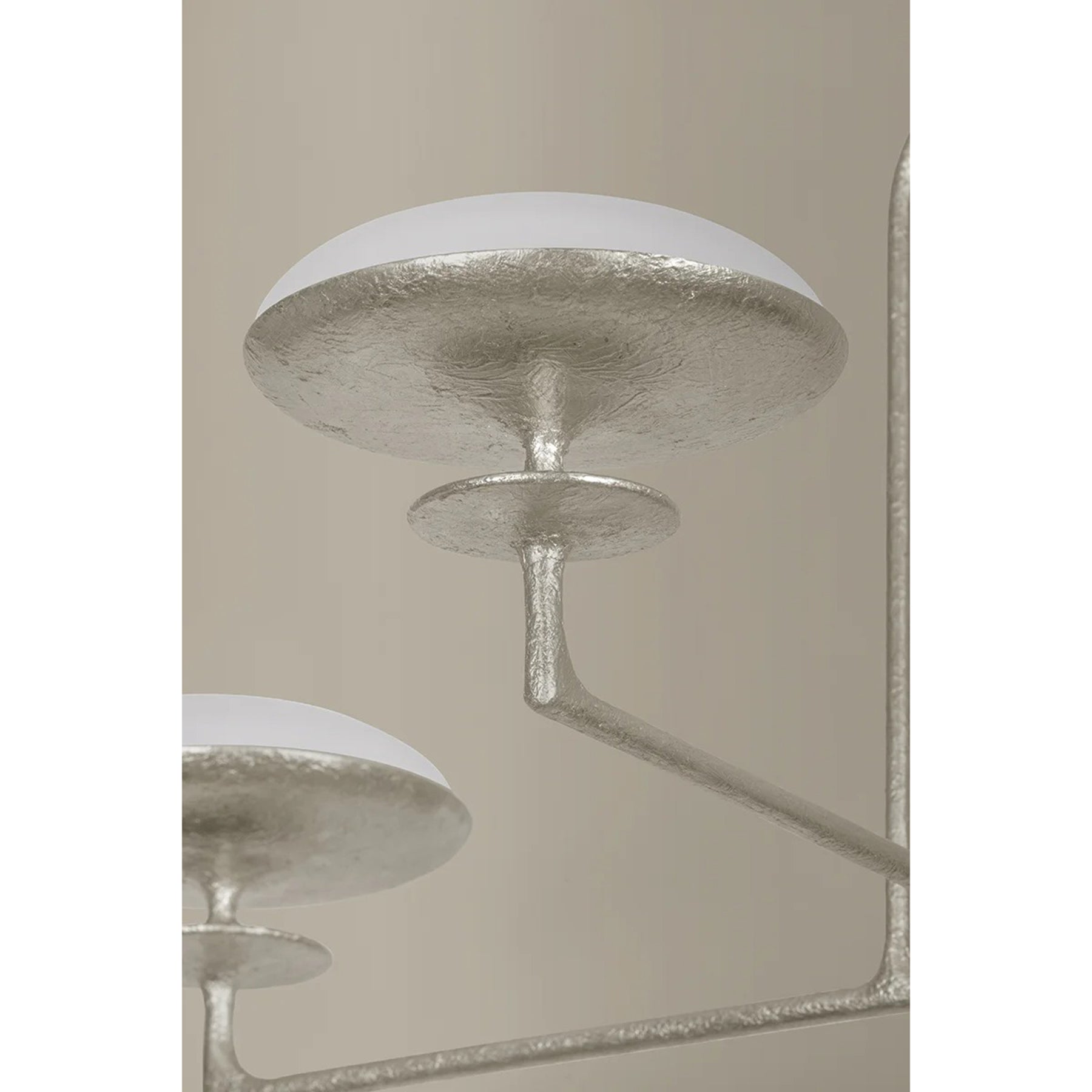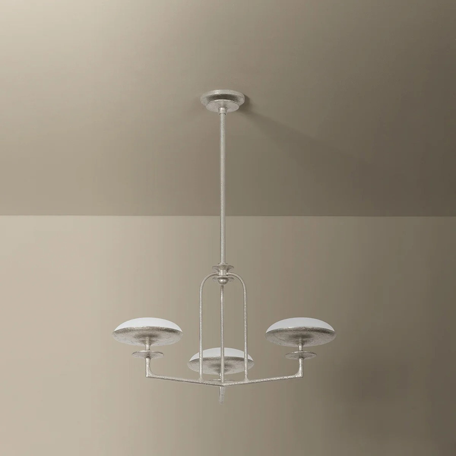 The Pacific 3 Light Chandelier responds to the need for uncomplicated, yet sculptural chandeliers in contemporary interiors. A handcrafted Warm Silver Leaf finish adds texture to the geometric shapes, architectural arches, and decorative bobeches while the etched matte glass shades provide a soft diffusion of light.