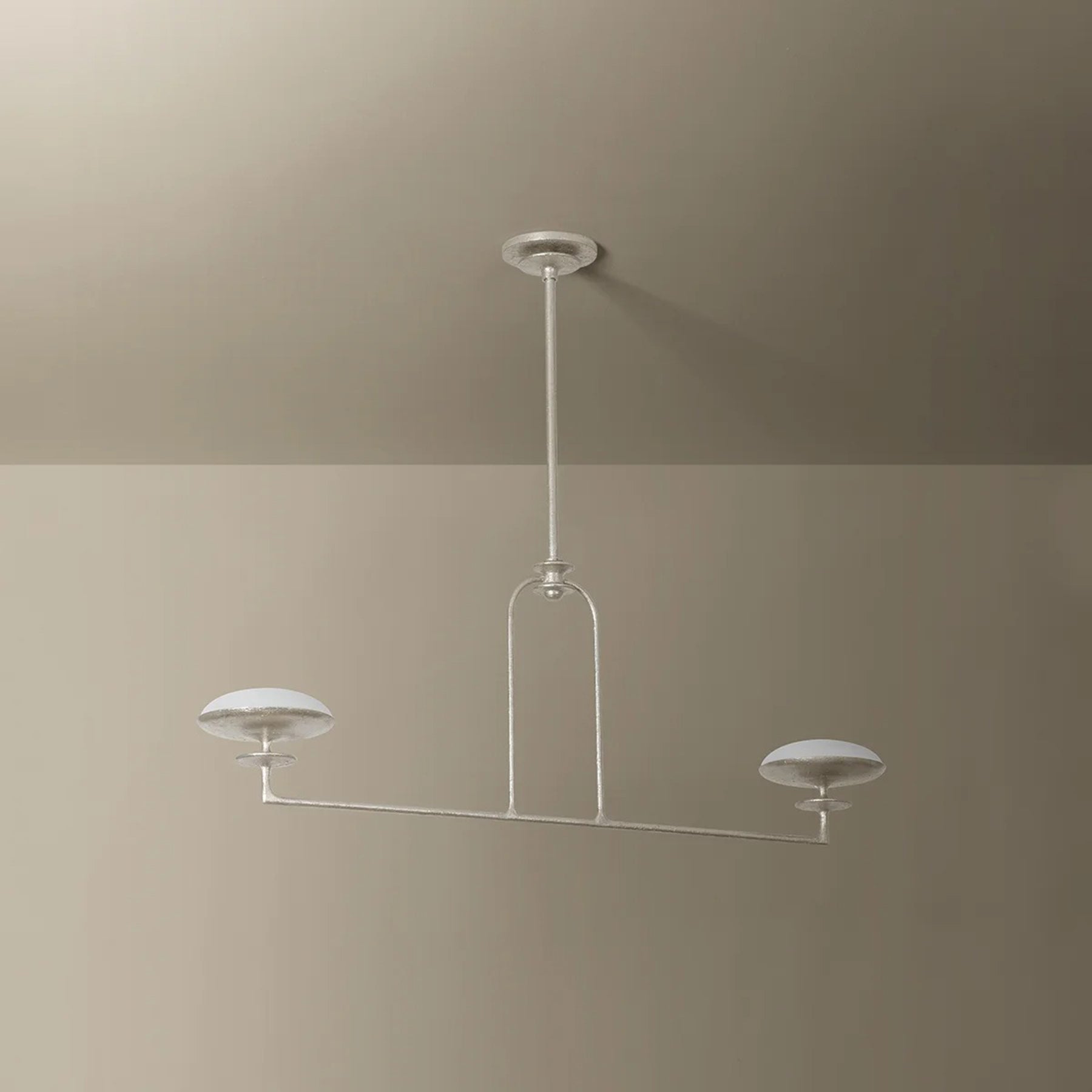 The Pacific Linear responds to the need for uncomplicated, yet sculptural chandeliers in contemporary interiors. A handcrafted Warm Silver Leaf finish adds texture to the geometric shapes, architectural arches, and decorative bobeches while the etched matte glass shades provide a soft diffusion of light.