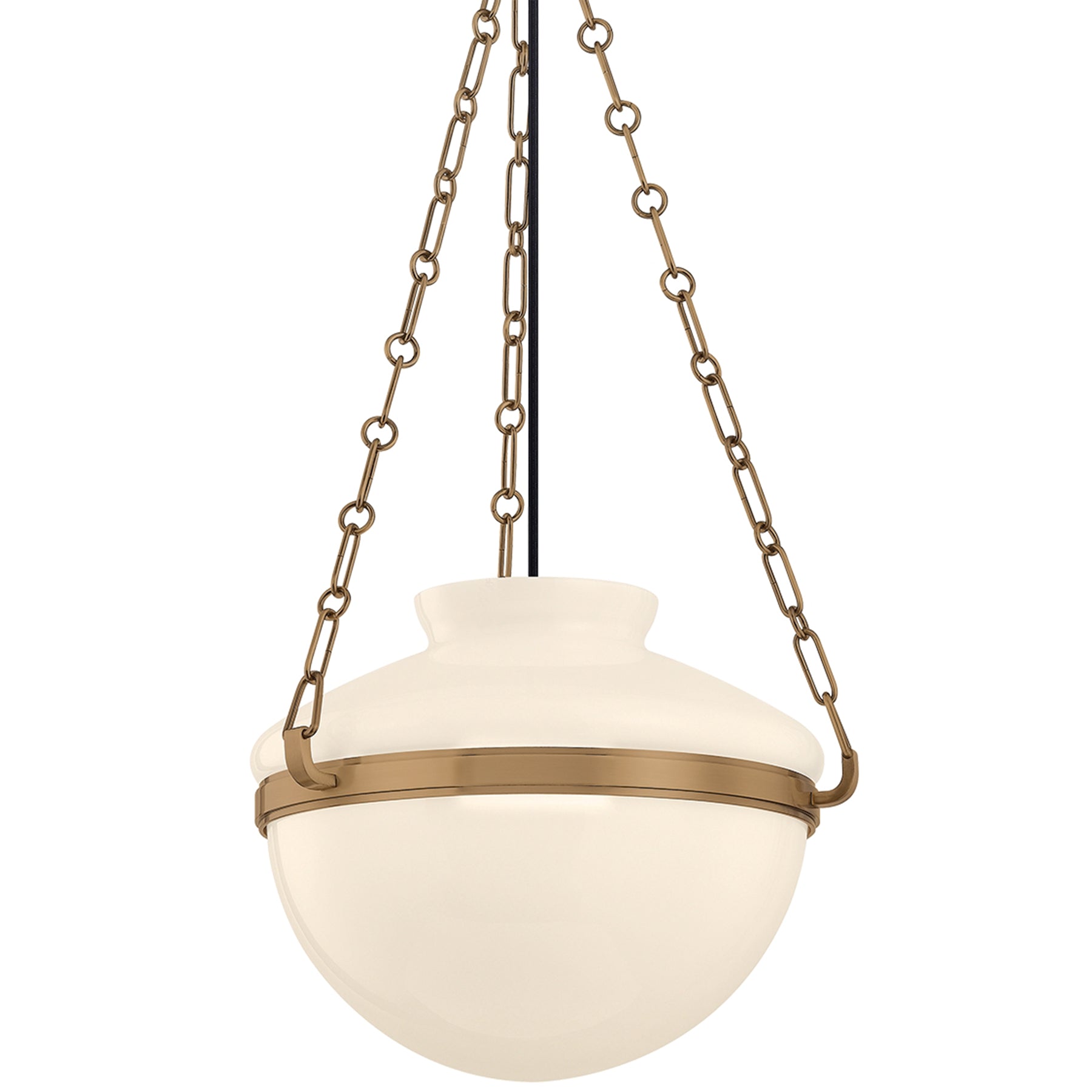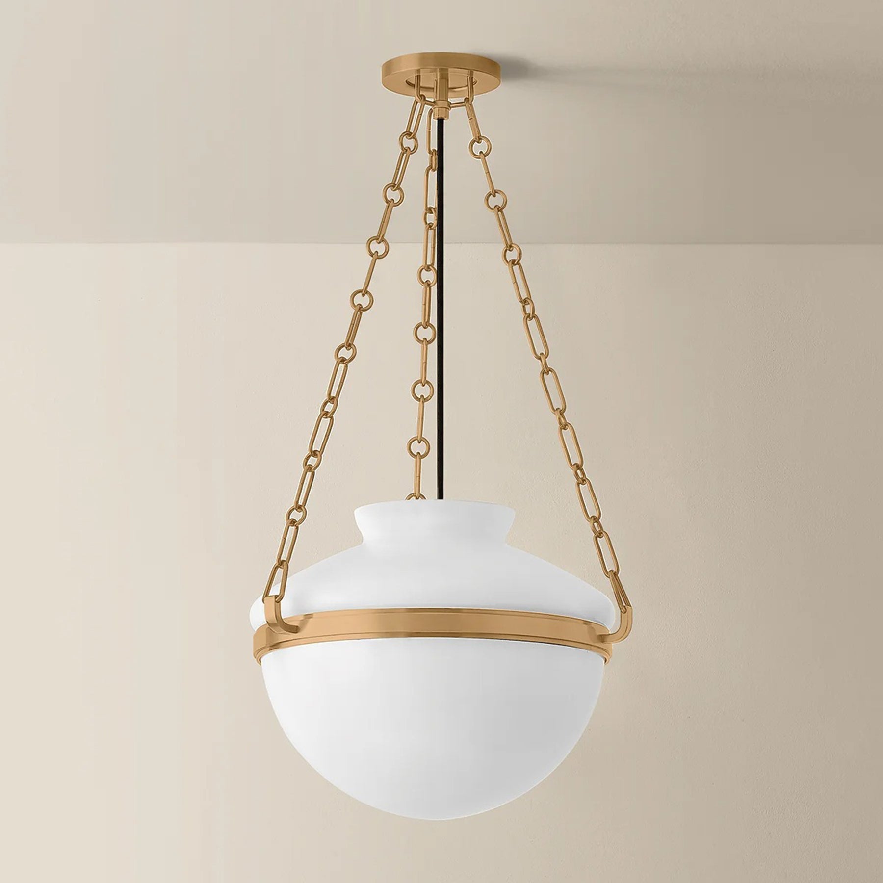 The Paradigm Pendant reimagines the classic lantern with bold, generous proportions and a contemporary sensibility. A large student-style opal shiny glass shade hangs from a trio of chunky chains.
