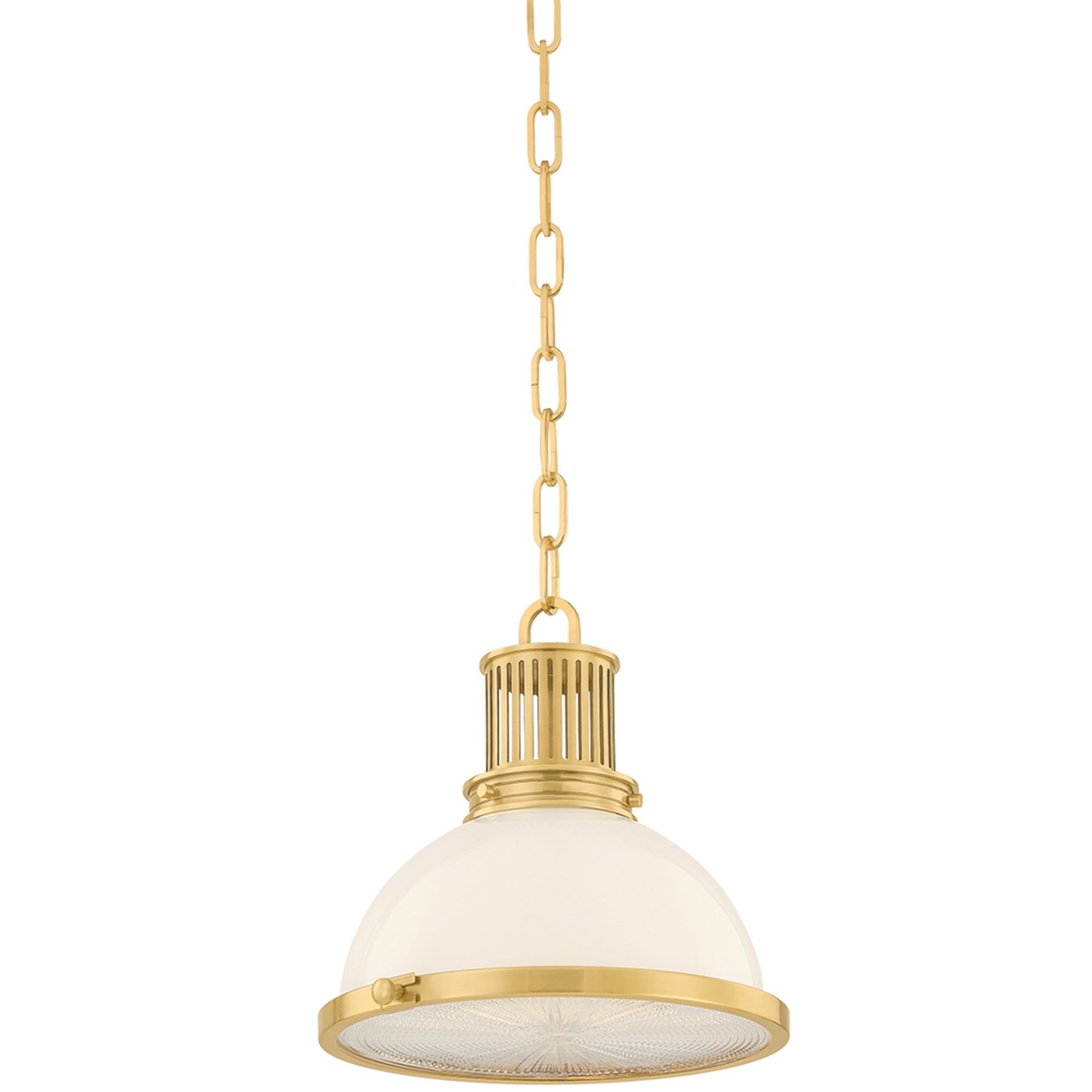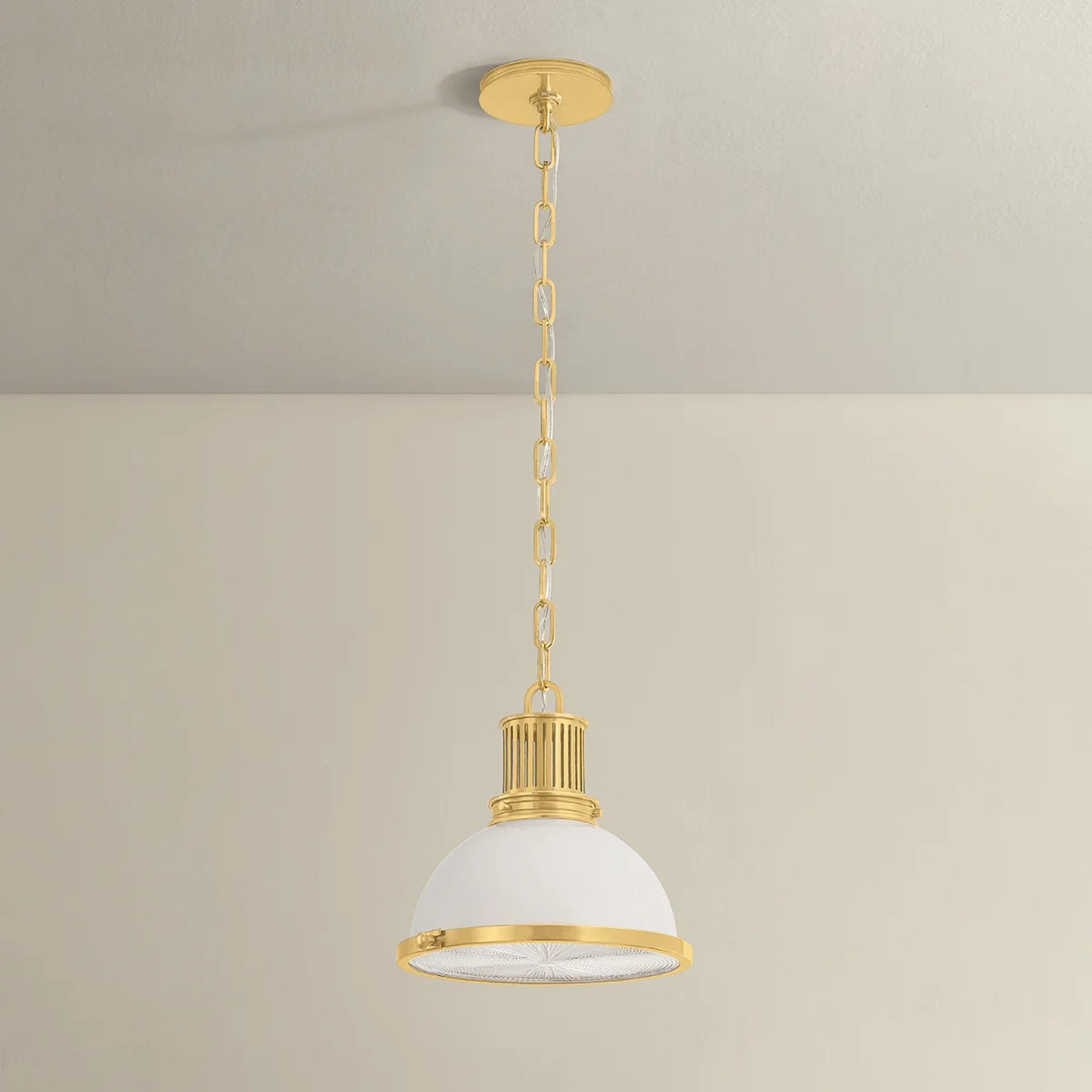 The Pinesbridge Pendant takes a classic RLM silhouette and reimagines it with geometric details. A large opal shiny glass shade is paired with a holophane glass diffuser featuring textural grooves. Machine-cut perforations around the top add an industrial edge. This schoolhouse lamp revamp hangs with style in kitchens, hallways, and beyond.