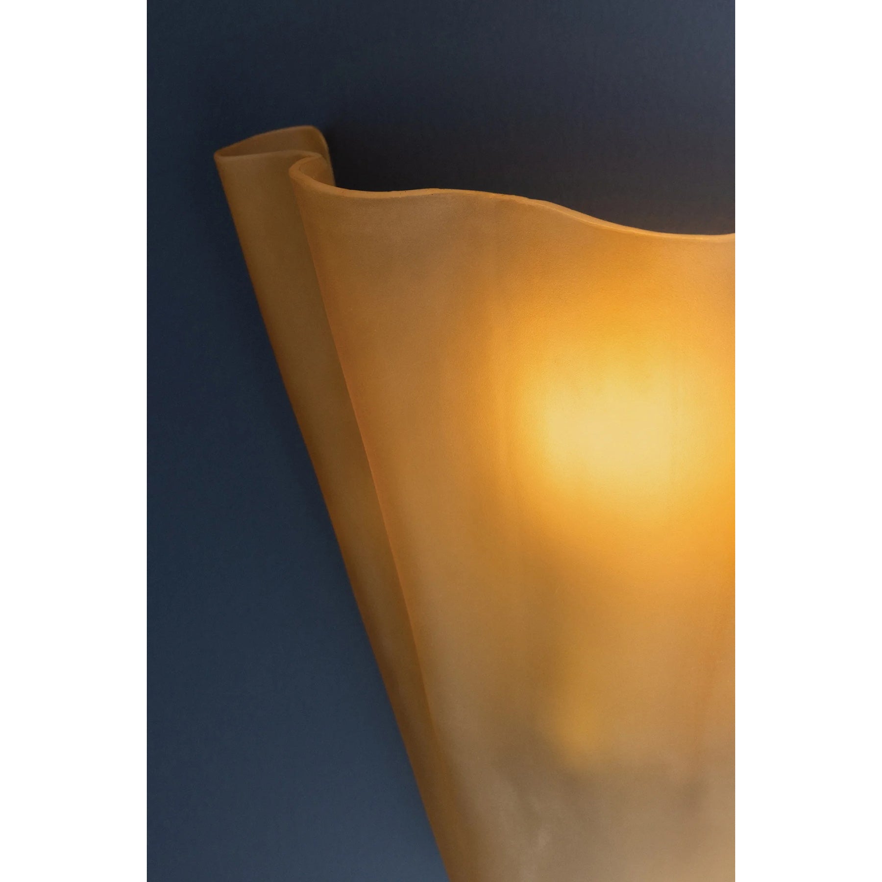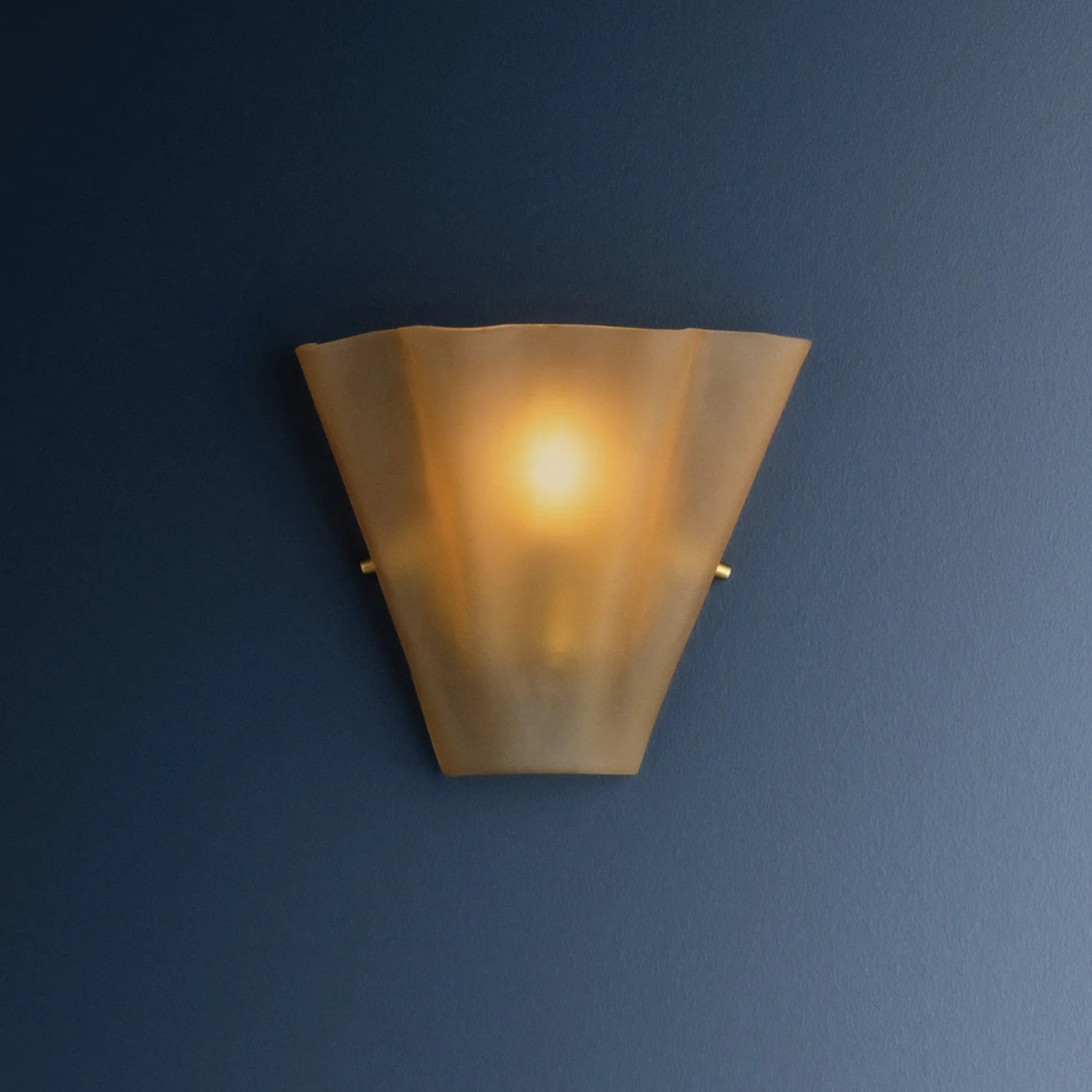 The Queen Wall Sconce is reminiscent of a seashell or coral, bringing whimsical coastal style to transitional interiors. Handmade in India, the wavy glass shade is frosted inside, appearing opaque when unlit and translucent when illuminated. A circular light source glows through like a pearl, as Aged Brass studs add a bit of shine on either side of the fixture.