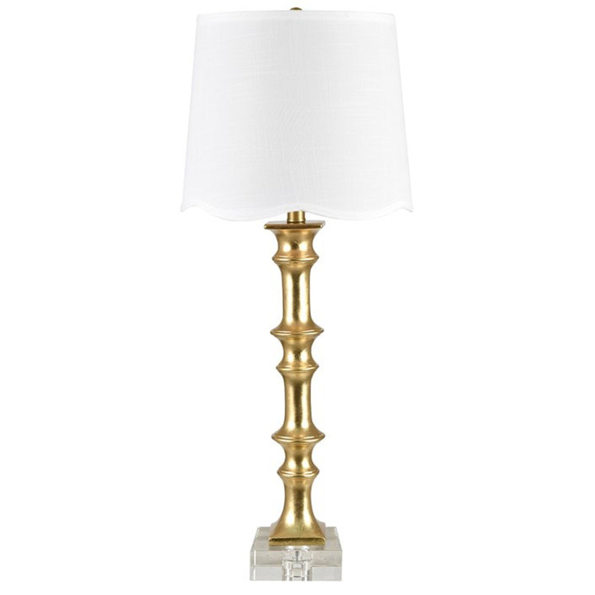 The Romy Table Lamp pairs crystal and resin elements with a refined gold finish, offering a clean silhouette that complements transitional and modern interiors.