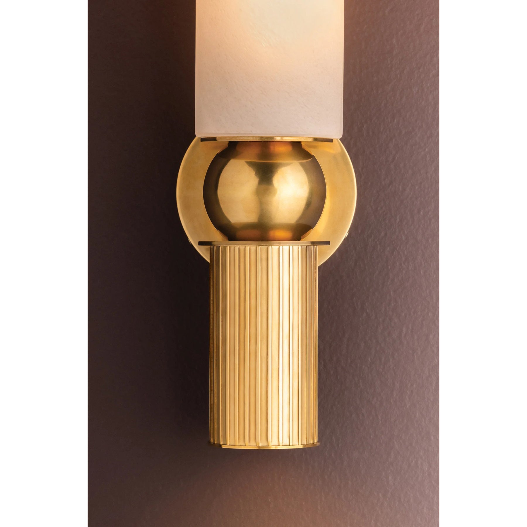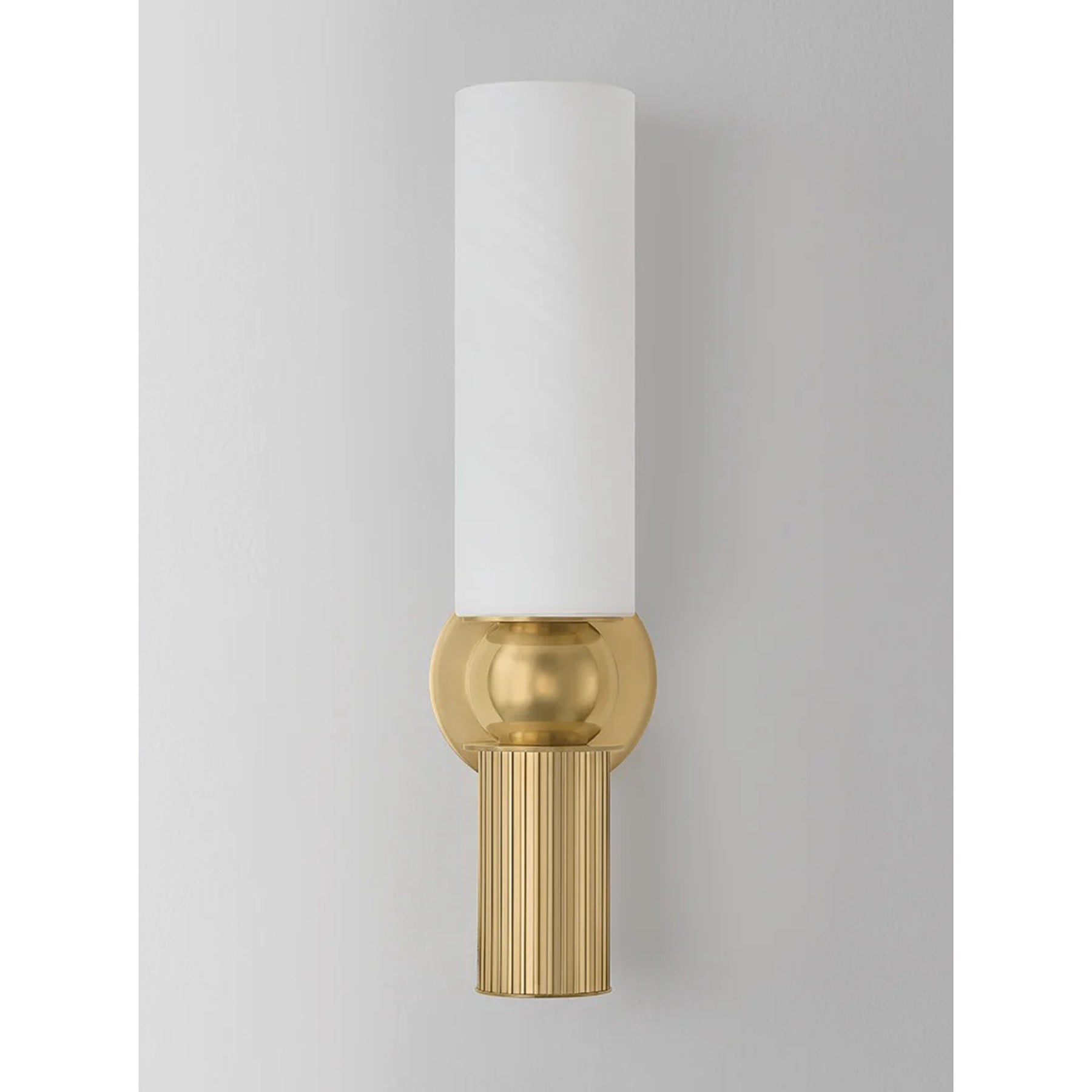 The Ronda Wall Sconce recalls a Greek column with soft curves and uniform fluting. A matte cloud glass shade diffuses ambient light above, while a hidden light source within the metal cylinder casts a focused glow below. To complement the antique aesthetic, Ronda Wall Sconce is finished in Vintage Brass.