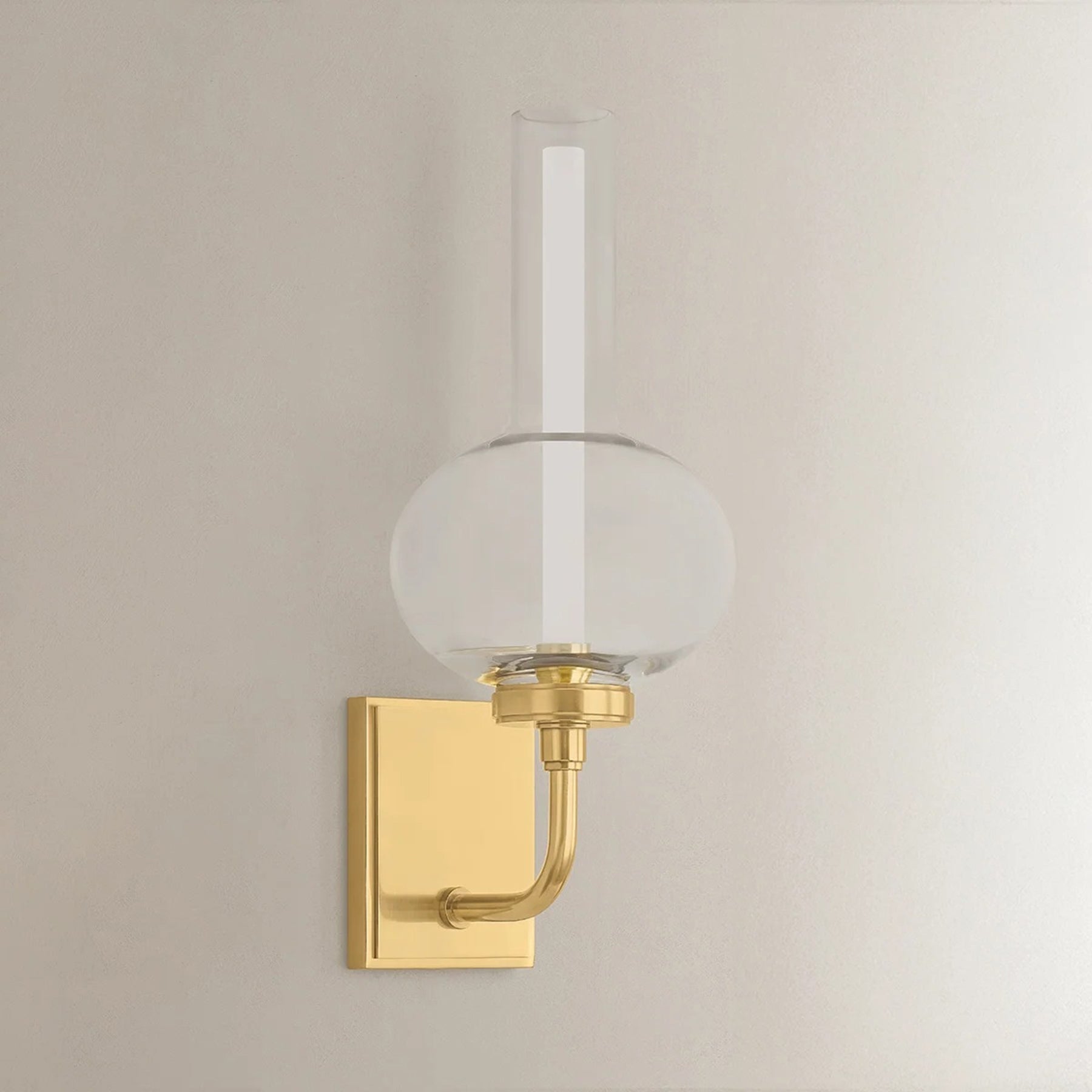 The Rossman Wall Sconce is a modern interpretation of turn-of-the-century gas lamps. Where a flame once would have flickered, an LED light now illuminates this hurricane-style clear glass silhouette from within a solid acrylic cylinder. Finished with an Aged Brass candle holder, Rossman Wall Sconce taps into vintage elegance while providing modern utility.