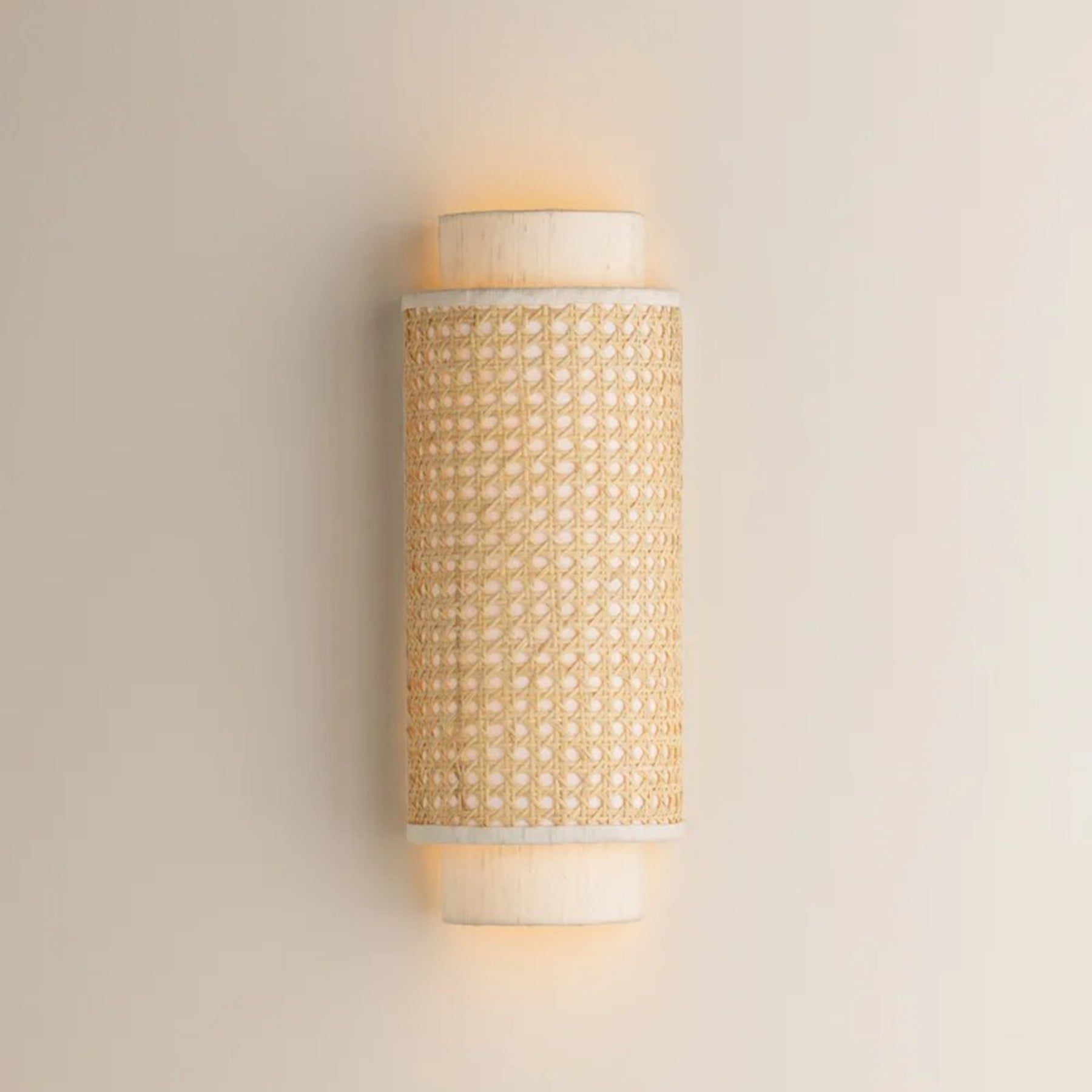 The Tina Wall Sconce features natural materials, handcrafted detail, and soft layering. A curved raw silk shade forms a tunnel that shields the light, while the outer basket cane wicker layer creates a textural point of interest. A warm, inviting glow fills the shade, softly spilling from both ends to wash the wall.