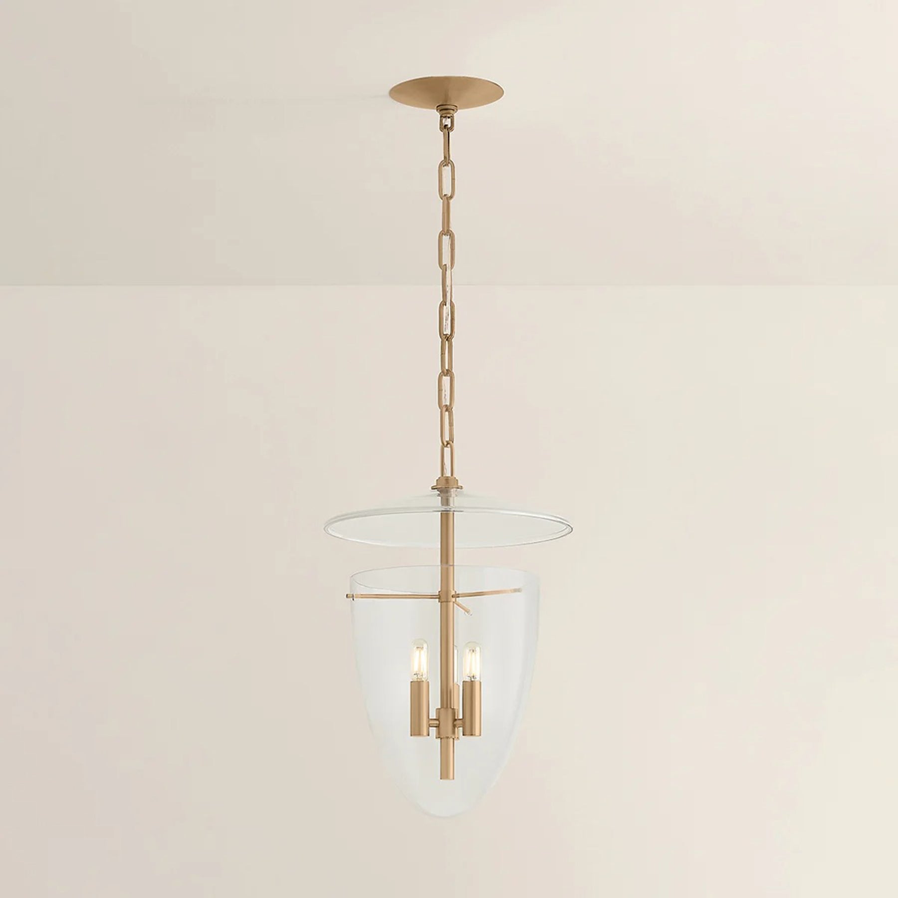 The Tully Pendant is an artful transitional lantern featuring an inverted bell jar shape with a suspended glass disc at the top. The all-glass composition is fresh and unexpected, revealing clean metalwork inside. This piece is available with 3 or 4 lights, and features a classic finish.