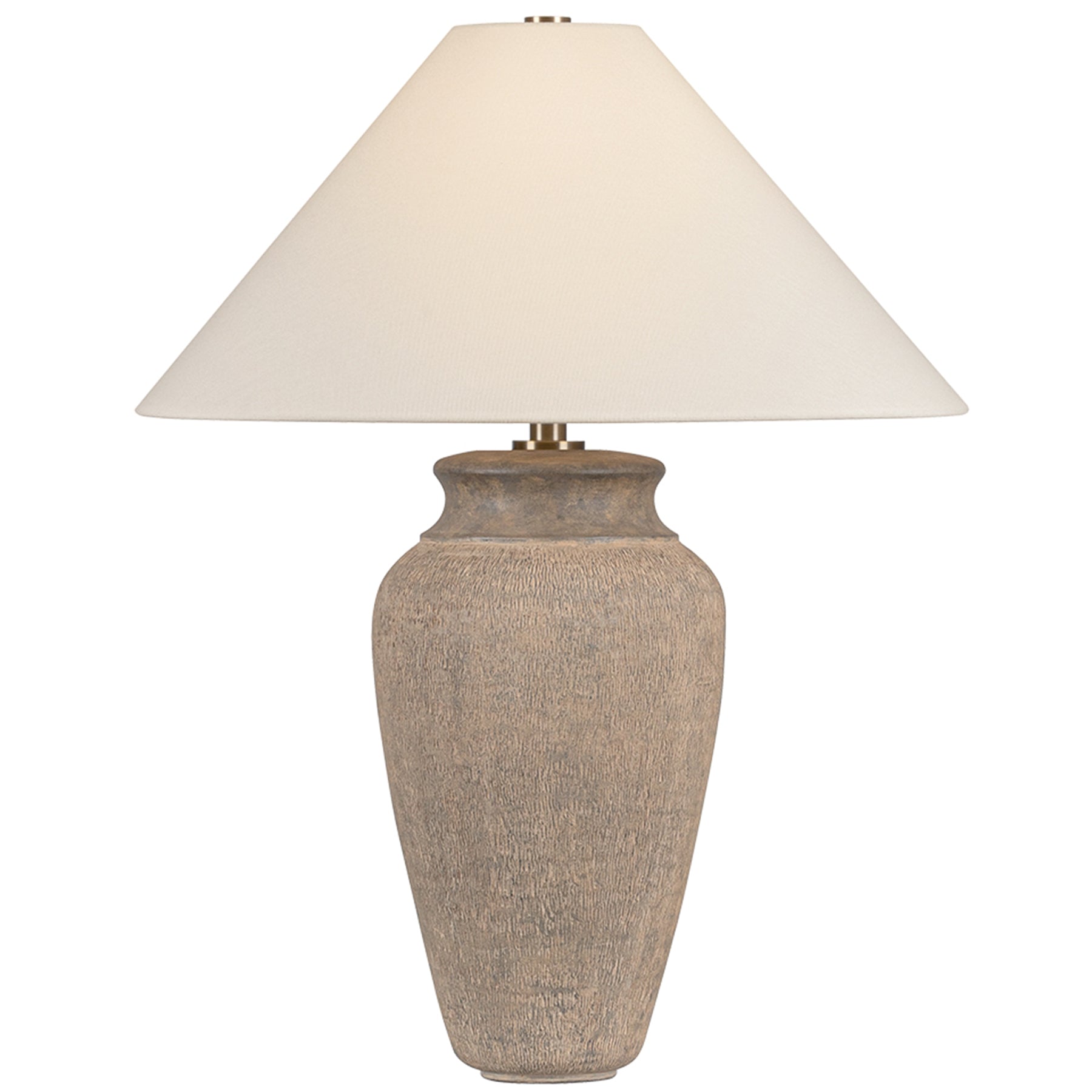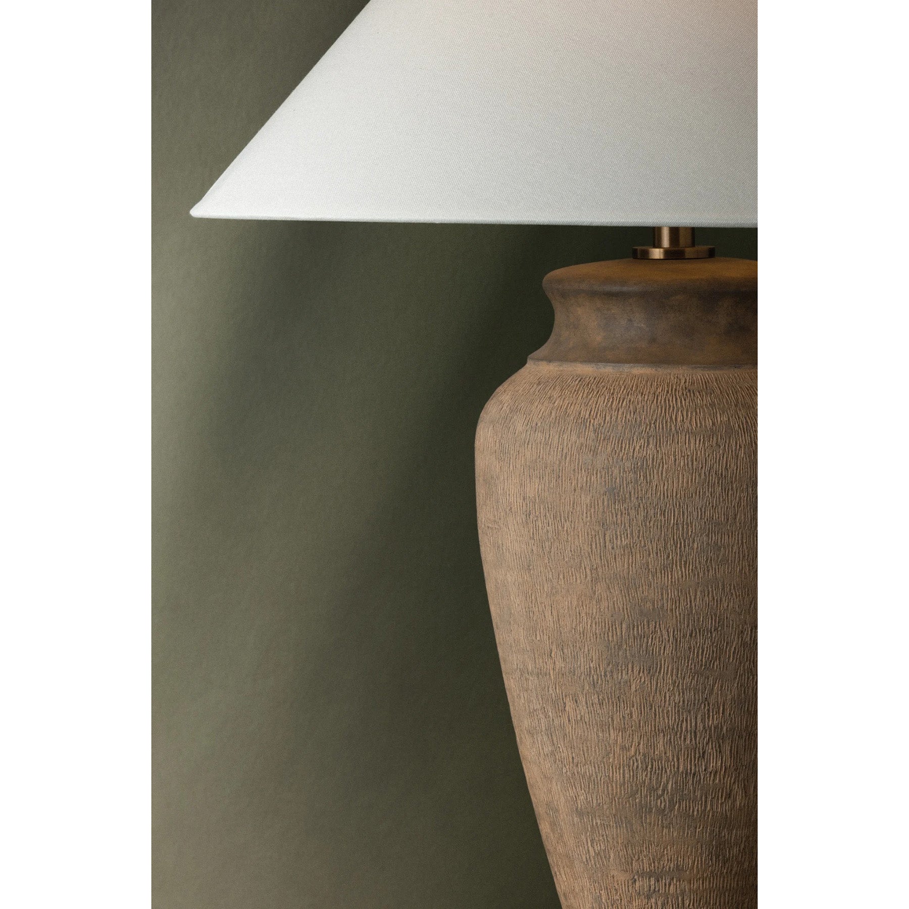 The Vessel Table Lamp features a statuesque, elongated base with a richly textured finish that evokes clay layered by hand. A sharply tapered linen shade balances the earthy hues with a note of freshness. Hardware adds a subtle glint at the neck, creating an earthy yet refined sculptural feel.