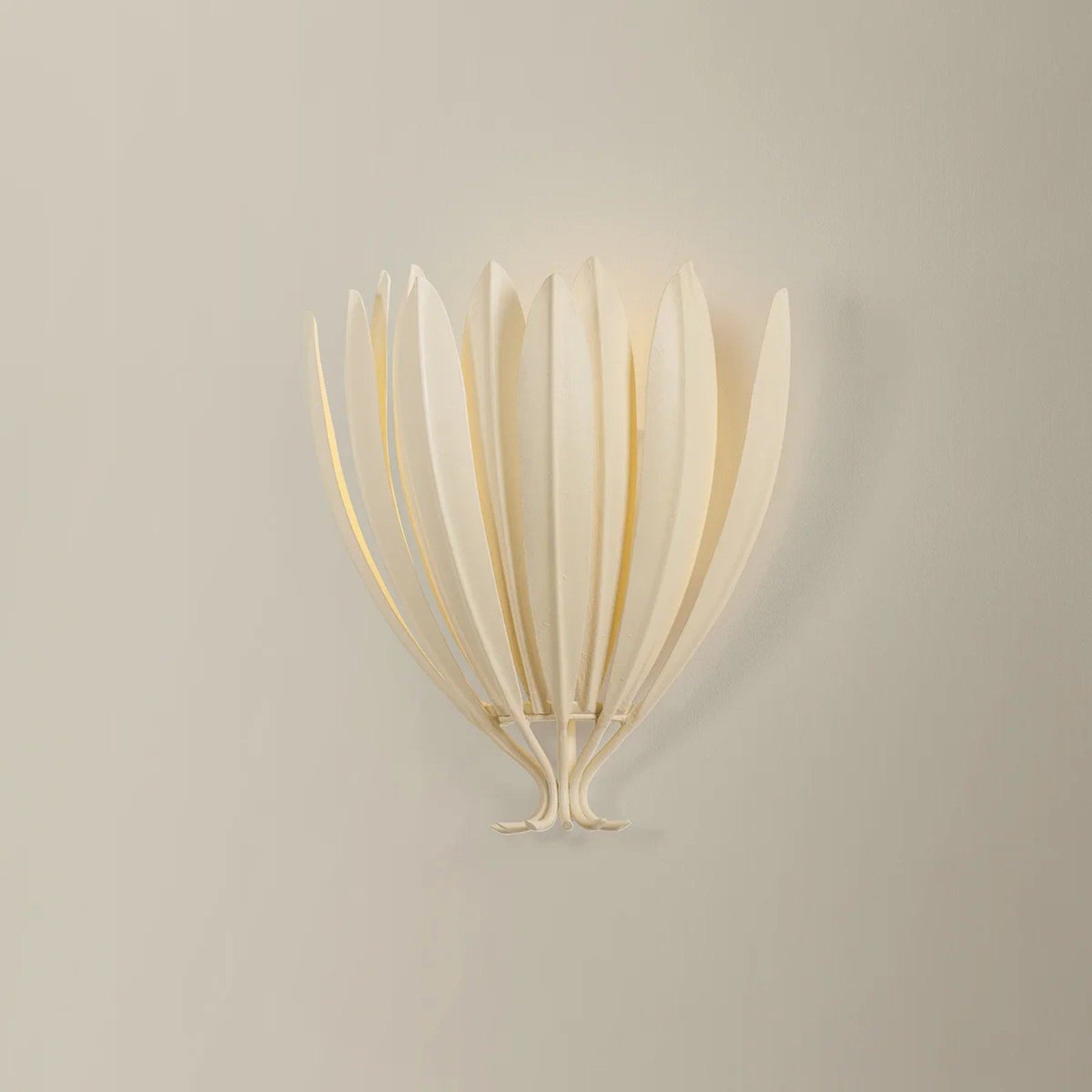 The Whitfield Wall Sconce features elongated leaf-like metal elements that overlap to form a sculptural, glowing shade. Light softly filters through the layered foliage, creating a warm, organic radiance. Finished in Cream Plaster for a soft, modern alternative to classic white.
