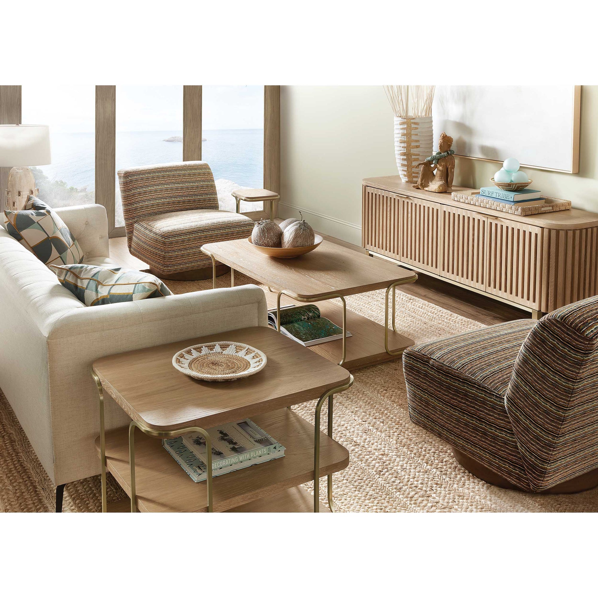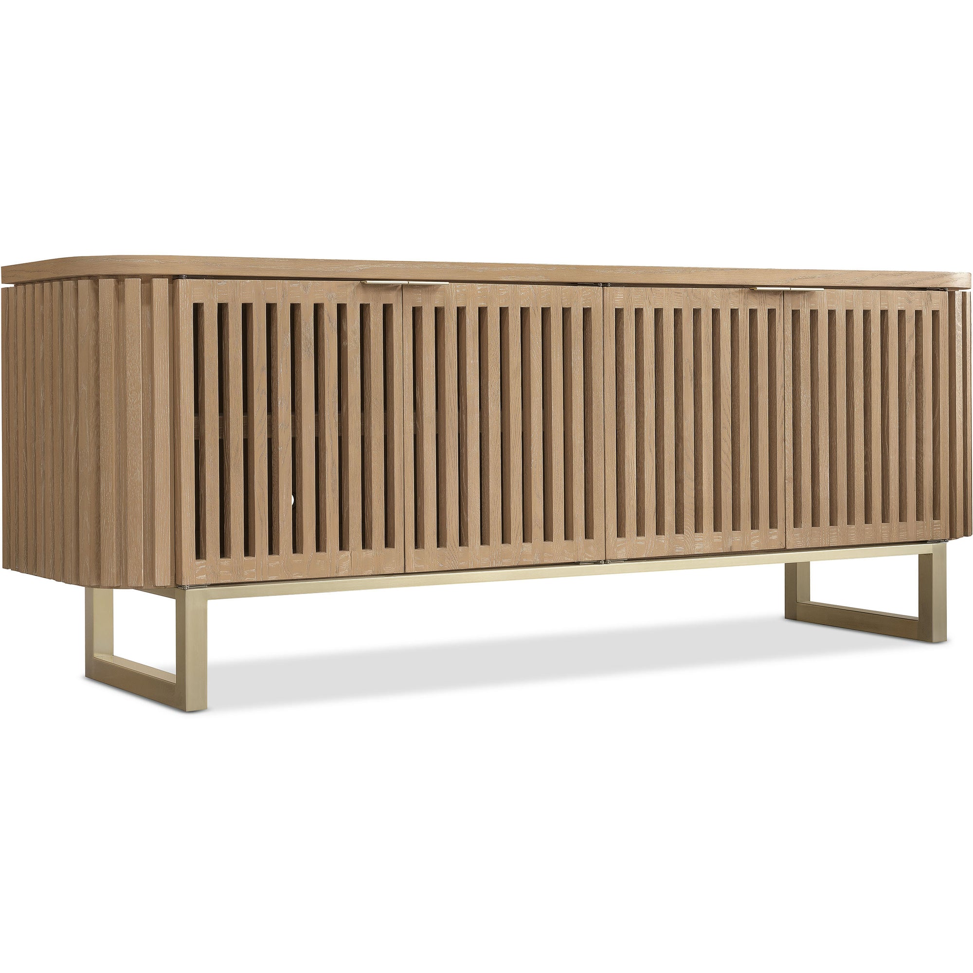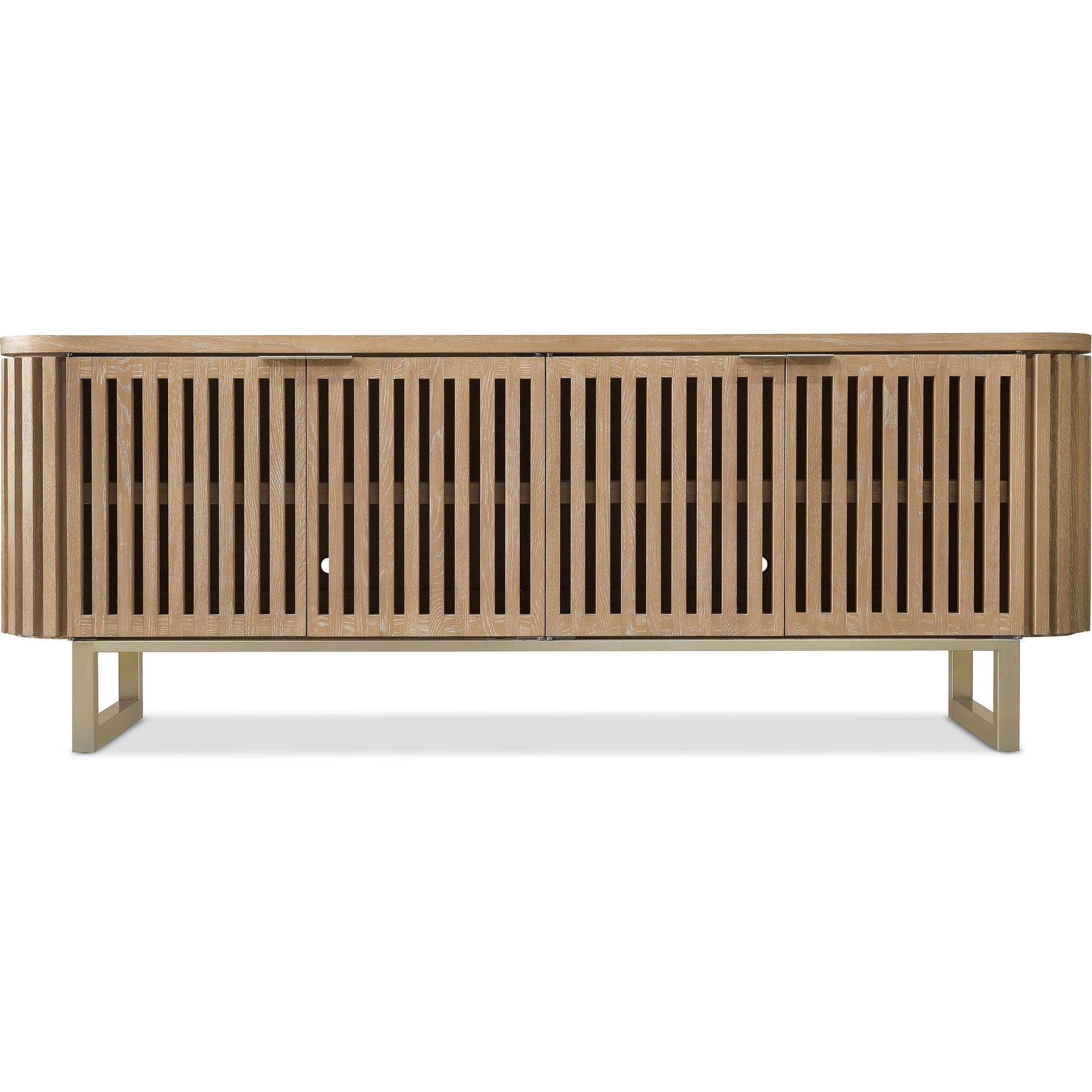 The Easton Entertainment Console offers a stylish and functional centerpiece for your media setup. Crafted from white oak solids and veneers, it features four slatted doors that open with a simple touch-latch mechanism. Inside, adjustable shelving and wire management cutouts provide ample, organized storage for all your entertainment components. Designed for modern living, this console's clean lines and textured finish bring a sophisticated yet relaxed feel to any space, accommodating up to a 75-inch flat-screen TV.