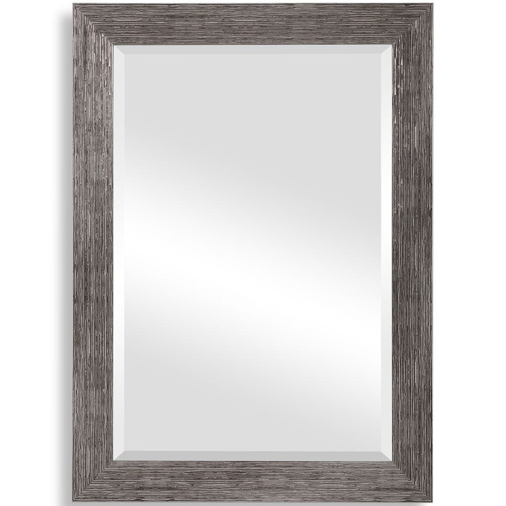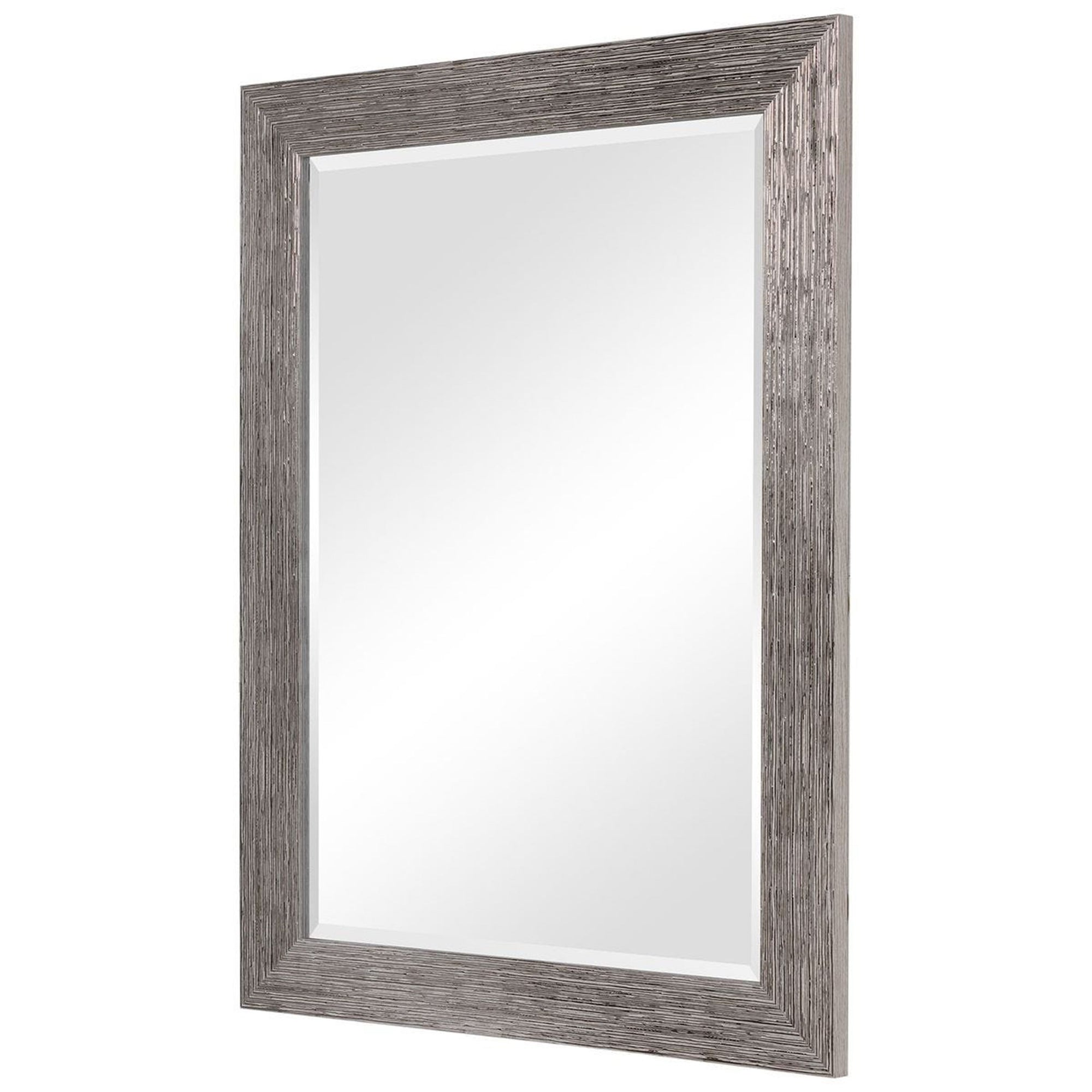 The Anton Mirror features a frame with slightly raised, uneven lines that enhance its silver tones. The 1" beveled mirror can be hung vertically or horizontally, making it a versatile and elegant accent for entryways, bedrooms, or living spaces.