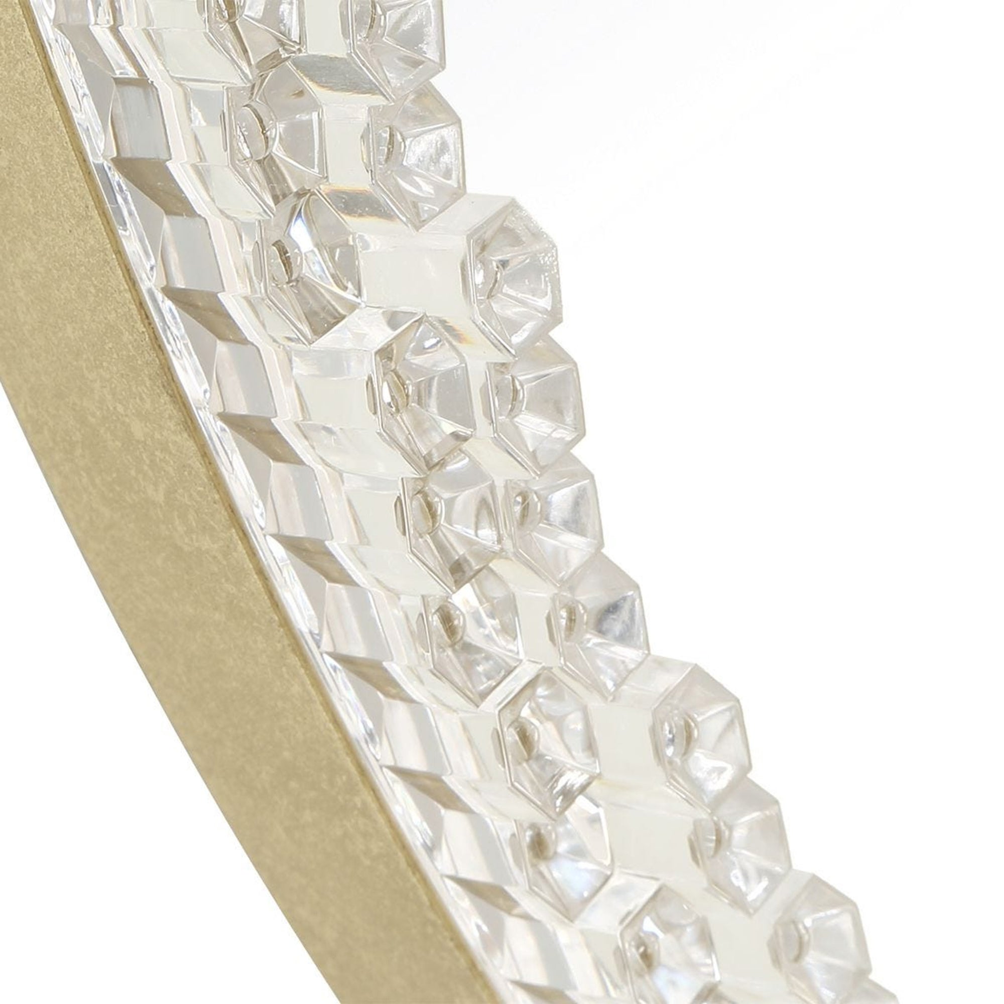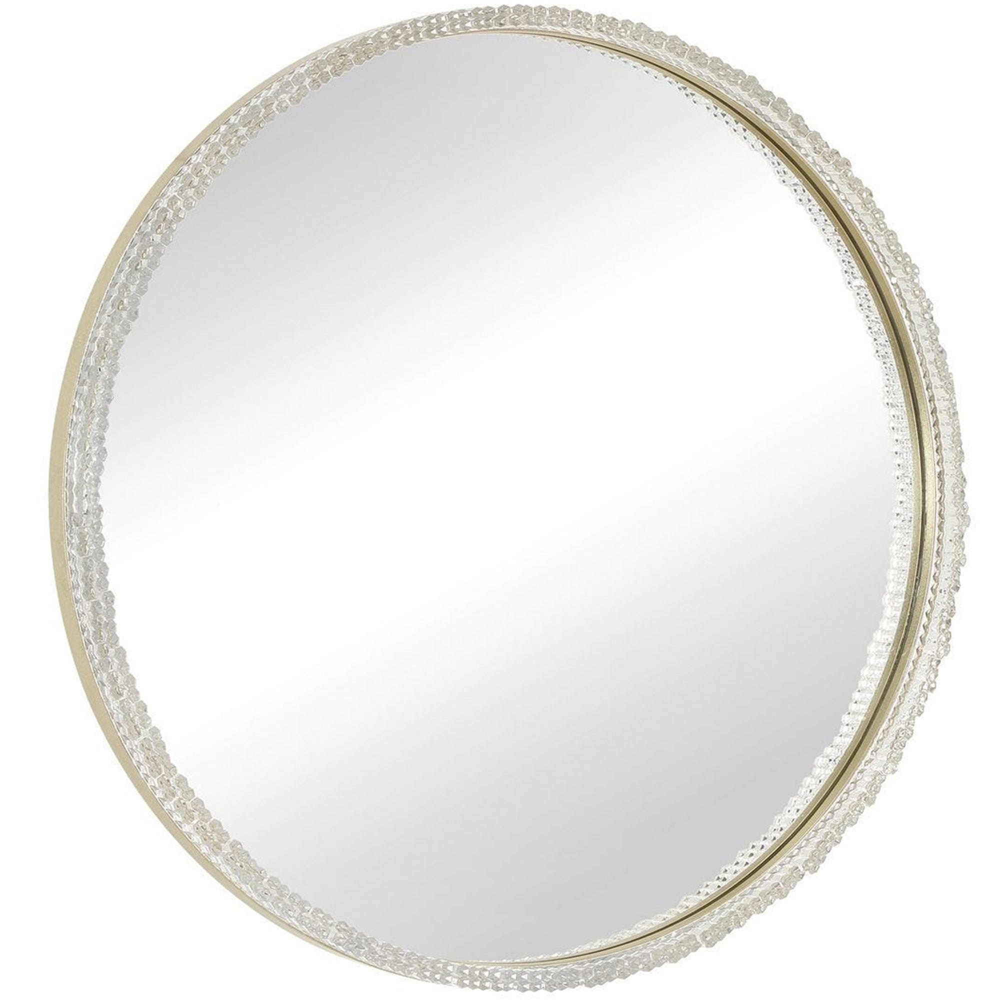 The Break The Ice Mirror is a sophisticated round accent piece that blends modern textures with classic elegance. This mirror features a distinctive acrylic facade with a textured appearance reminiscent of crystalline ice. A warm champagne iron frame provides a refined border, grounding the shimmering edges of the design. At 32 inches in diameter, the Break The Ice Mirror serves as a stunning focal point in an entryway, living area, or bedroom, reflecting light across its unique surfaces to brighten and enlarge any interior space.