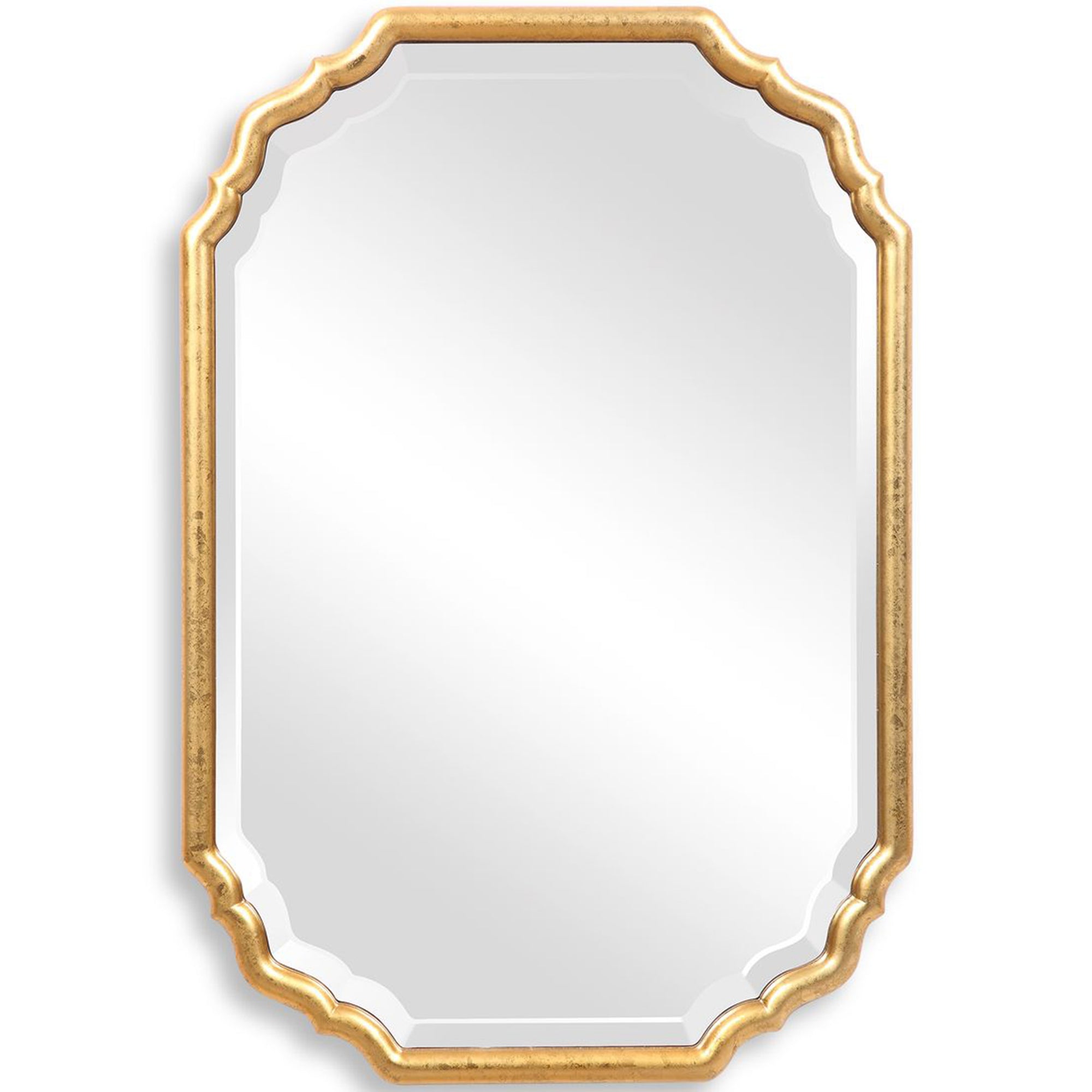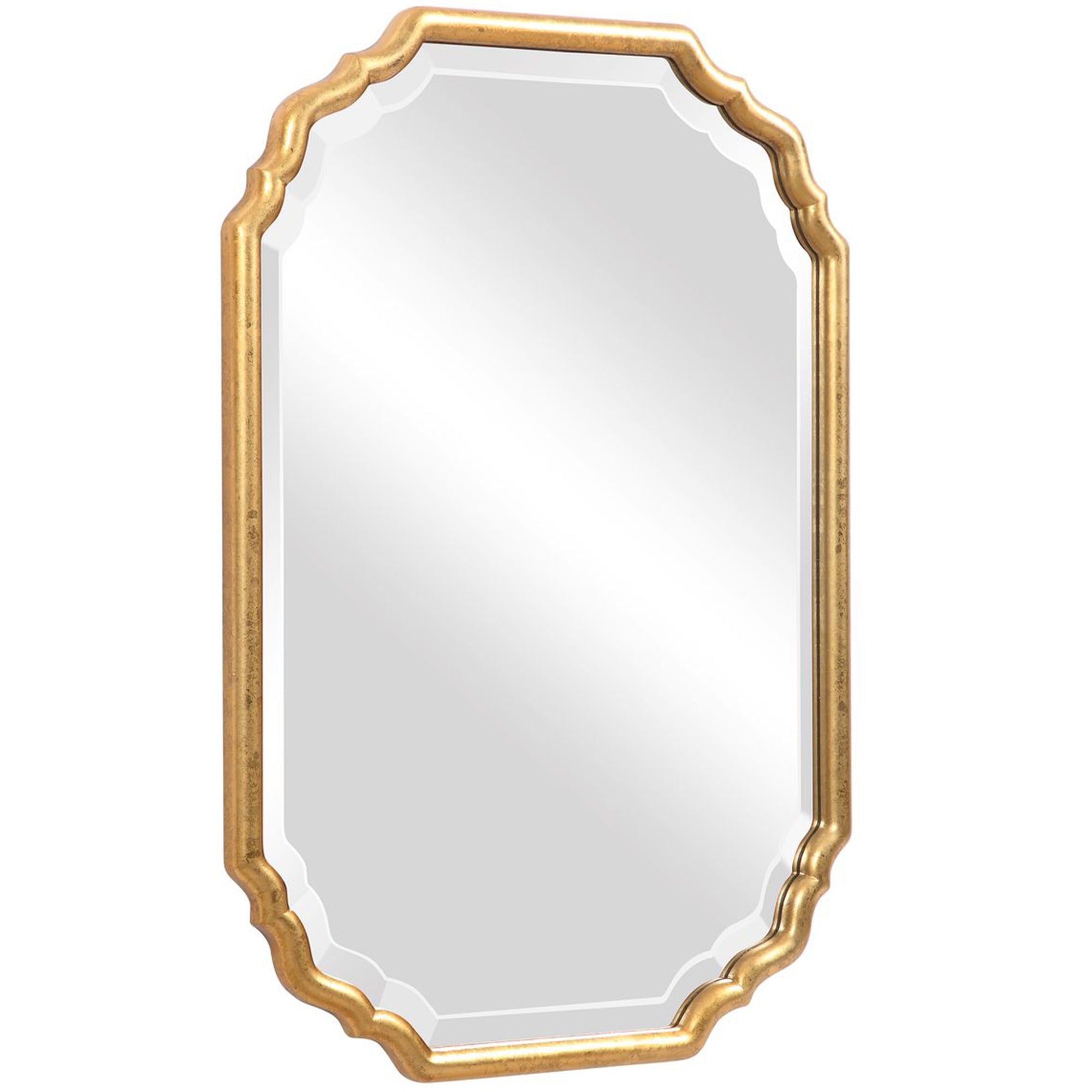 The Brooks Mirror showcases elegant curved corners and is finished in a lightly antiqued metallic gold leaf. The center mirror features a generous 1.25" bevel, adding depth and sophistication. It may be hung either vertically or horizontally, making it a versatile addition to any space.