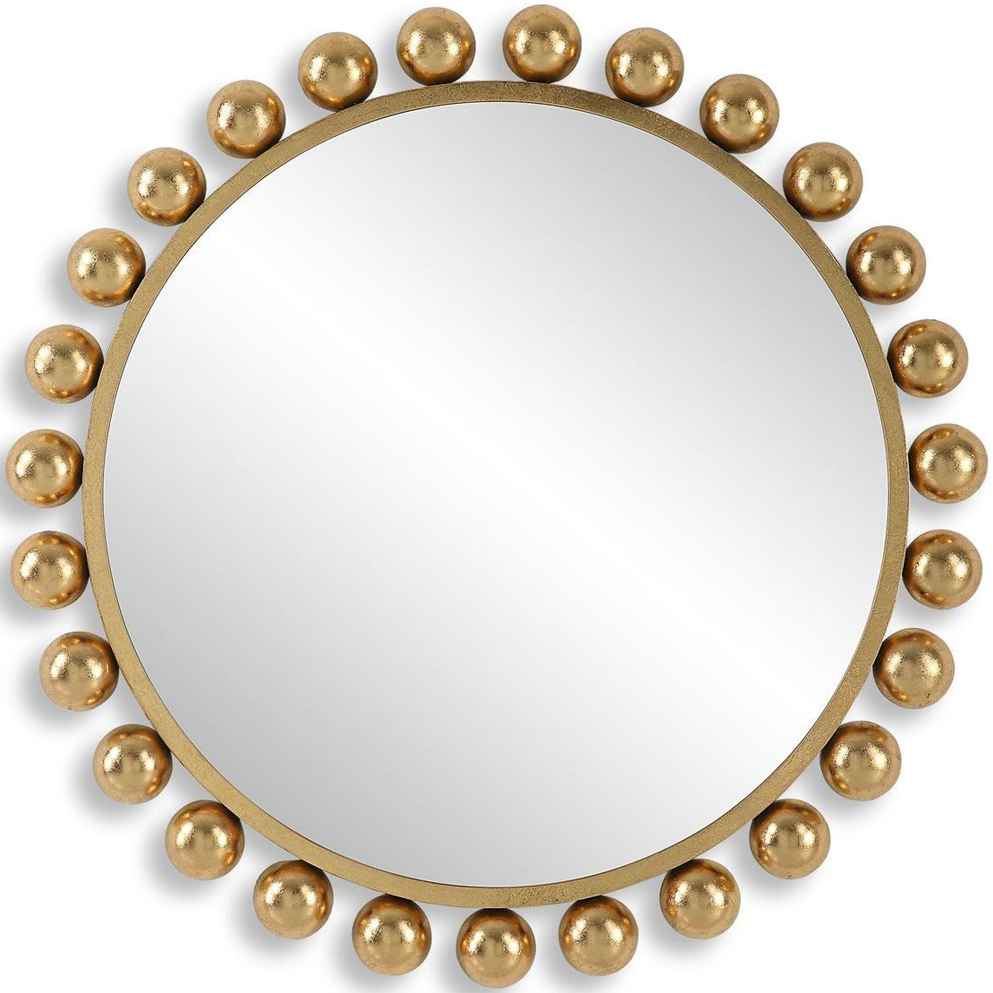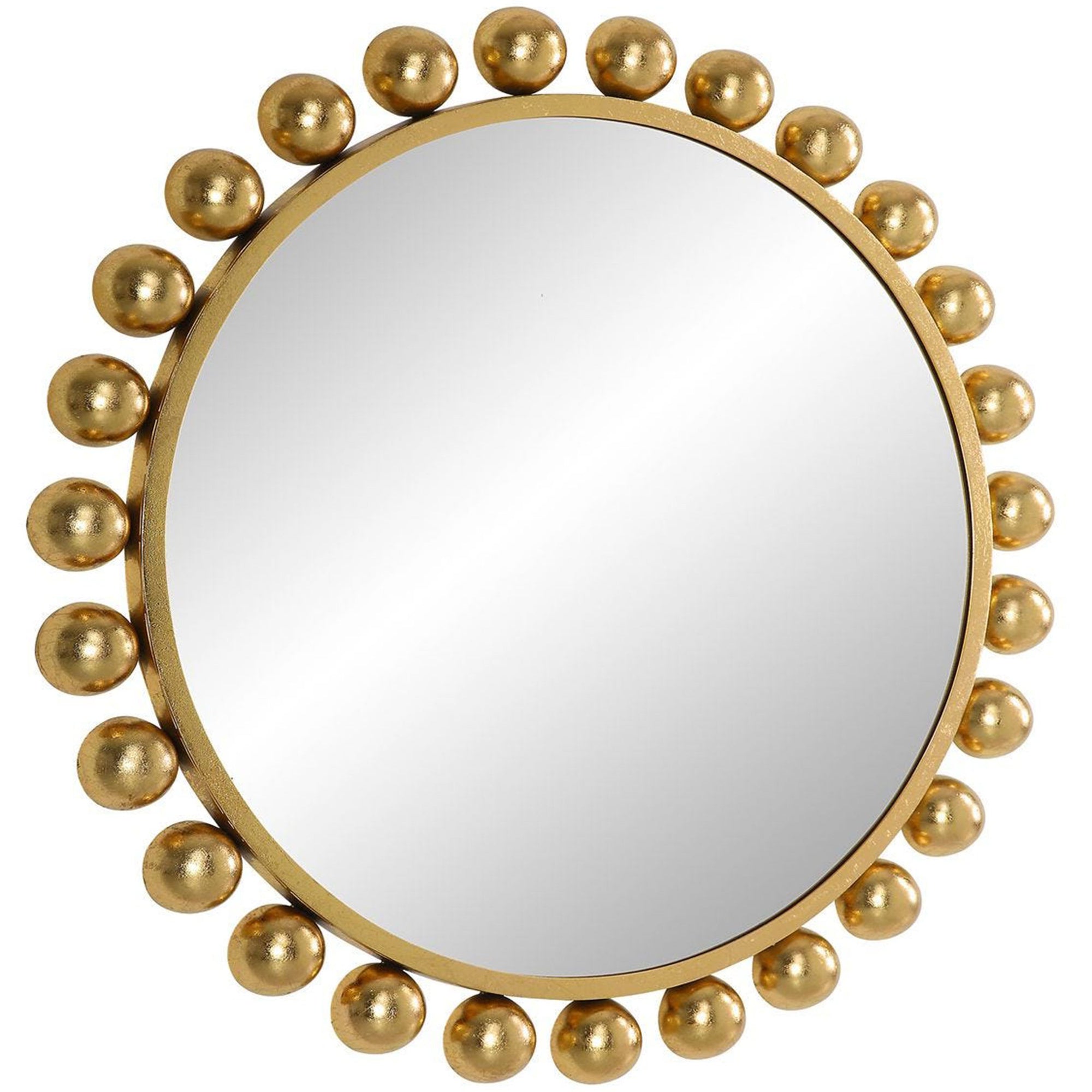 The Capri Mirror is a 34" round metal mirror featuring a unique "frame within a frame" design with 2.5" hemispherical accents. The sleek inner frame focuses attention on the dome-shaped ornaments. Finished in rich gold foil, this mirror makes a striking focal point in any room. May be hung either vertically or horizontally.