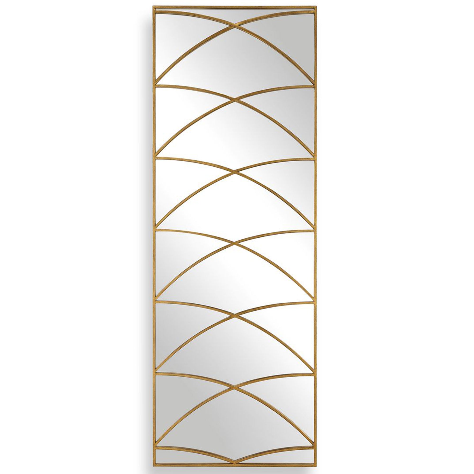The Crossed Up Mirror boasts an elegant antique gold iron frame and a striking geometric overlay. This decorative design creates a series of stylized arches and intersections, forming a captivating pattern that lends a sophisticated, architectural feel to any interior. Standing seventy inches tall, this full-length mirror not only serves a functional purpose but also acts as a stunning piece of wall art, perfect for adding depth and light to hallways, bedrooms, or living spaces.