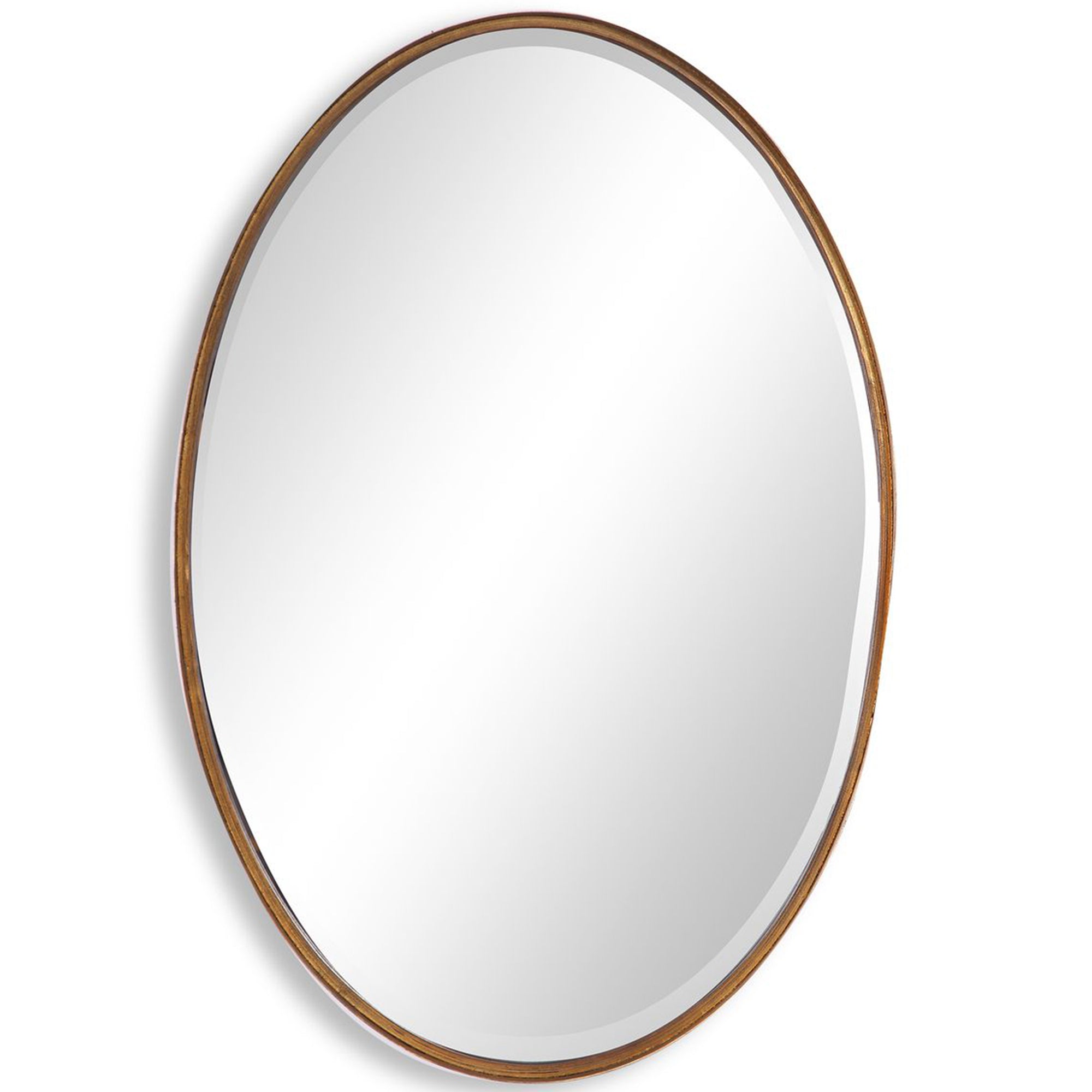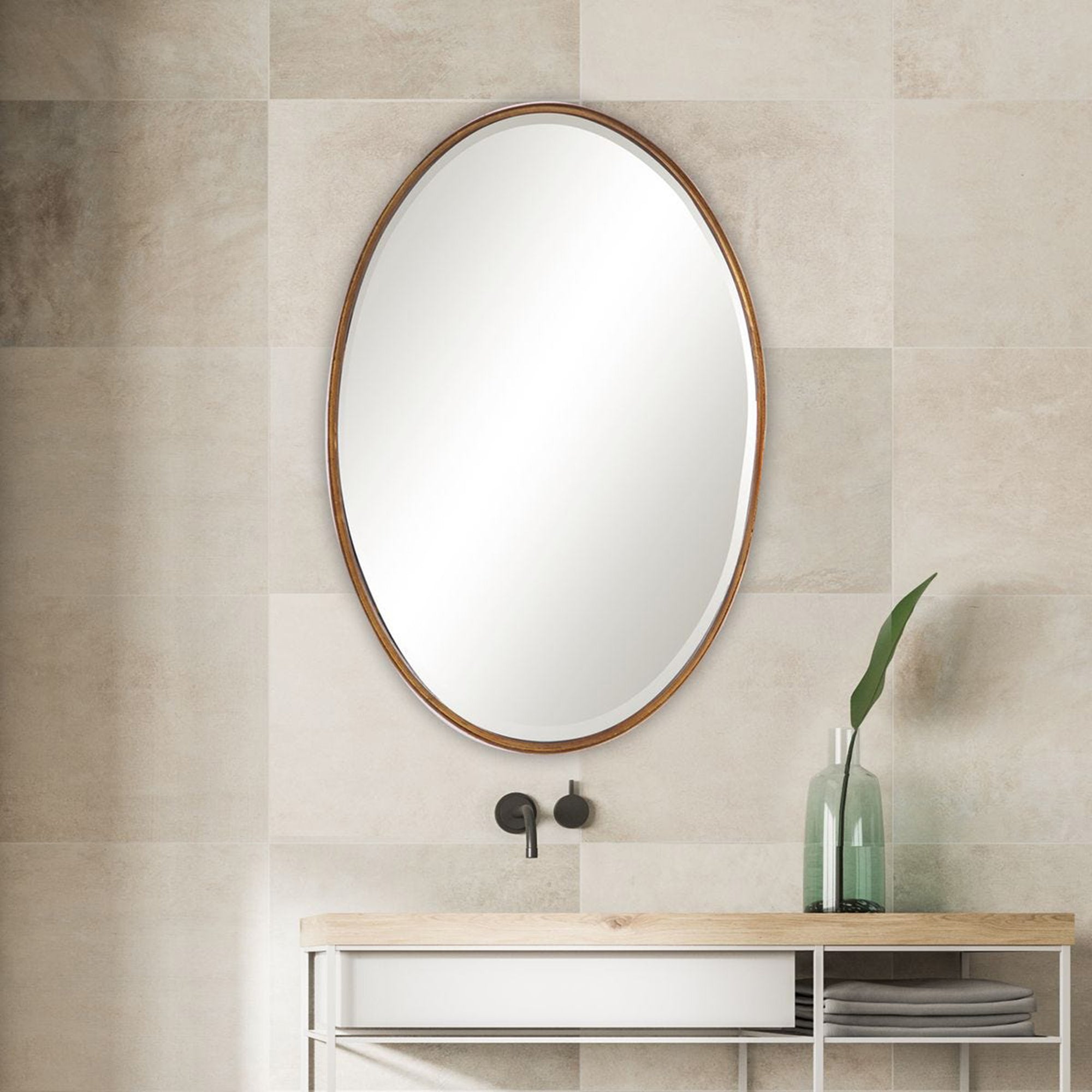 The Daxton Mirror features an oval frame with a wide metal band that adds depth and dimension. Its gold leaf finish enhances the profile, and it can be hung vertically or horizontally, making it ideal for entryways, bedrooms, or living spaces.