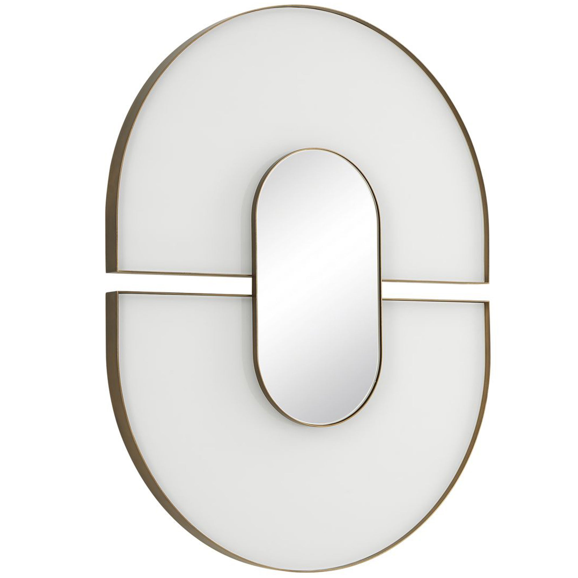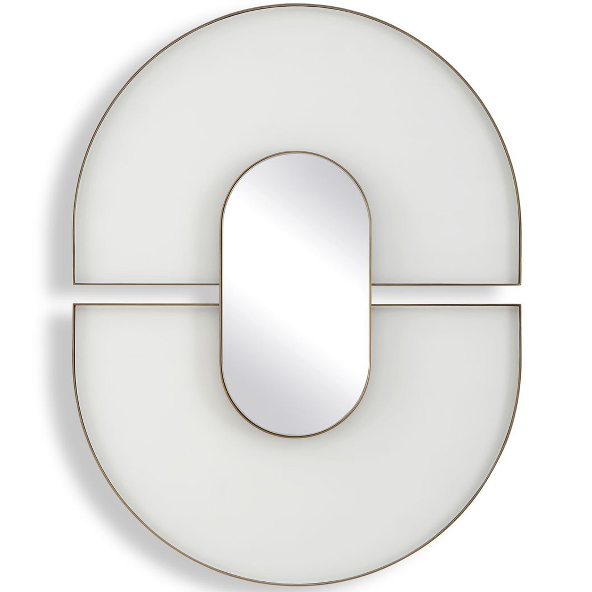 The Encase Oval Mirror makes a bold, artful statement with its layered, sculptural design. Two semicircular panels of white glass, each framed in refined antique gold iron, create a luminous halo around the raised center mirror. The interplay of depth, shape, and contrast adds dimension while elevating any wall with modern elegance. Sophisticated yet versatile, this mirror serves as both a functional accent and a captivating focal point—perfect for entryways, bedrooms, or living spaces seeking a touch of understated luxury.
