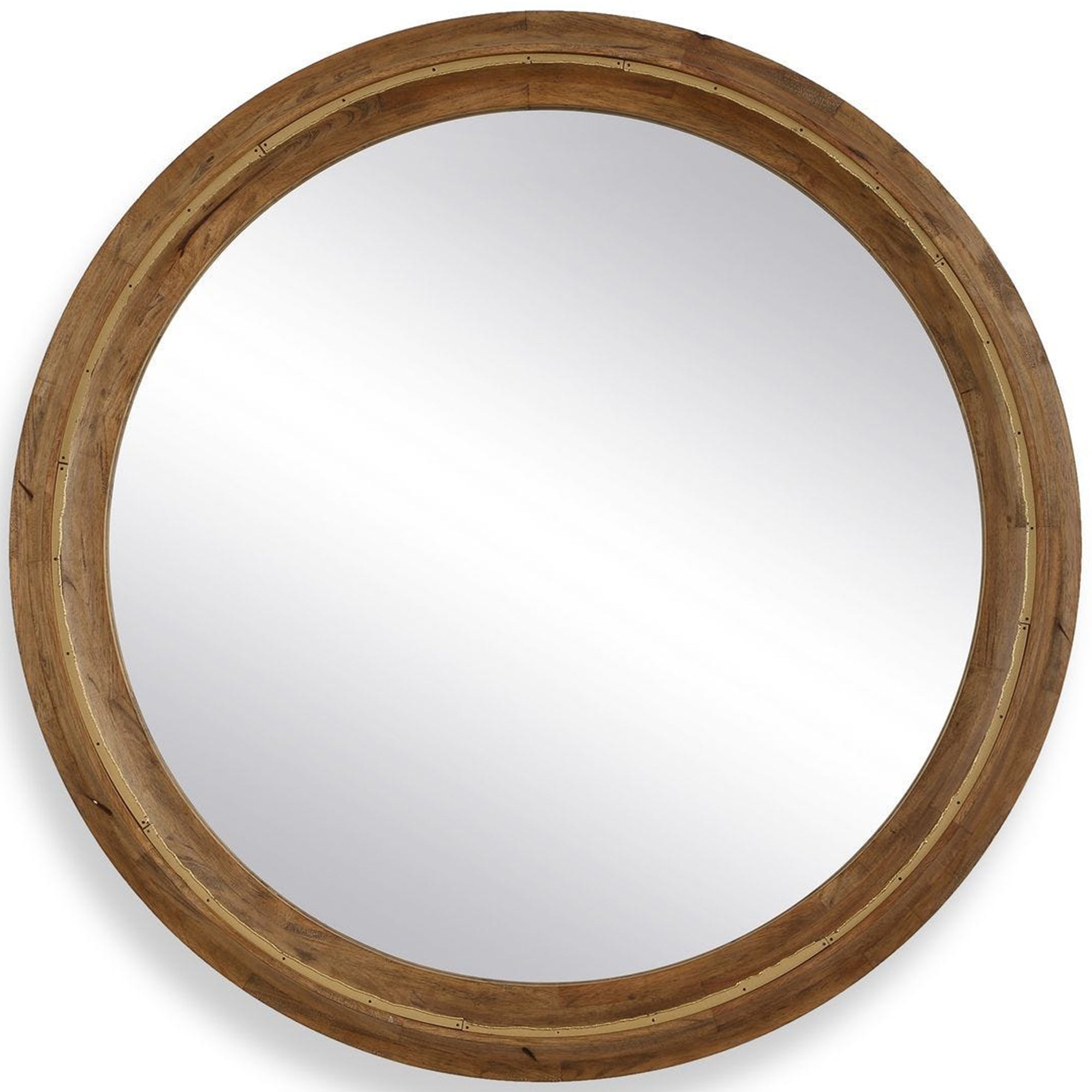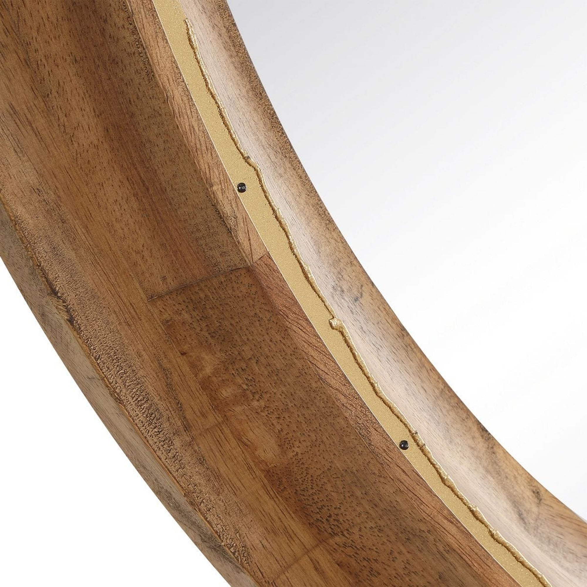 The Frontier Round Mirror features a substantial solid wood frame finished in a warm, light honey stain. This rustic yet refined piece is accented with an interior antique gold iron ring, featuring a welded rough edge that provides a subtle industrial flair. Its large forty-five-inch diameter and deep three-inch profile make it a commanding focal point for a living room, entryway, or bedroom. The combination of natural wood grain and metallic detailing ensures this mirror complements a wide range of interior styles from modern farmhouse to industrial chic.