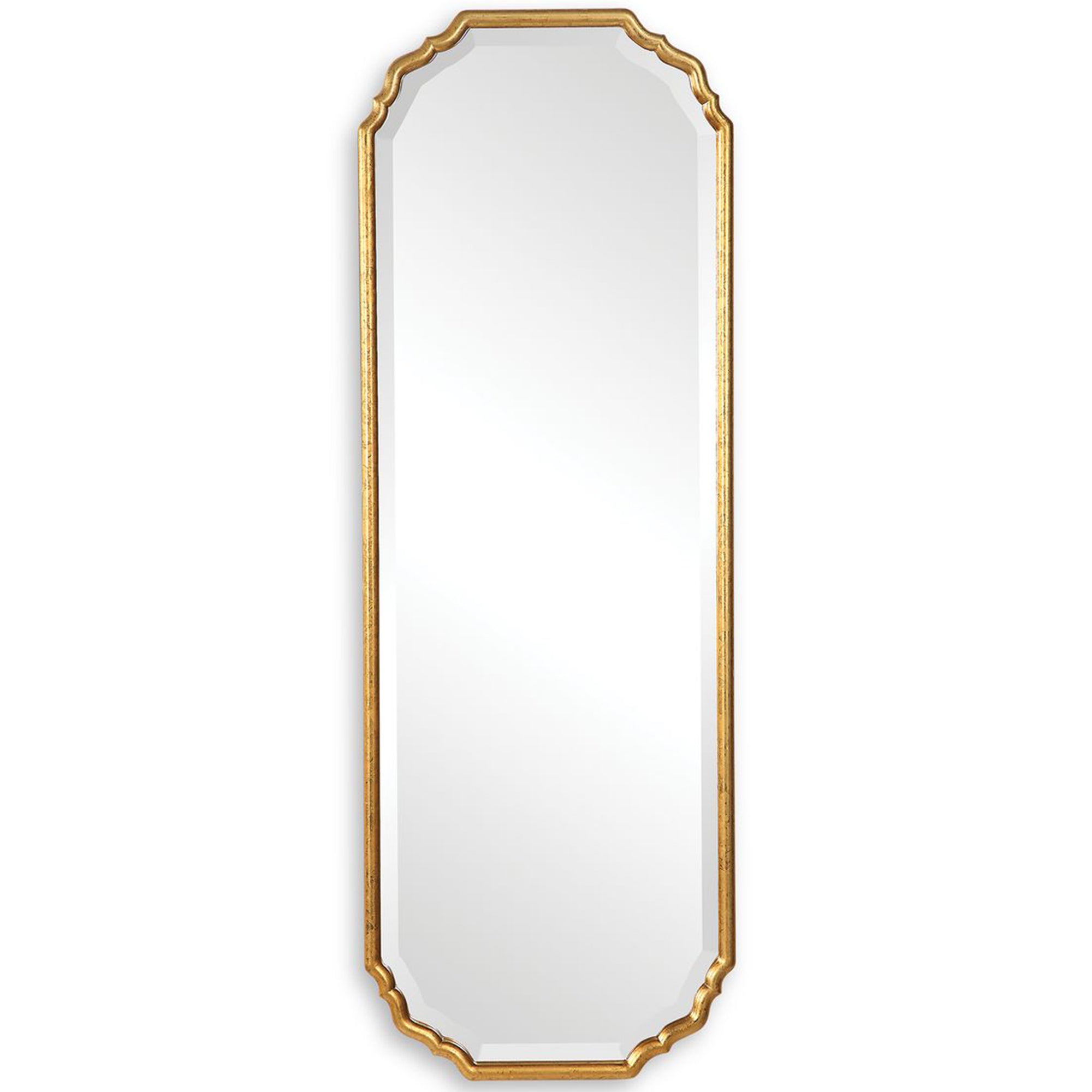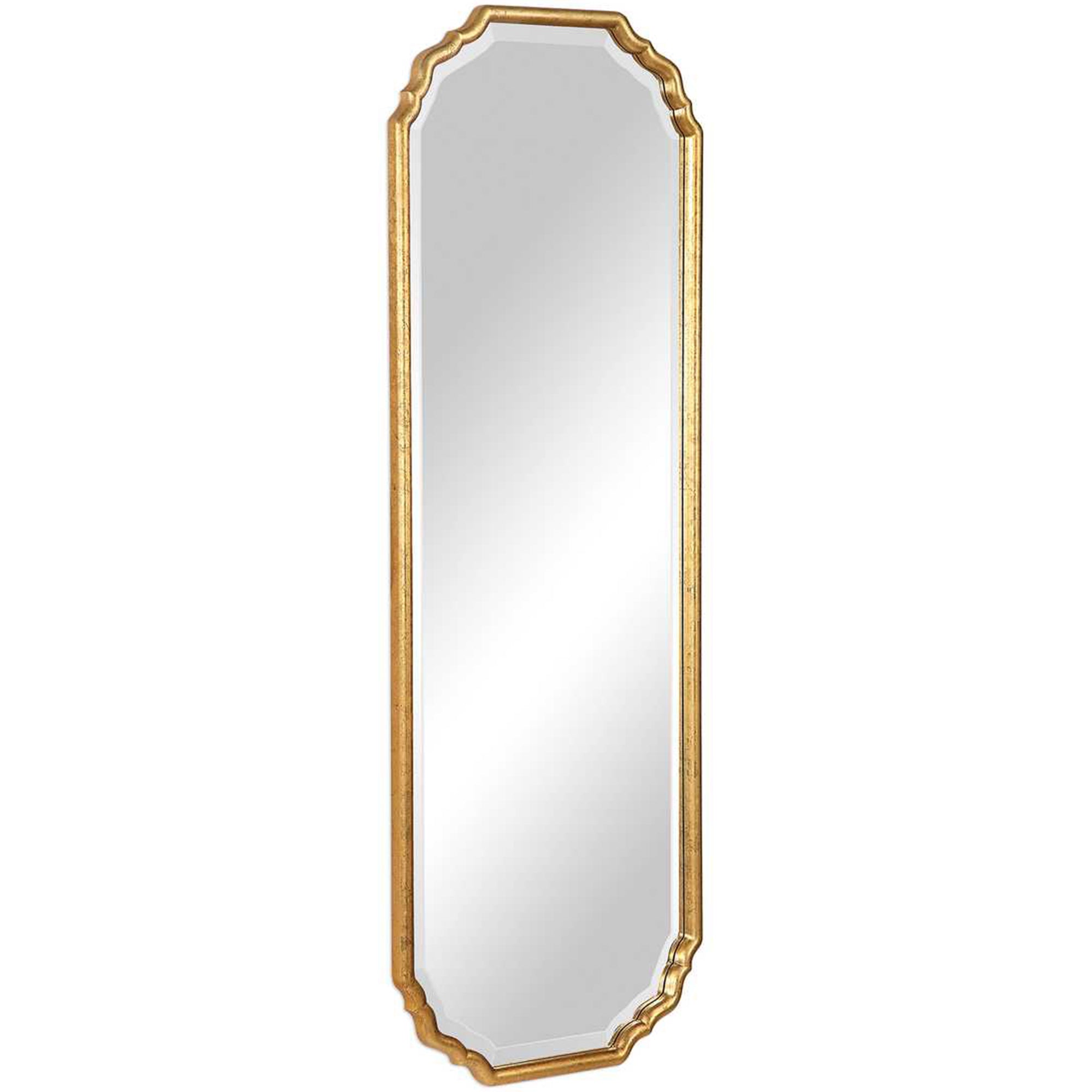 The Greyson Mirror features a tall rectangular frame with elegant curved corners, finished in a lightly antiqued metallic gold leaf. The mirror includes a generous 1.25" bevel, adding depth and sophistication. Ideal for foyers, bathrooms, or any space where a statement piece is desired. Can be hung either vertically or horizontally.