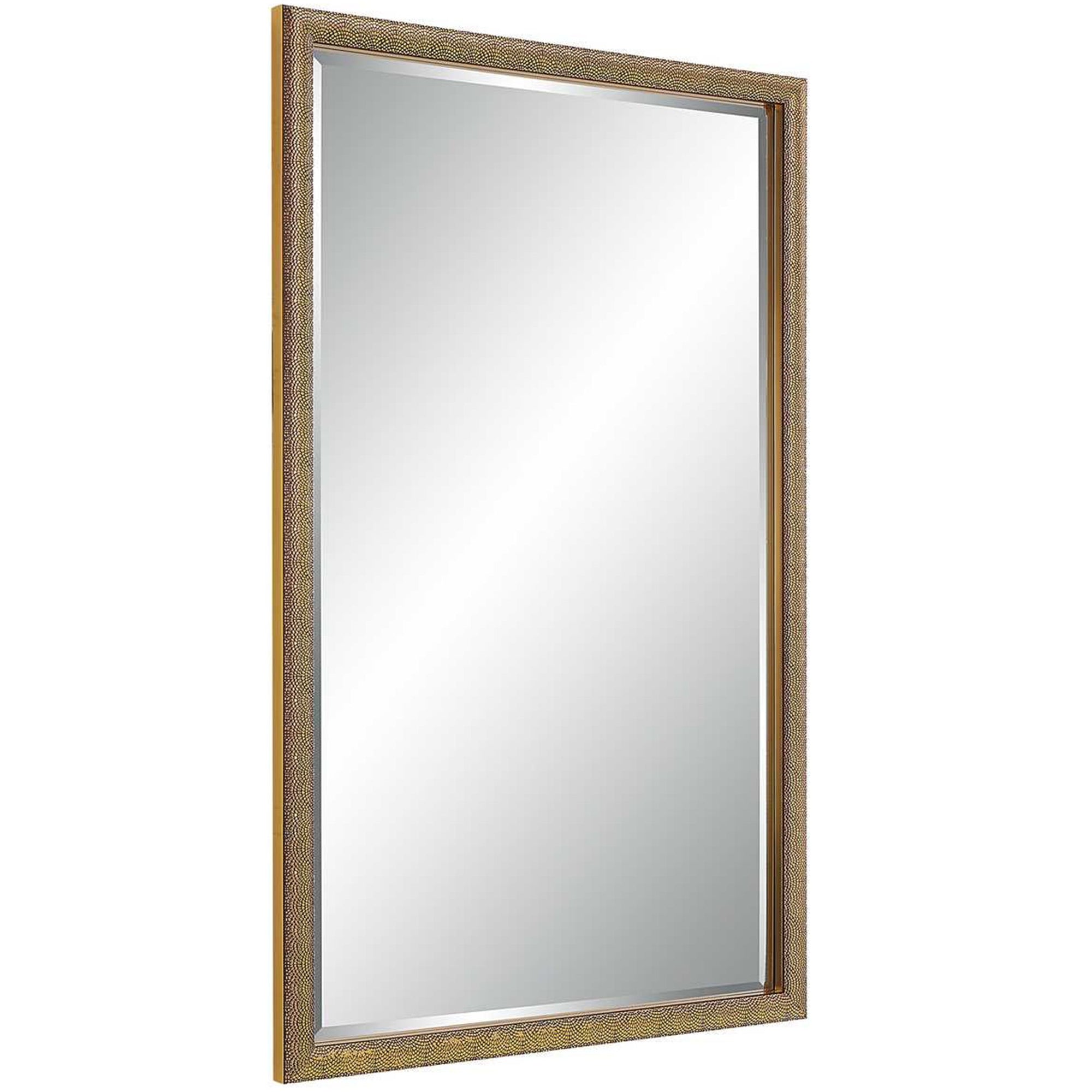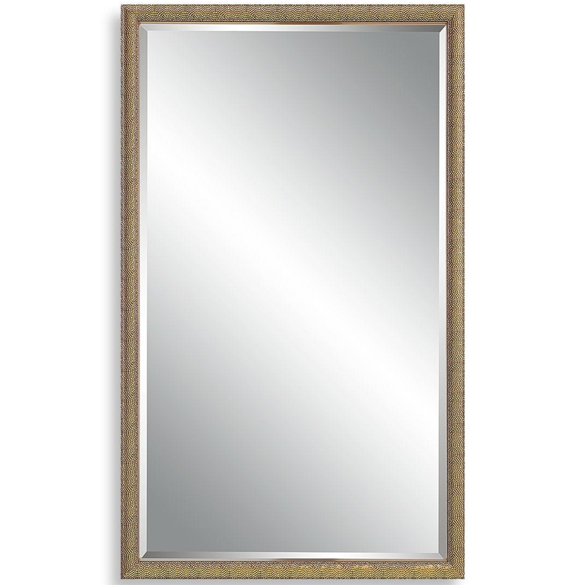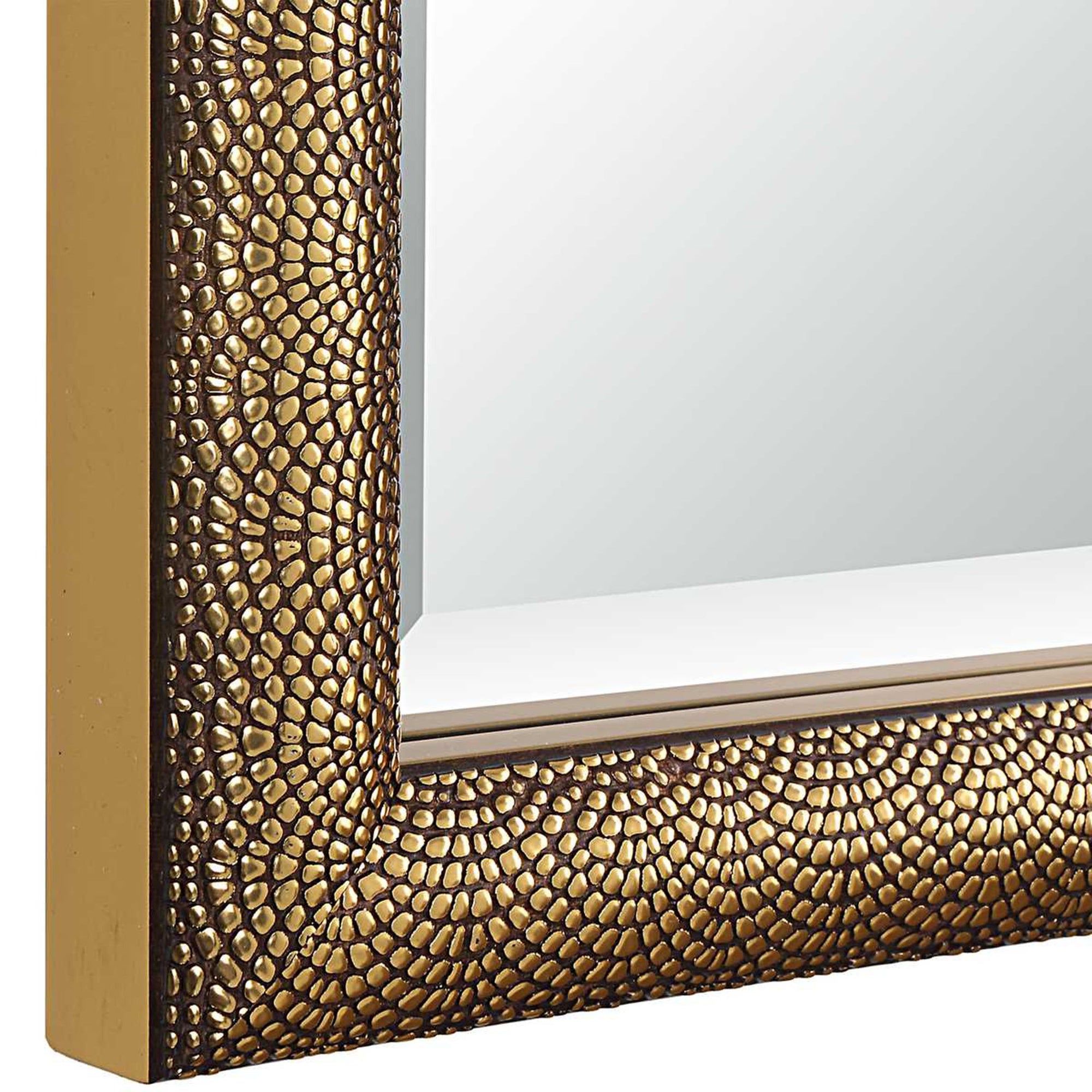 The Jake Mirror features a heavily textured frame with gold accents on a dark brown background. Its 1" beveled mirror can be hung vertically or horizontally, adding a bold and elegant accent to any entryway, bedroom, or living area.