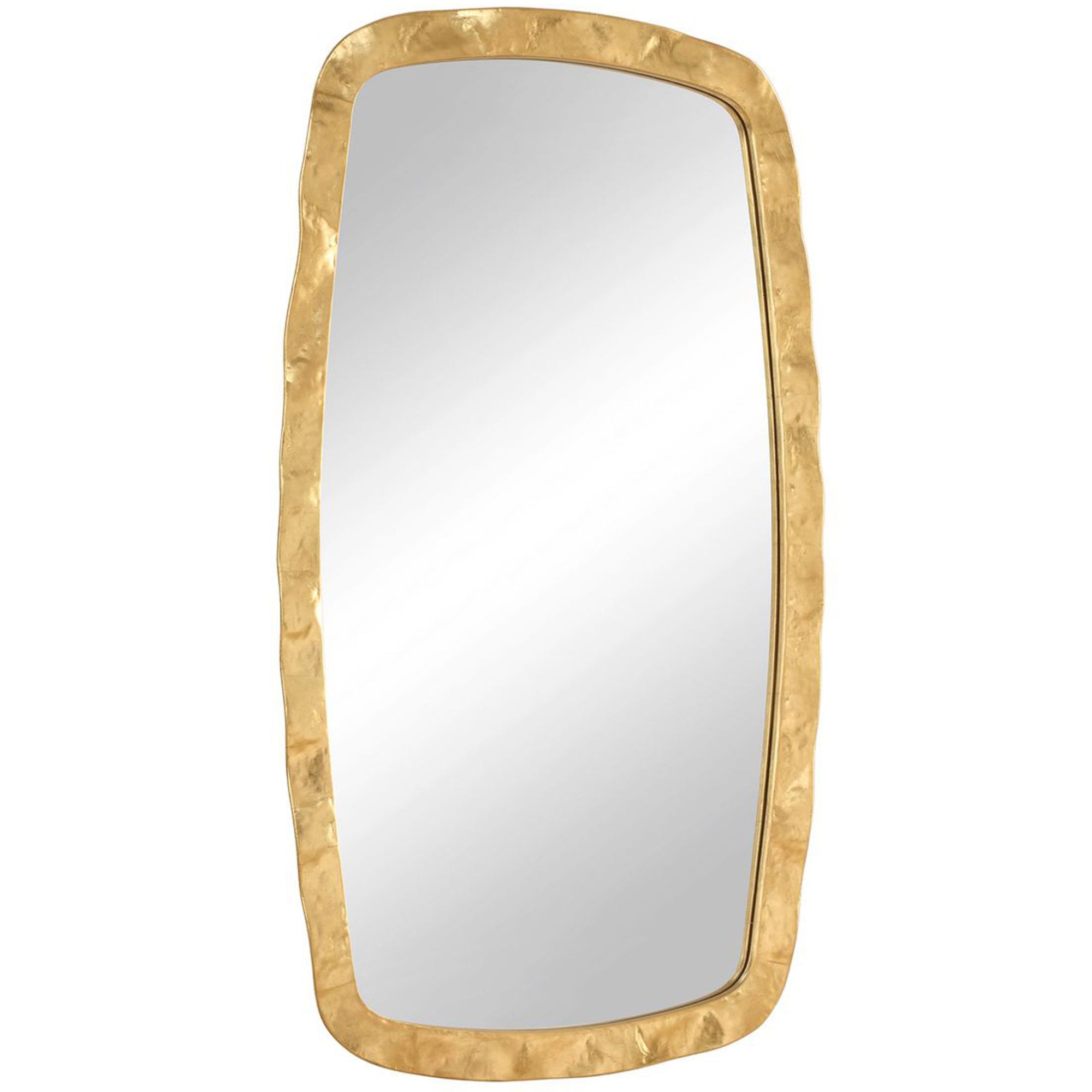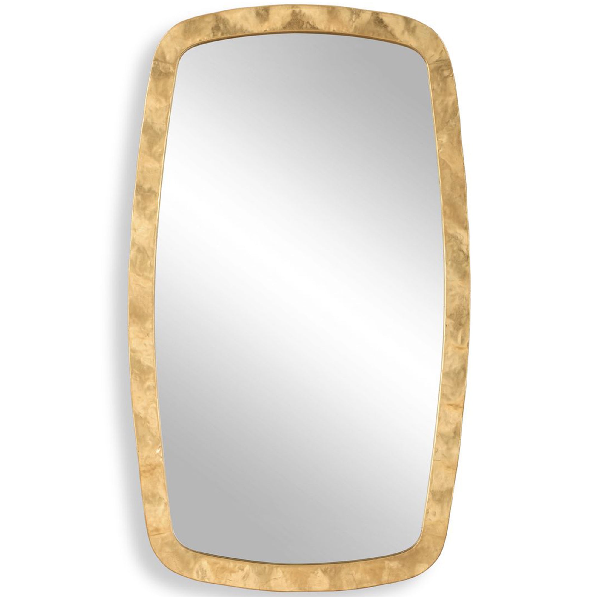 The Julius Mirror showcases an elegant iron frame finished in luxurious gold leaf. Its rounded corners and flowing wave details add organic interest, while the gently curving sides create a unique, sculptural look. Perfect for a foyer, powder room, or over a vanity. May be hung vertically or horizontally.