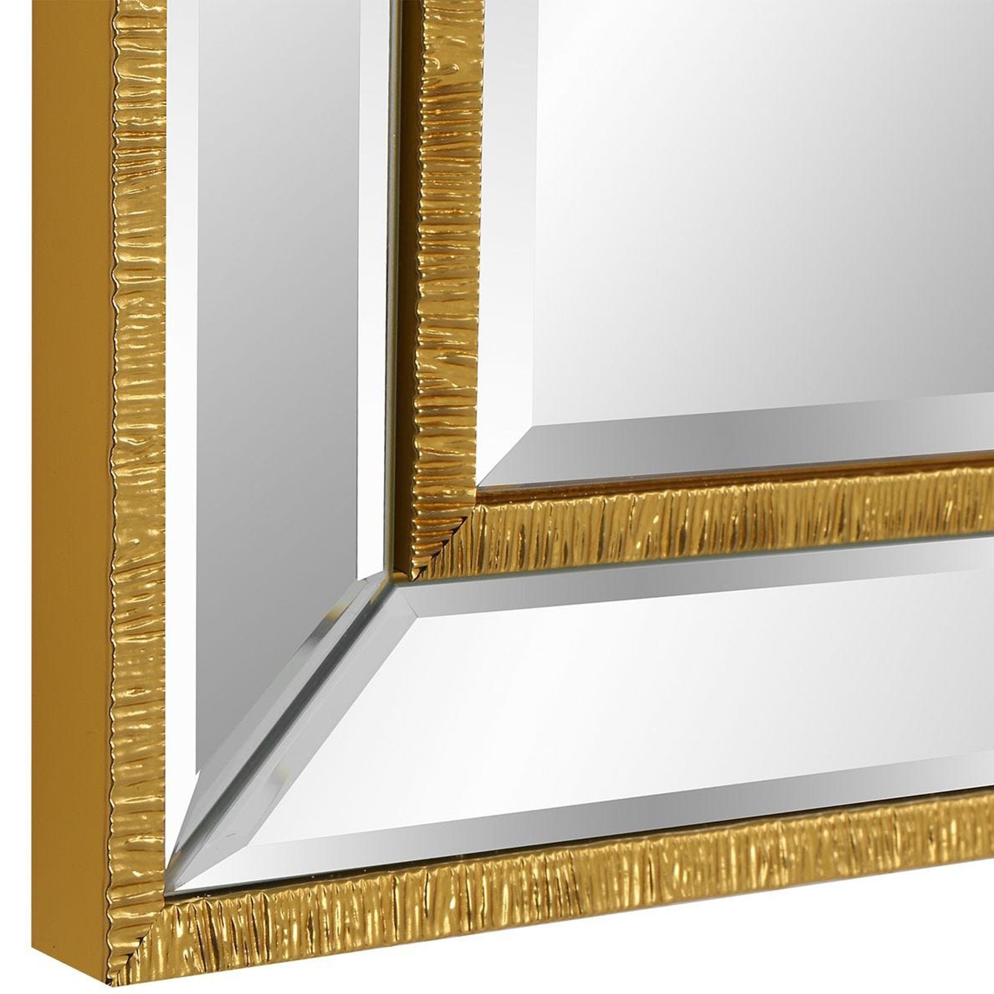 The Leona Mirror brings refined elegance to any space with its beautifully beveled mirror panels and an organically textured gold design that frames the entire piece. The inner mirror includes a 0.75" bevel for added depth and dimension. Versatile and sophisticated, this mirror may be hung either vertically or horizontally, making it a stunning addition to bedrooms, living areas, or entryways.