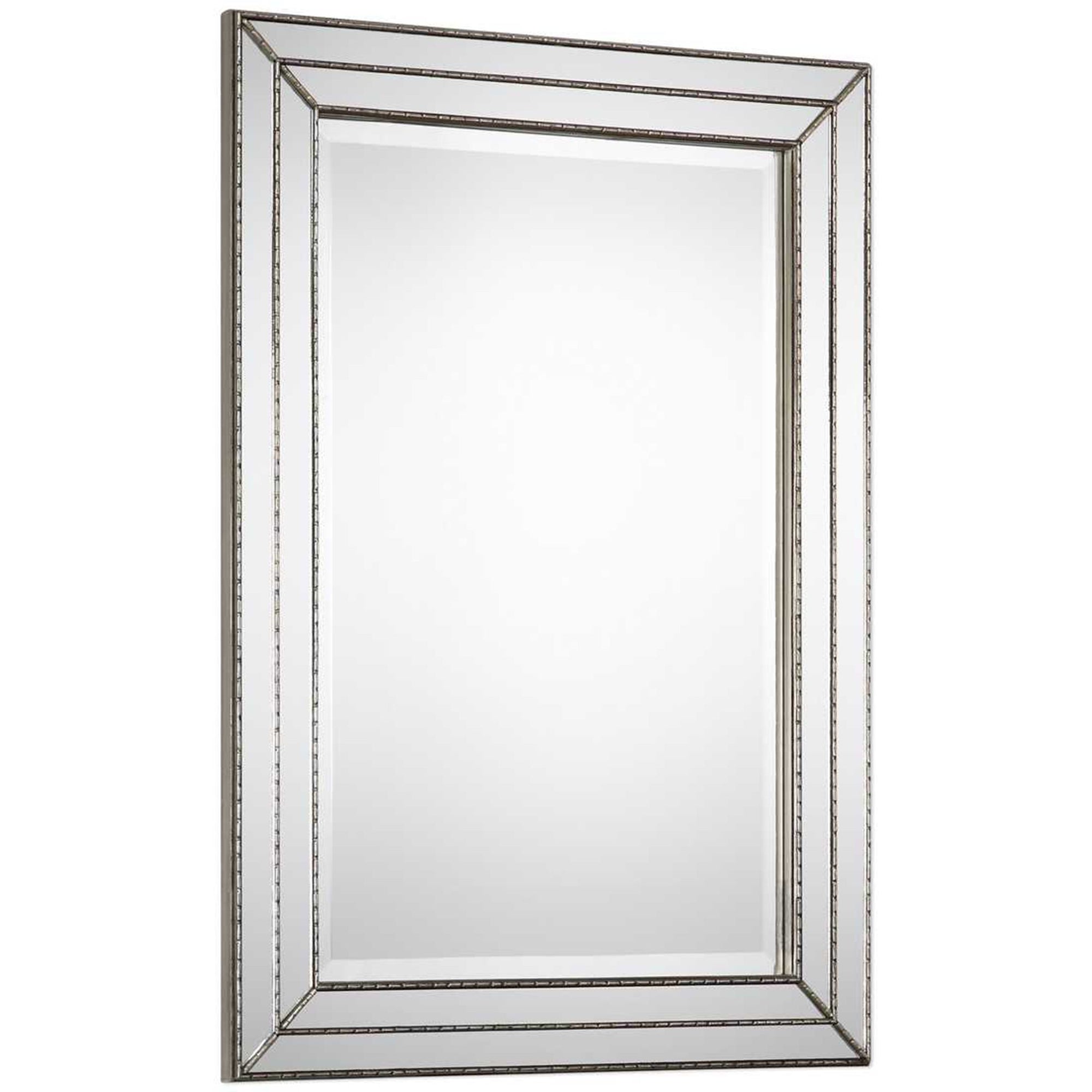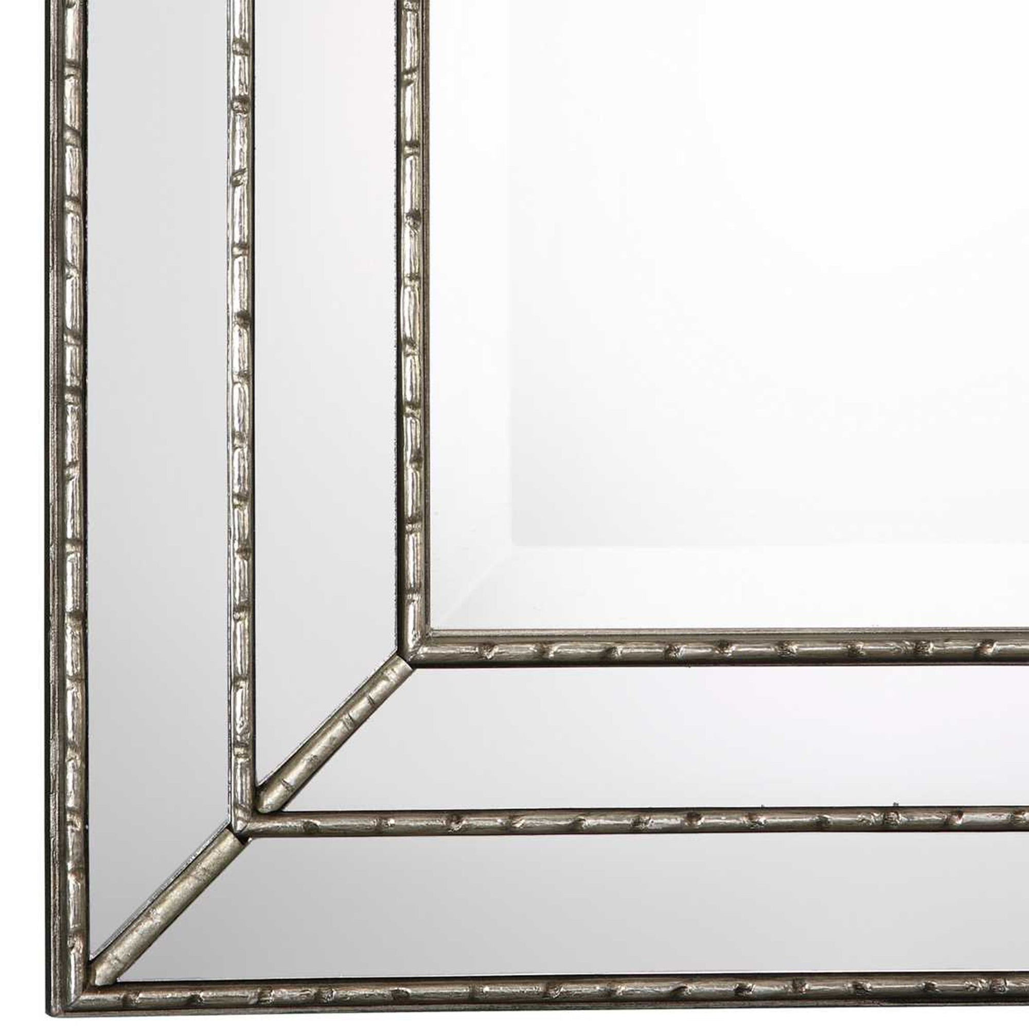 The Martha Mirror features a frame with mirror inlays separated by thin, grooved framing strips, creating a refined, linear design. The center mirror has a 1-inch bevel, and the piece may be hung either vertically or horizontally.